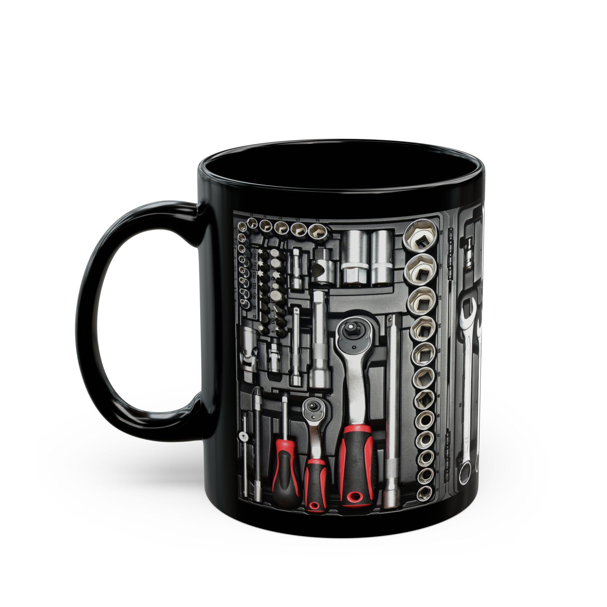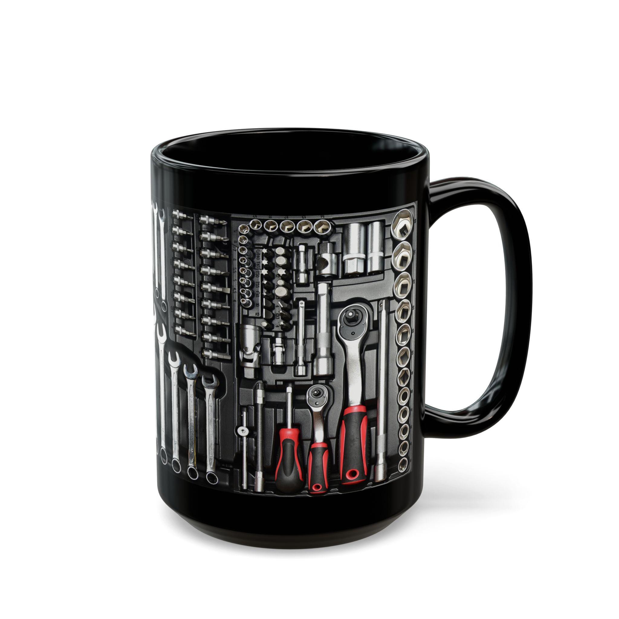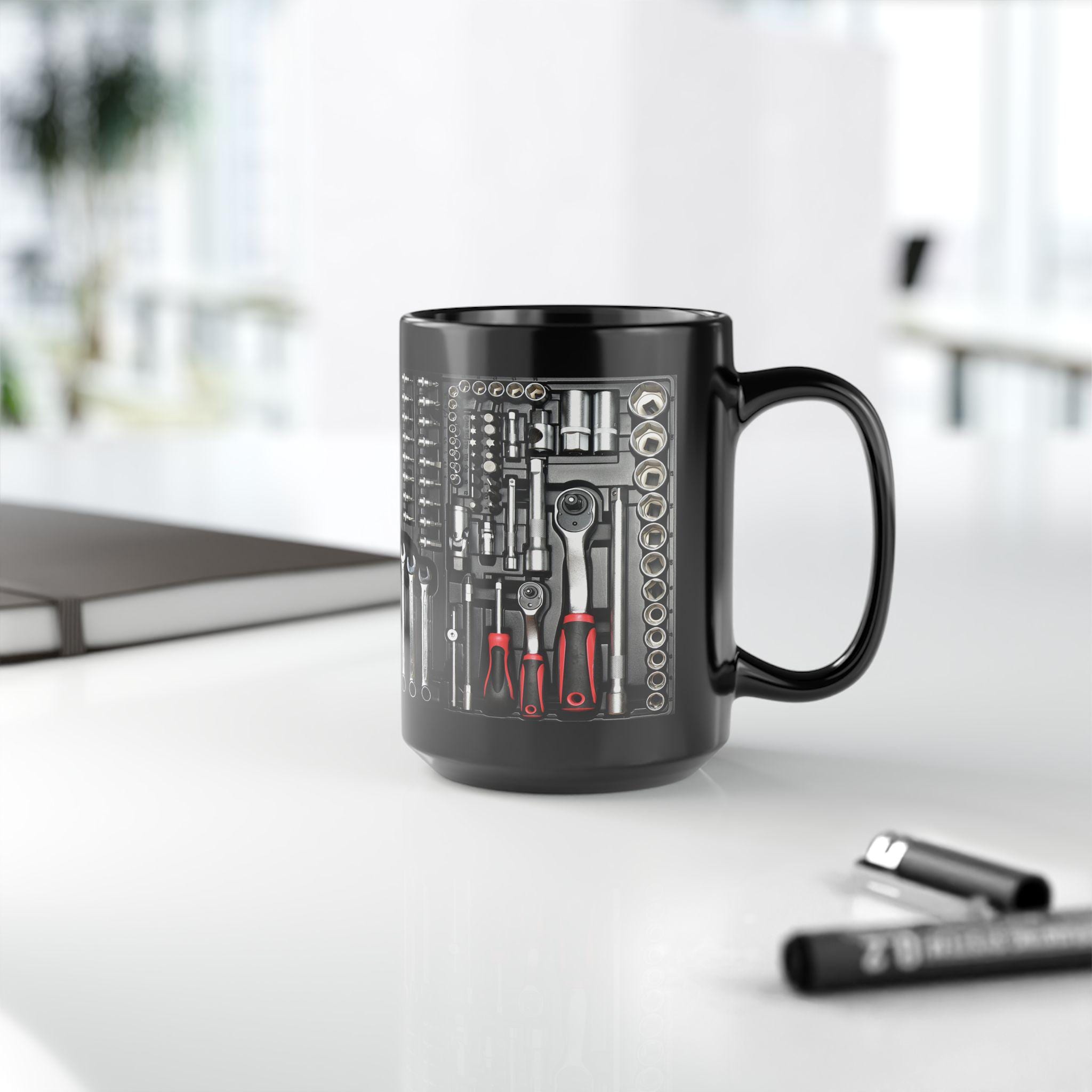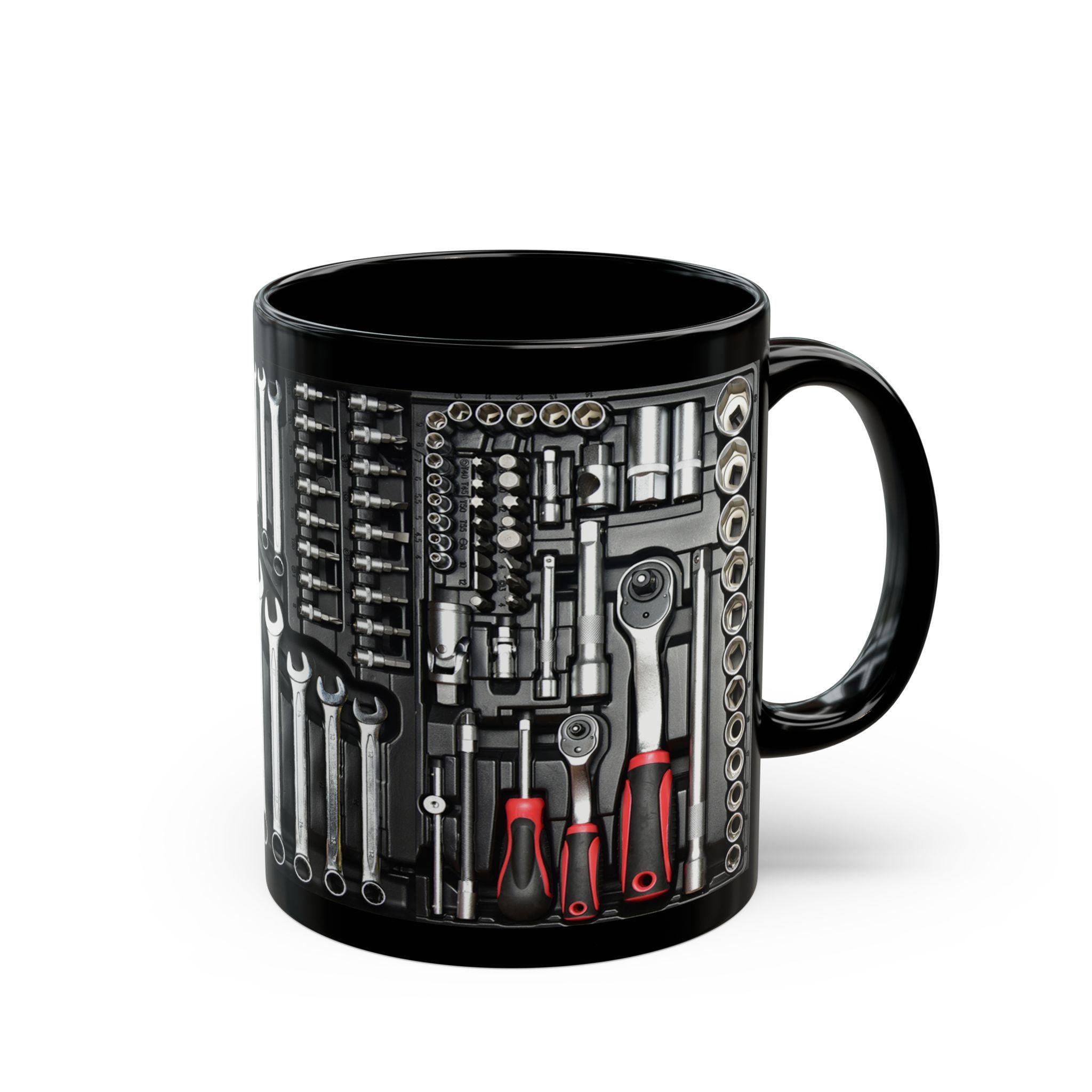 This glossy black ceramic mug showcases a detailed, photo-real toolboard wrap — wrenches, sockets, ratchets and screwdrivers arranged with workshop precision. It feels like a quiet morning in the garage: warm coffee in hand, tools lined up and ready for the day’s project. The dark background makes the metallic finishes pop, while the red-handled tools add an industrial accent that speaks directly to makers and tinkerers. Sturdy C-handle and two size options mean this mug moves from workbench to kitchen without fuss. Dishwasher- and microwave-safe, it keeps colors vibrant through regular use and meets safety standards for everyday drinking.