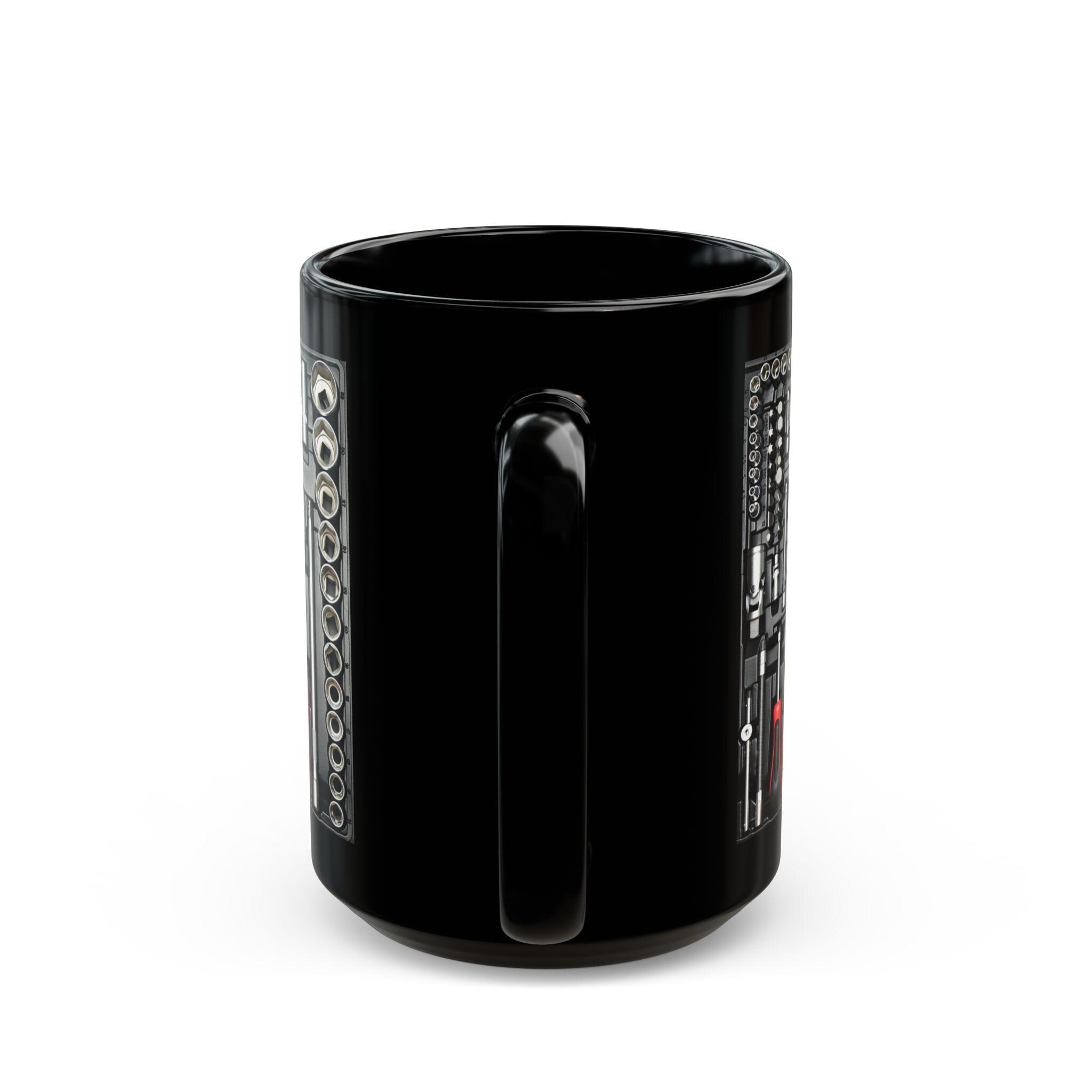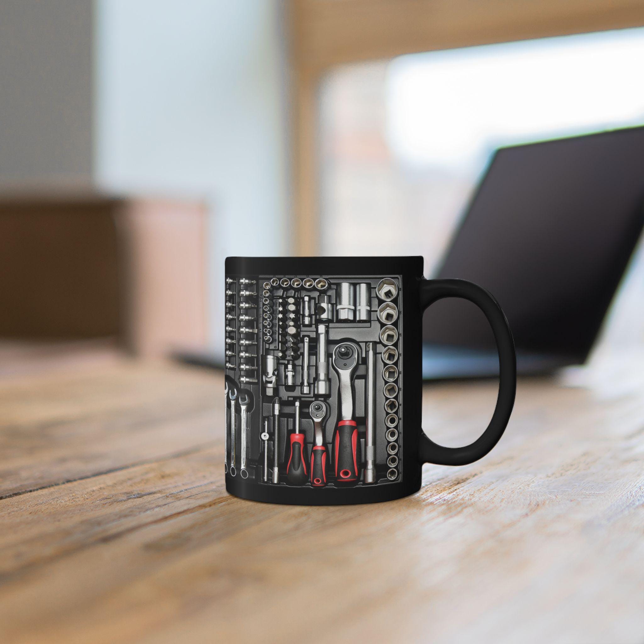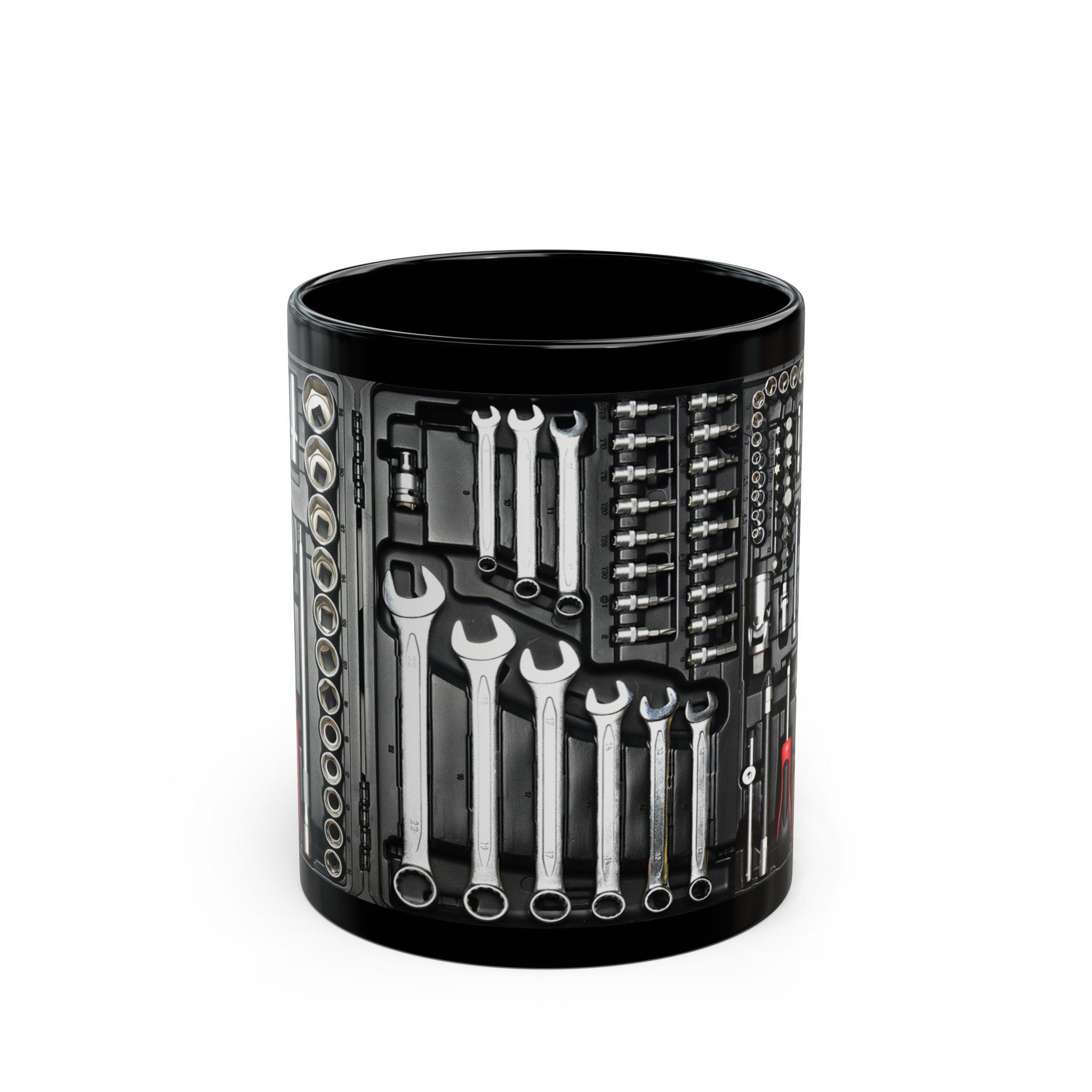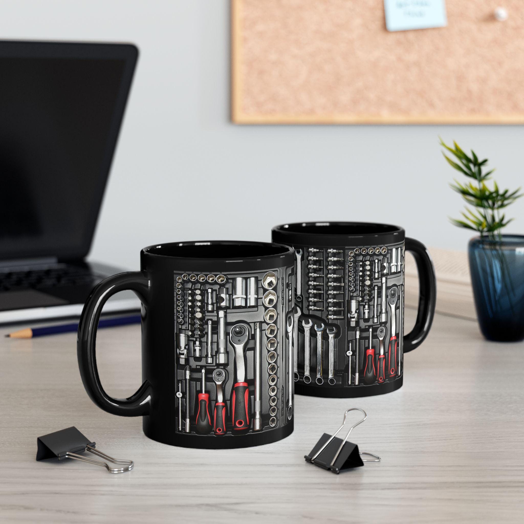 This glossy black ceramic mug showcases a detailed, photo-real toolboard wrap — wrenches, sockets, ratchets and screwdrivers arranged with workshop precision. It feels like a quiet morning in the garage: warm coffee in hand, tools lined up and ready for the day’s project. The dark background makes the metallic finishes pop, while the red-handled tools add an industrial accent that speaks directly to makers and tinkerers. Sturdy C-handle and two size options mean this mug moves from workbench to kitchen without fuss. Dishwasher- and microwave-safe, it keeps colors vibrant through regular use and meets safety standards for everyday drinking.