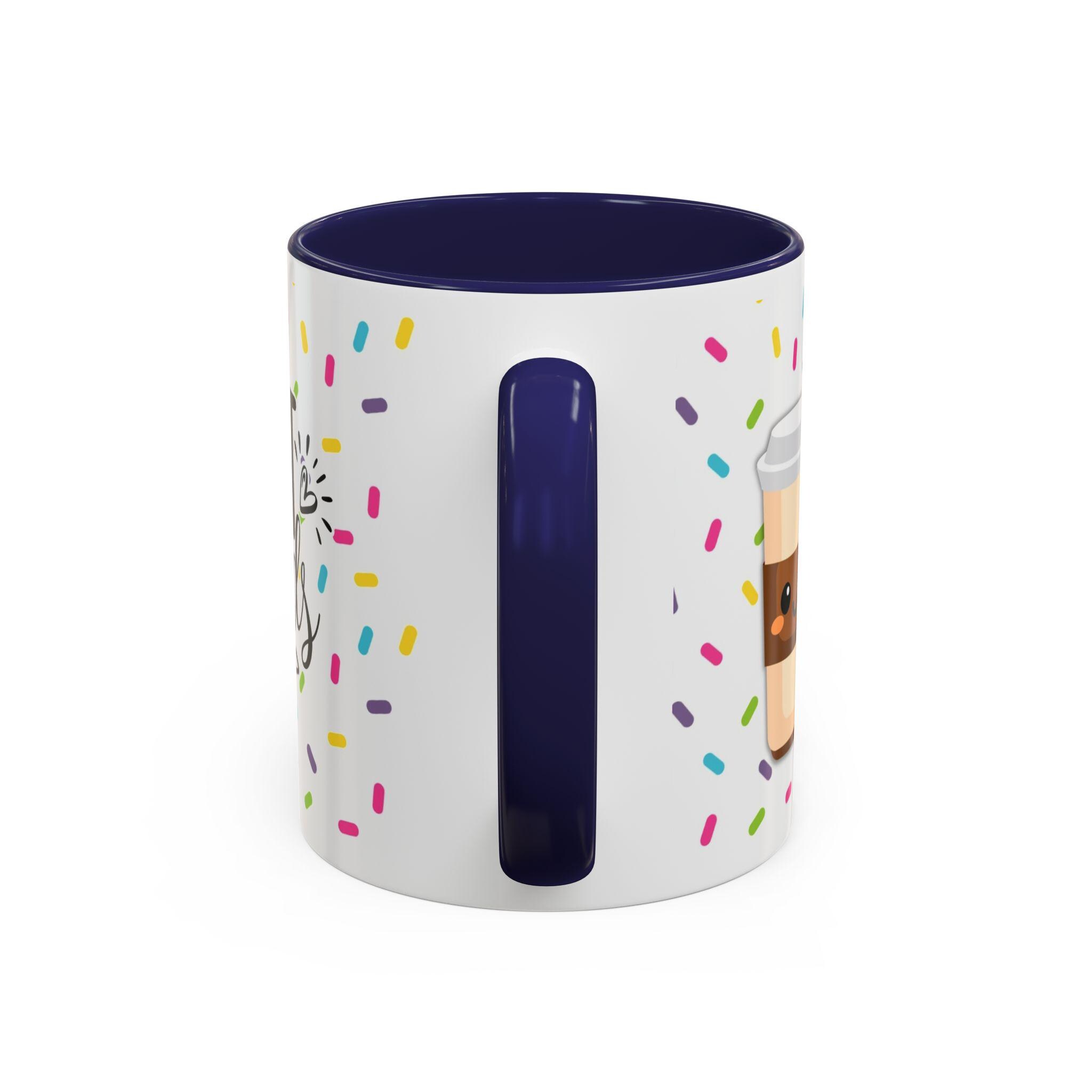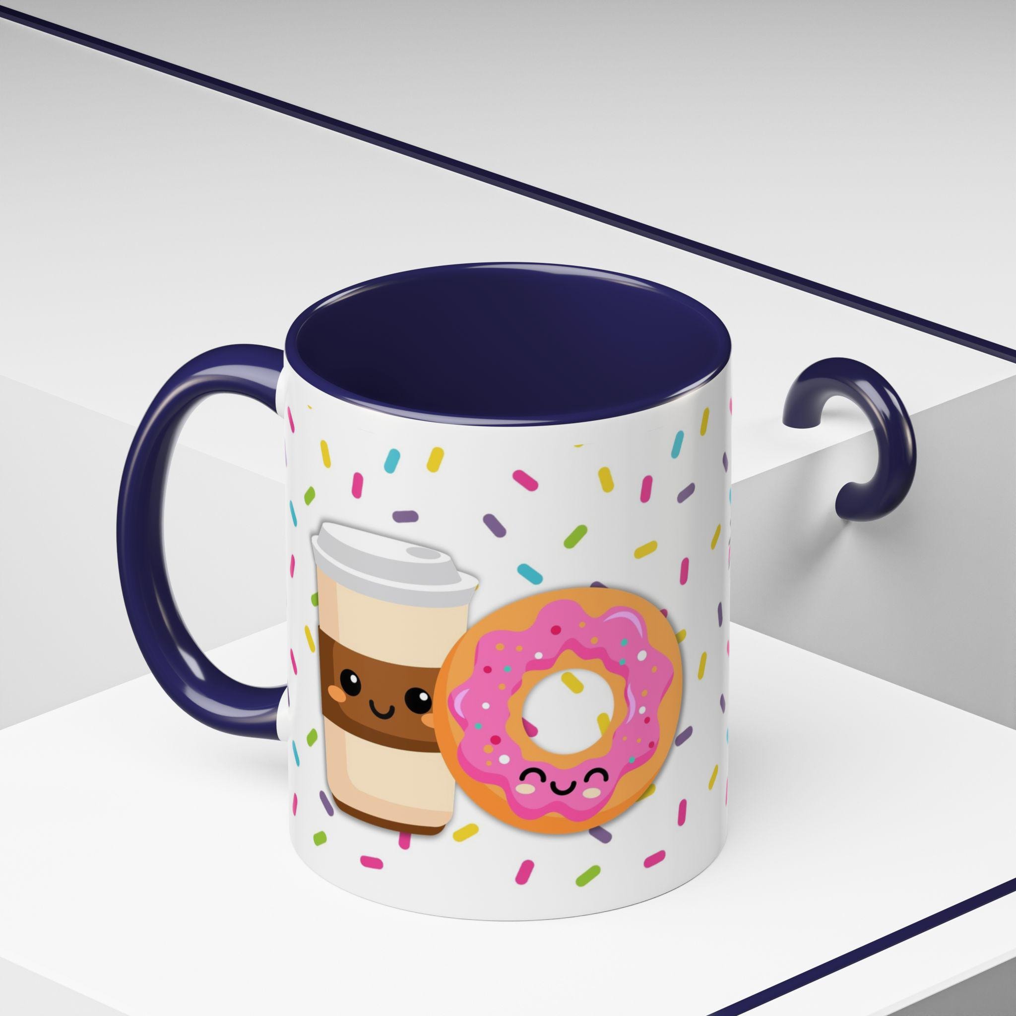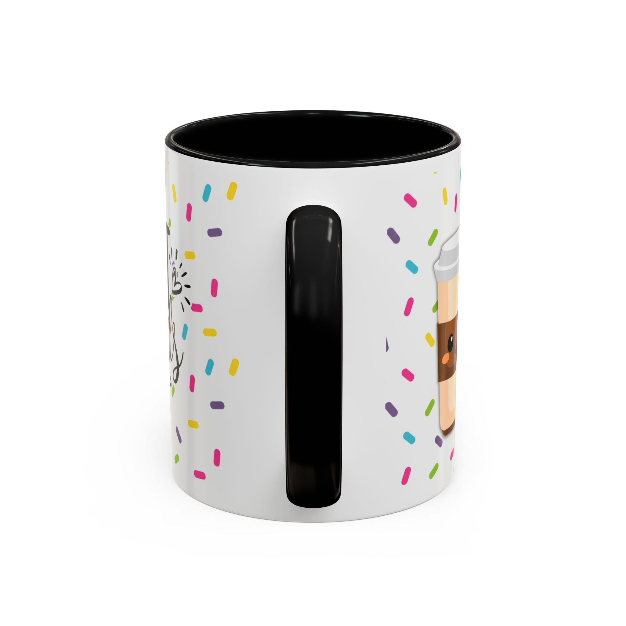 Bright, cheerful ceramic mug that brings a little celebration to everyday coffee and tea. A glossy white exterior is sprinkled with colorful confetti and a playful doughnut illustration, while the contrasting interior and handle add a pop of personality. Warm drinks feel friendlier in this weighty, comfortable C-shaped cup — the kind you reach for when you want to share a smile, swap stories, or toast a small victory. It sits happily on a desk, kitchen shelf, or bedside table, and becomes a quiet reminder of close friendships during slow mornings and late-night chats.