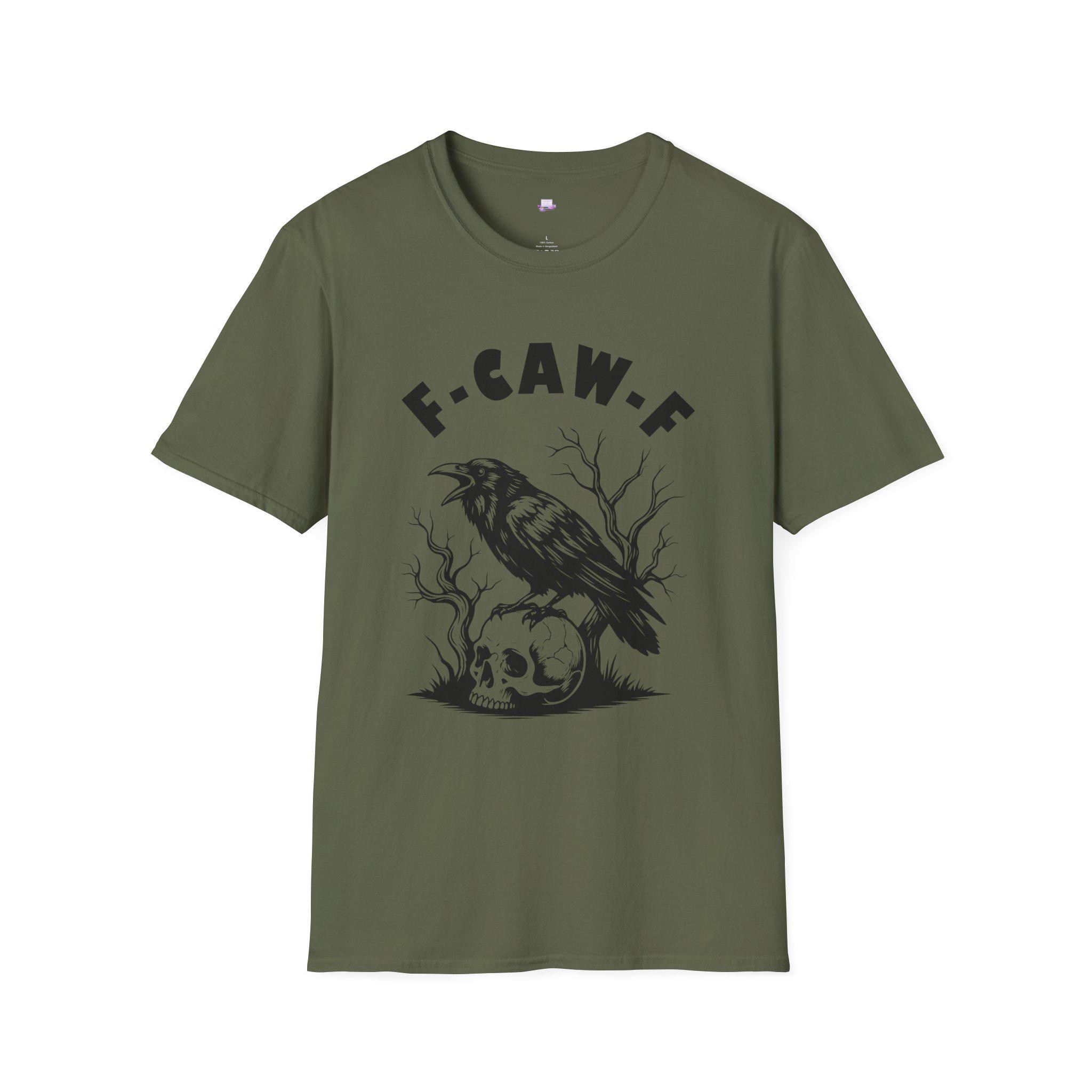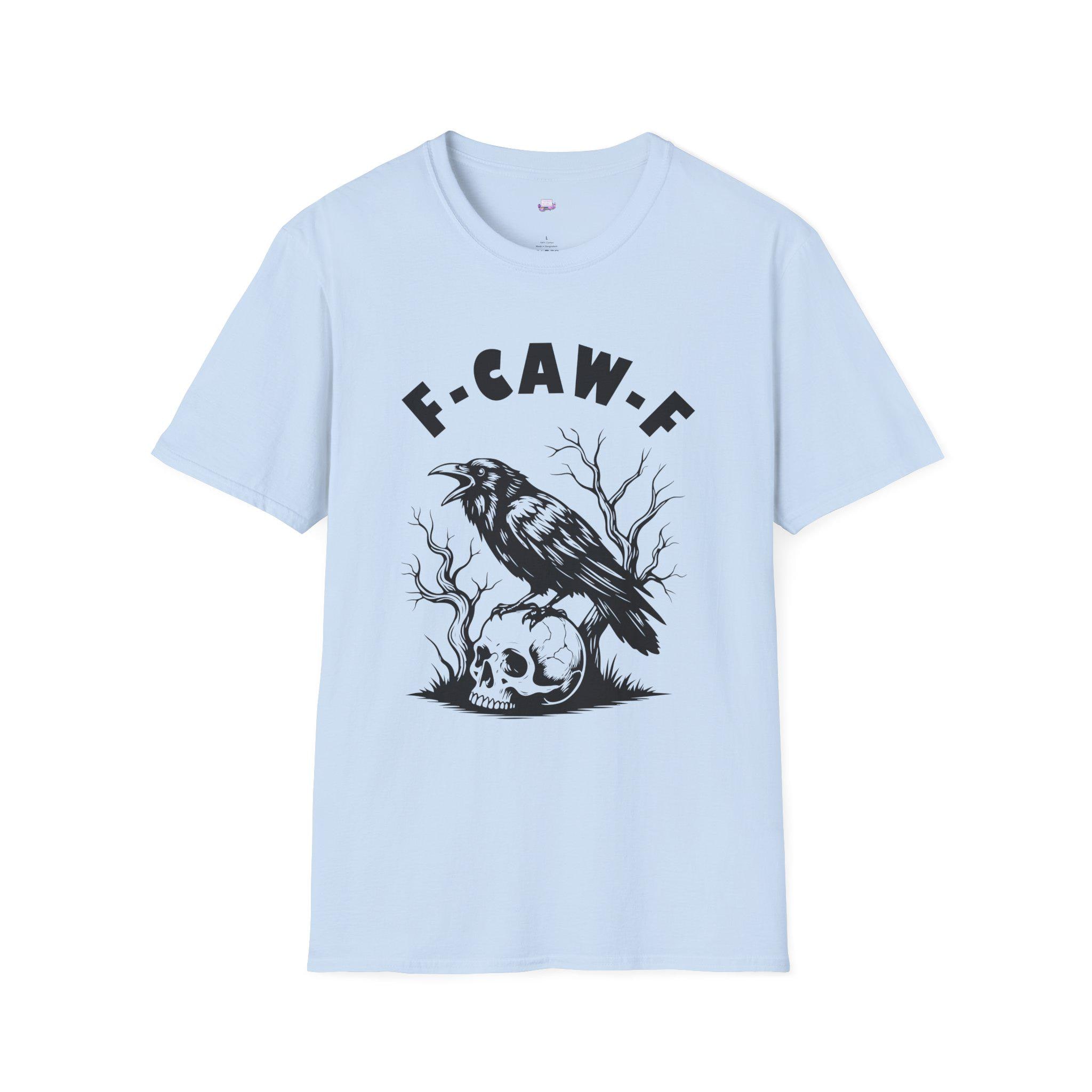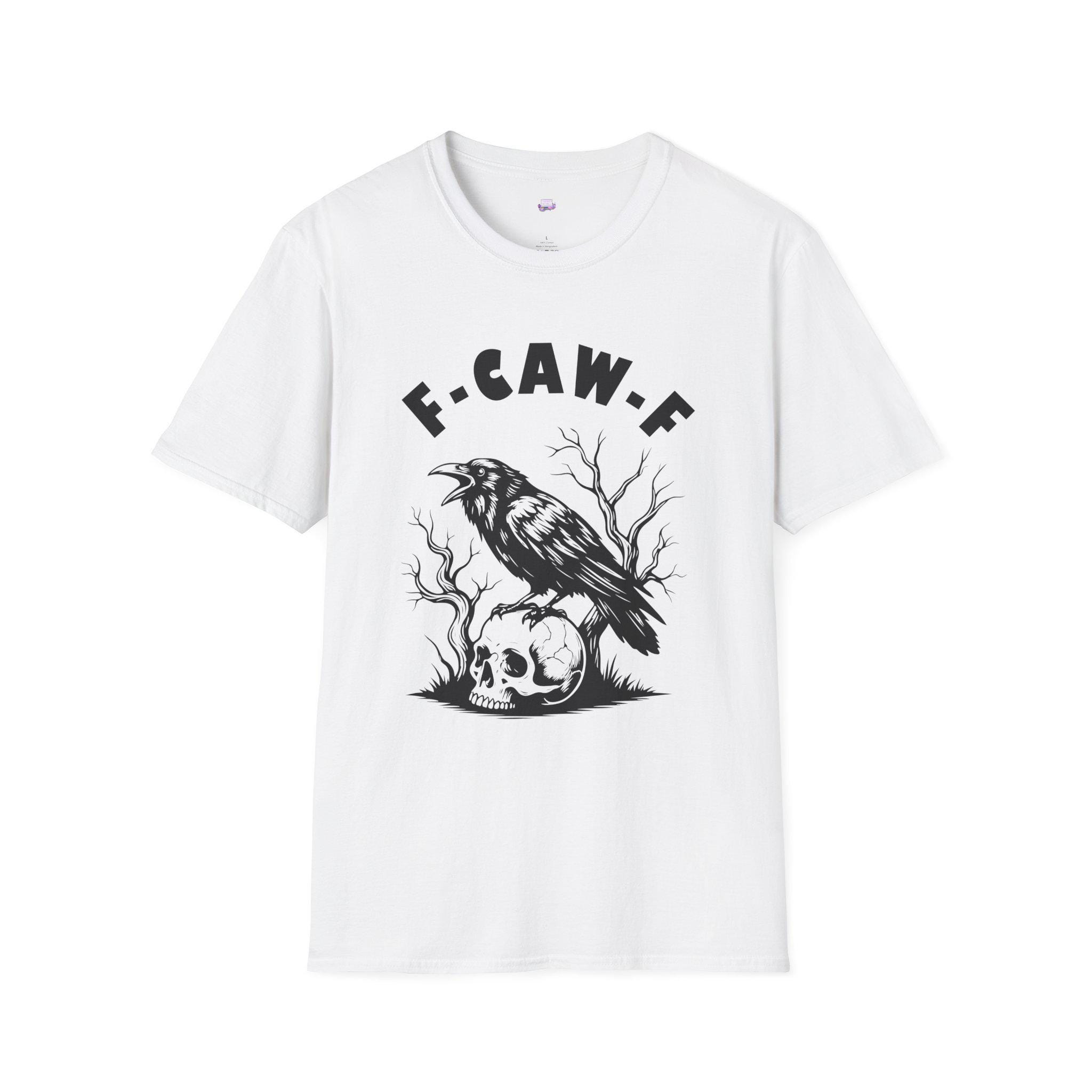 A soft, lightweight tee that wears like a quiet statement. The front shows a stark black illustration of a crow perched on a skull with twisted branches behind it, topped by bold letters reading “F·CAW·F.” The monochrome artwork feels raw and slightly sinister — the kind of piece that slips into late-night walks, dim-lit shows, and conversations that wander into the uncanny. It drapes cleanly at the shoulders and chest, keeping the focus on the art while staying comfortable enough for everyday wear. Wear it with a worn denim jacket, under an oversized flannel, or alone when you want your outfit to speak with a little edge.
