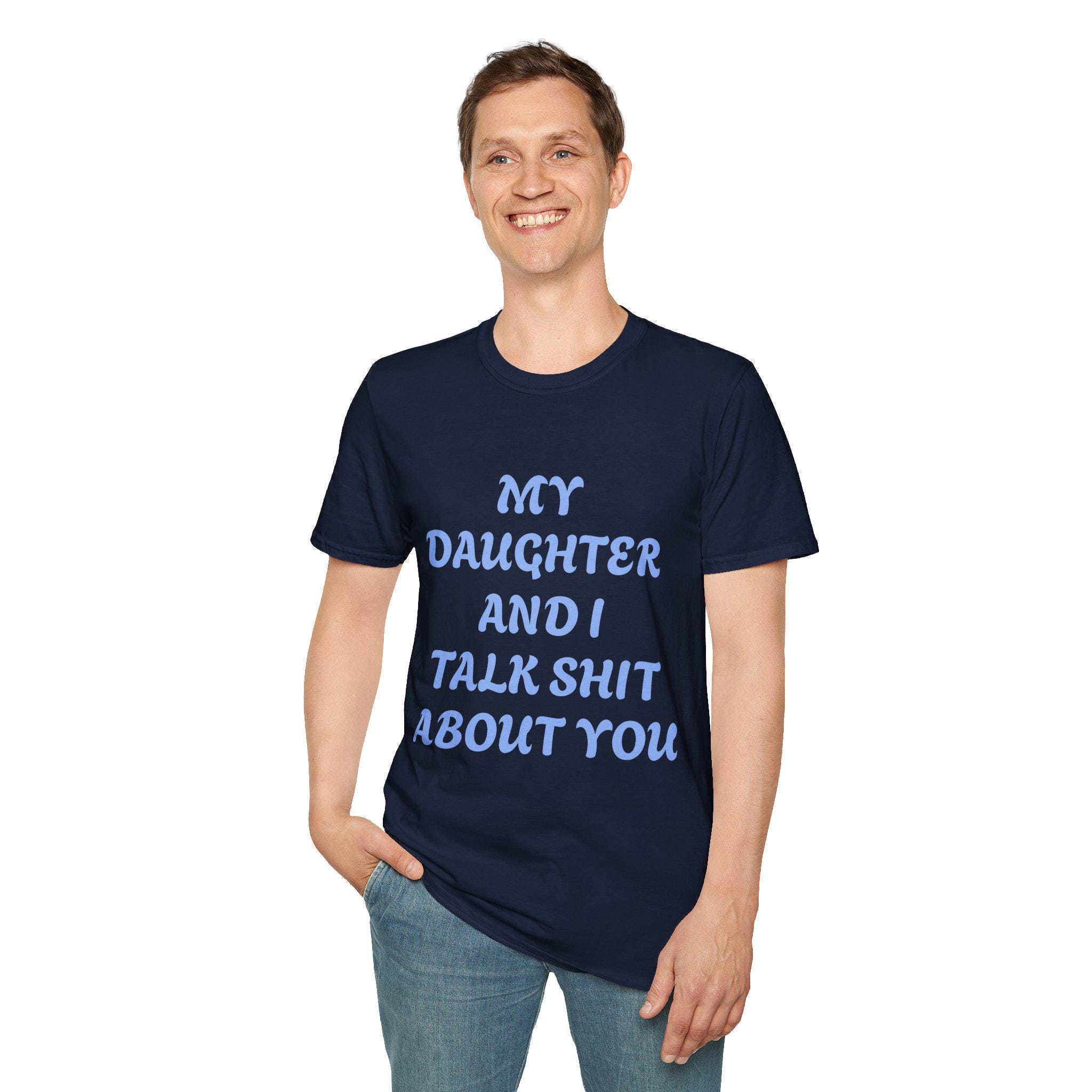 This black crewneck tee carries a cheeky, protective voice: light blue hand-lettered text reads “MY DAUGHTER AND I TALK SHIT ABOUT YOU.” It’s a soft, lightweight shirt with a clean classic fit that sits easily under a jacket or worn solo. The tone is playful and sharp — great for parents who want clothing that says more than a smile. Wear it to casual family gatherings, school pickup lines, weekend errands, or when you want to send a private joke into public. The fabric drapes softly, the ribbed collar keeps its shape, and the tear-away label keeps the back of the neck comfortable all day. Machine-washable, ethically sourced, and printed using long-lasting methods so the message stays bold through regular wear.