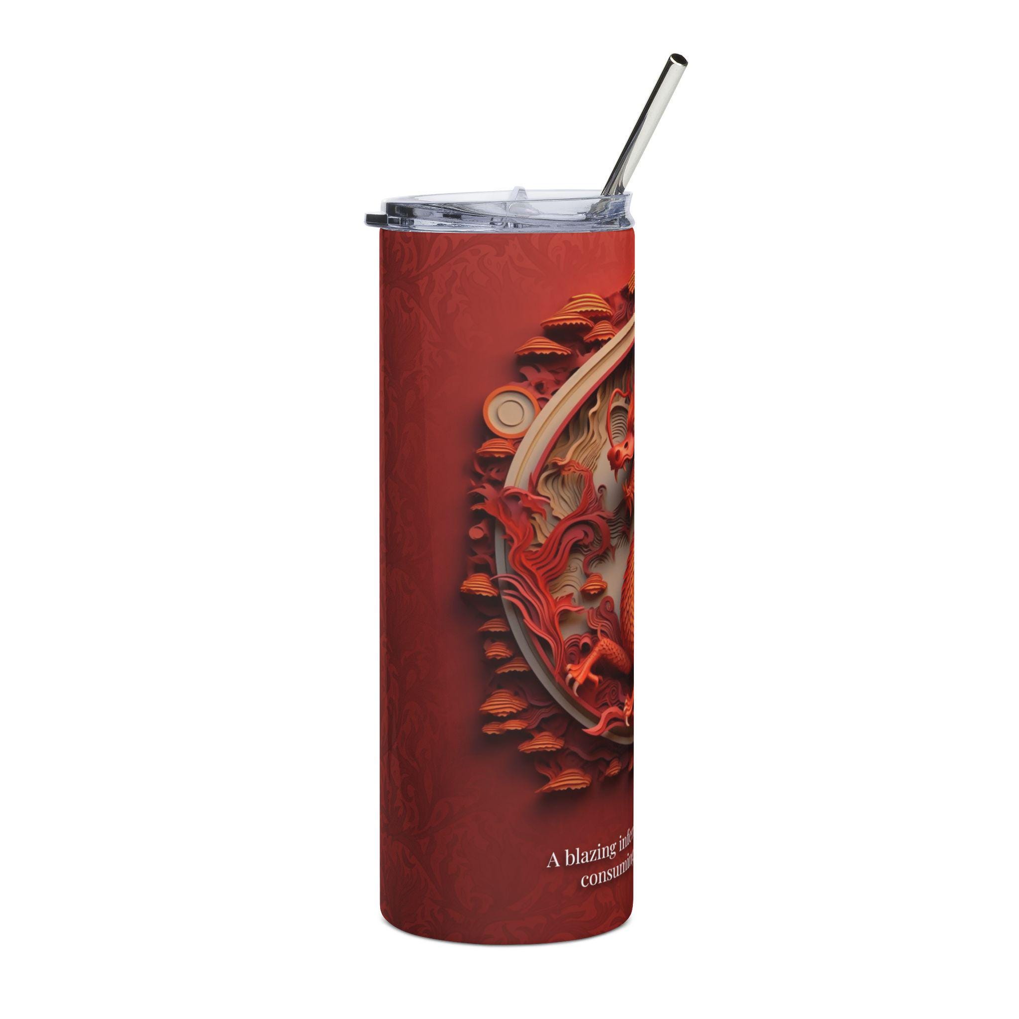 This 20 oz stainless steel tumbler carries a bold, fiery presence—warm reds and sculpted dragon relief wrap the full 360° surface. It feels like holding a little ritual: your morning coffee or evening tea stays at the right temperature while the sculpted dragon artwork invites a breath of focus and transformation. The glossy protective layer adds depth to the colors and keeps the design vivid through daily use. Narrow and tall, it slips into cup holders and backpacks, ready for hikes, commute days, or quiet moments at home when you want something both practical and soulful in your hands.
