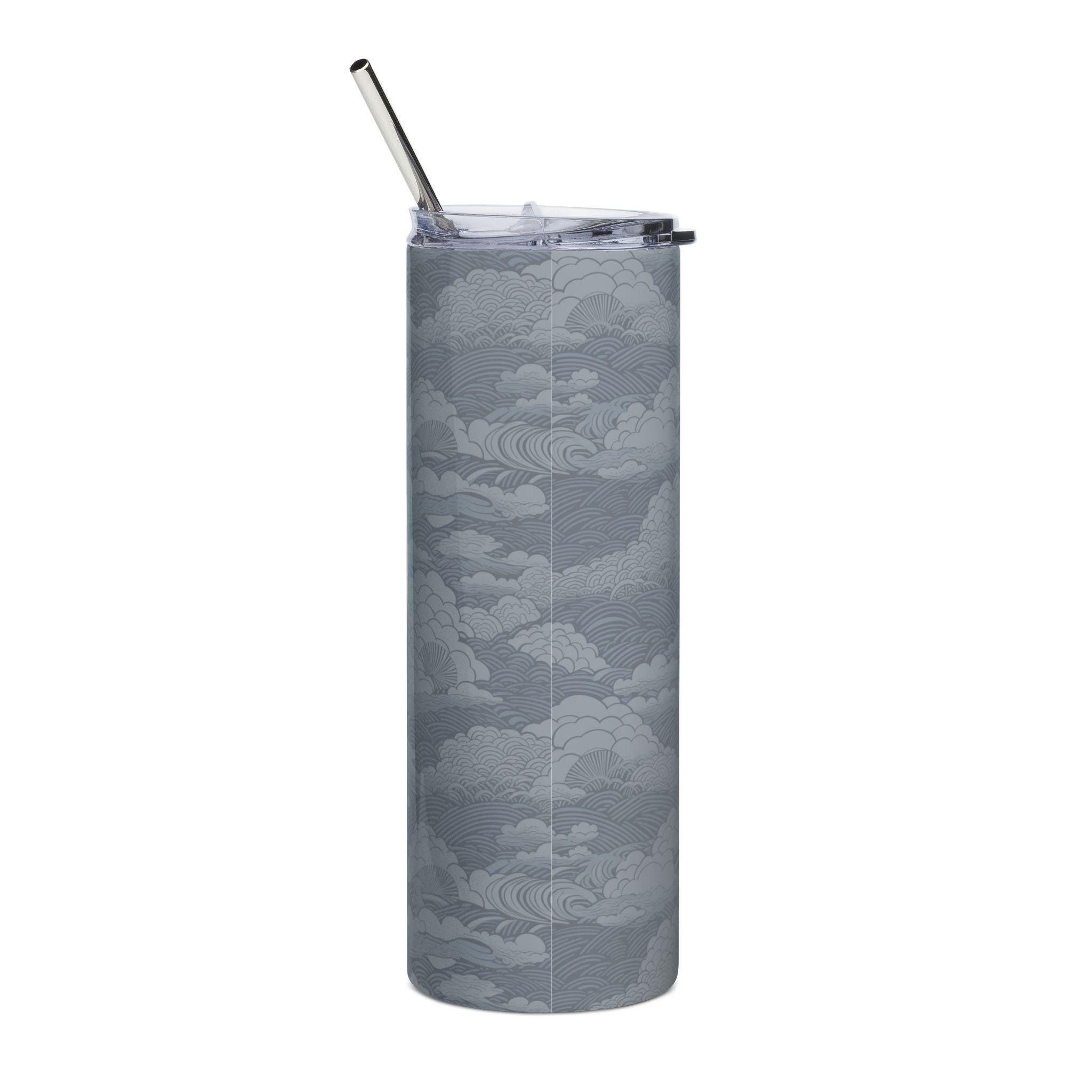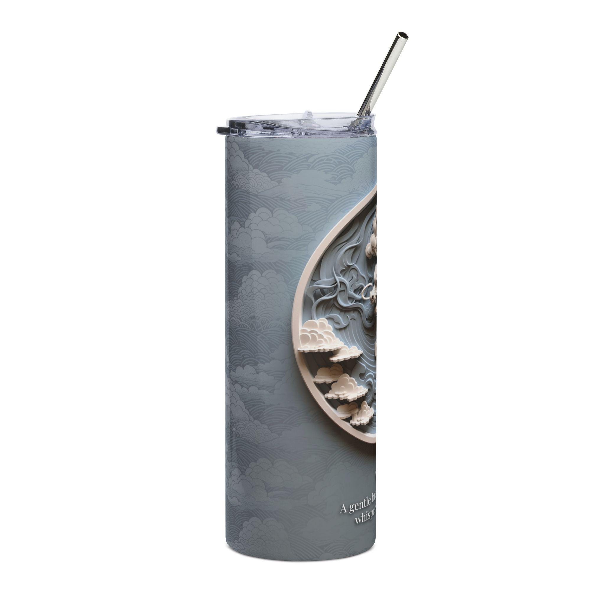 This 20 oz stainless steel tumbler turns quiet elegance into something you use every day. A sculpted dragon motif wraps the cylinder in soft relief, set against a muted, clouded background—like a miniature bas-relief you can hold. The glossy protective varnish deepens the artwork’s tones while keeping the surface durable for daily use. It comes with a clear lid and metal straw for sipping on the go. Whether carried between meetings, tucked beside a sketchbook, or taken on a late-night walk, the tumbler feels calm and collected, adding a subtle, artful presence to routine moments.