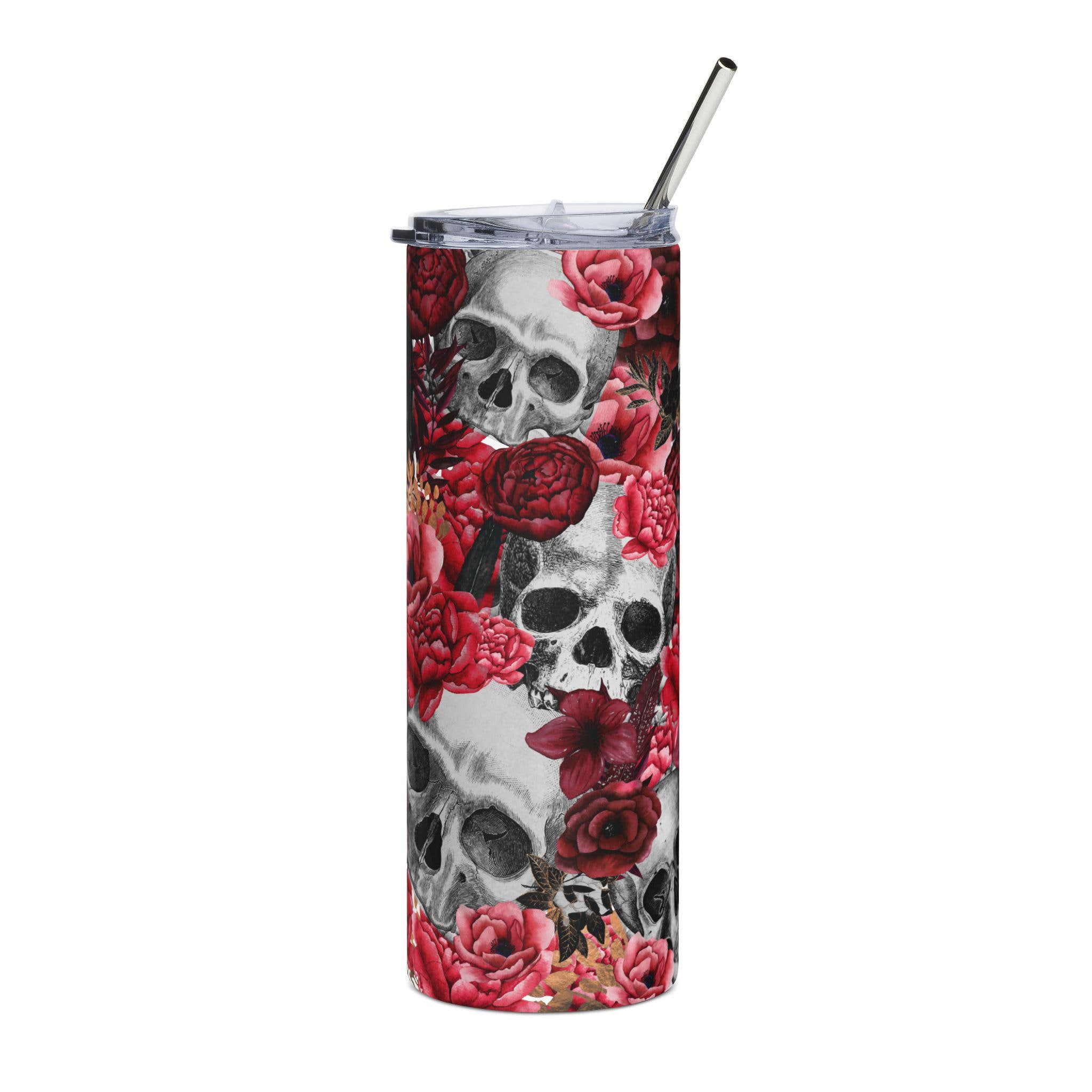 Tall, slim stainless steel tumbler wrapped in a moody, botanical skull pattern that feels equal parts gothic and romantic. The 20 oz slender profile fits cup holders and hangs comfortably in hand. Use it for long drives, late-night studio sessions, or when you want a drink container that speaks to a darker, artful aesthetic. The glossy protective varnish preserves the deep reds and muted grays, while the included clear lid and stainless straw make sipping easy and spill-resistant. This tumbler becomes a daily companion — keeping iced coffees cold and warm teas at the right temperature while reflecting a distinctive, creative style.