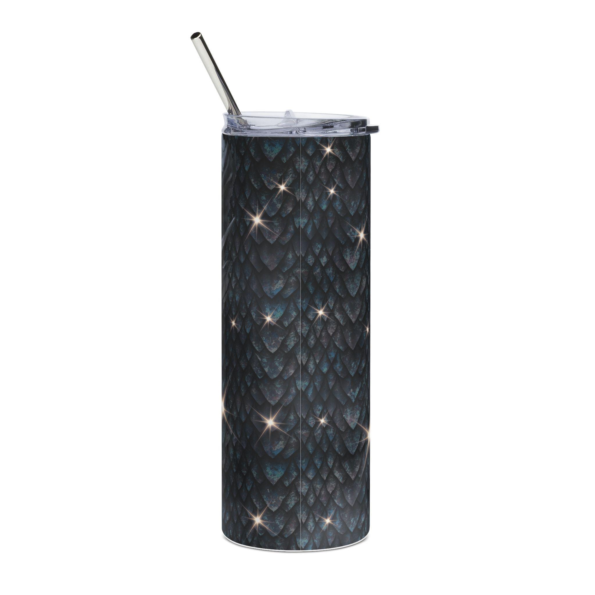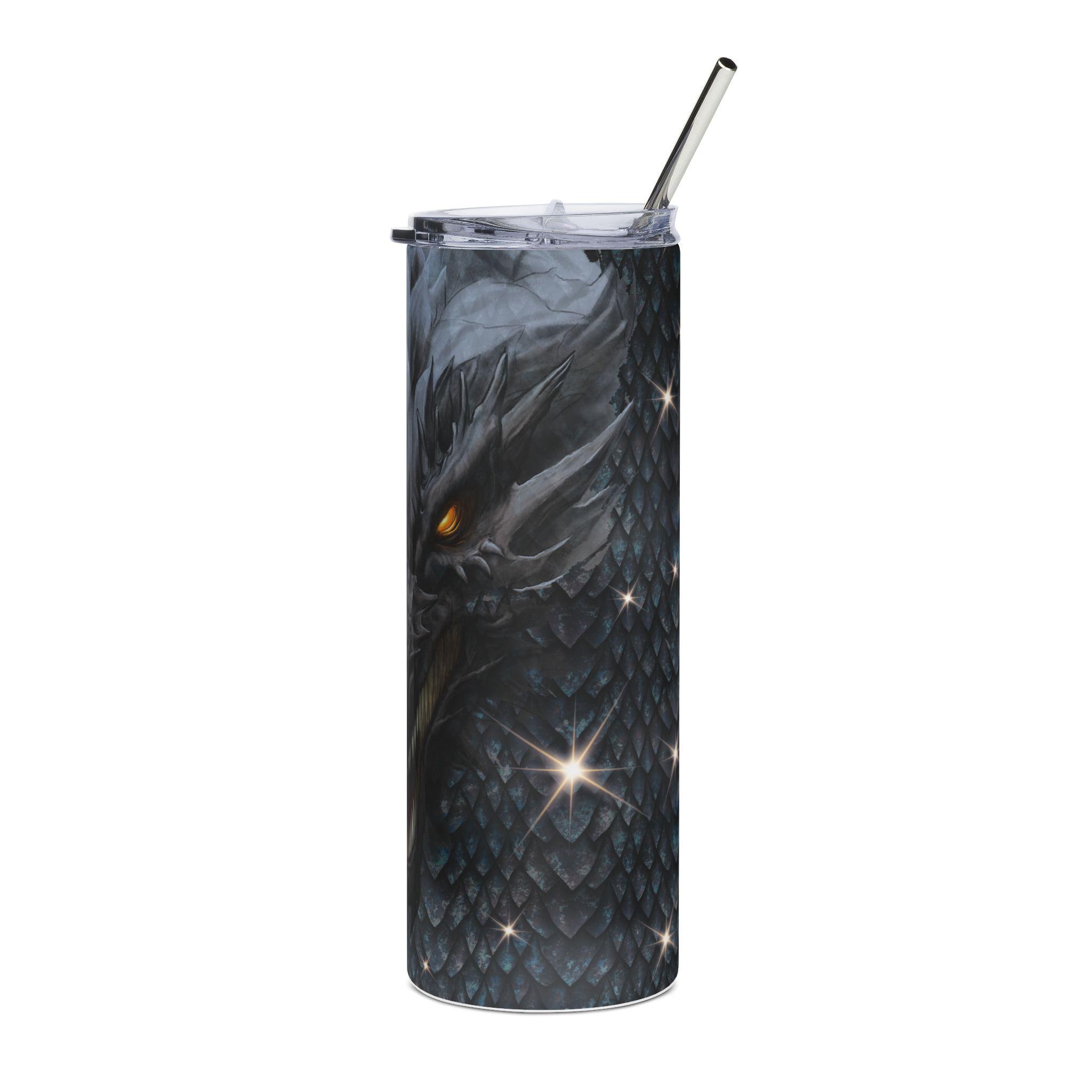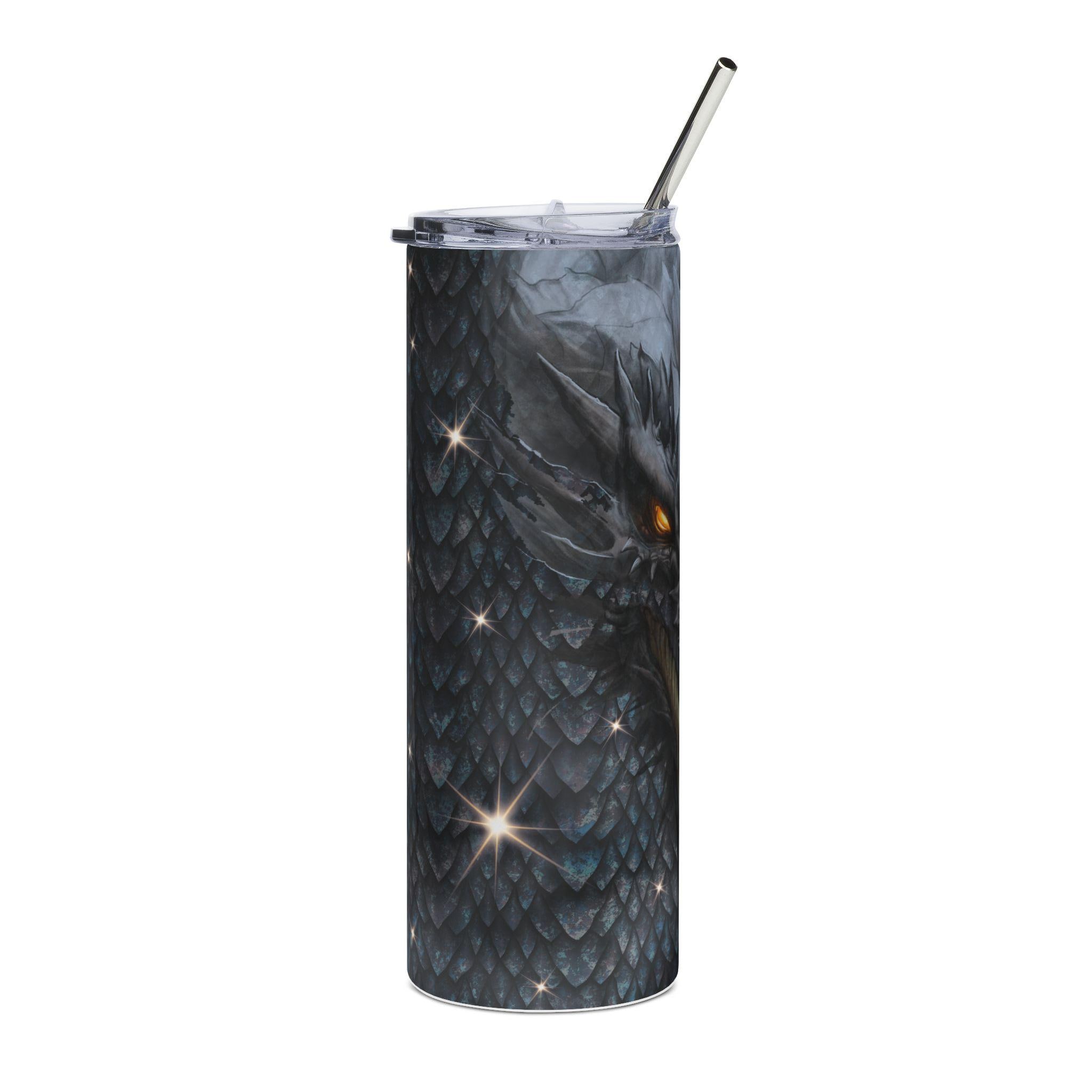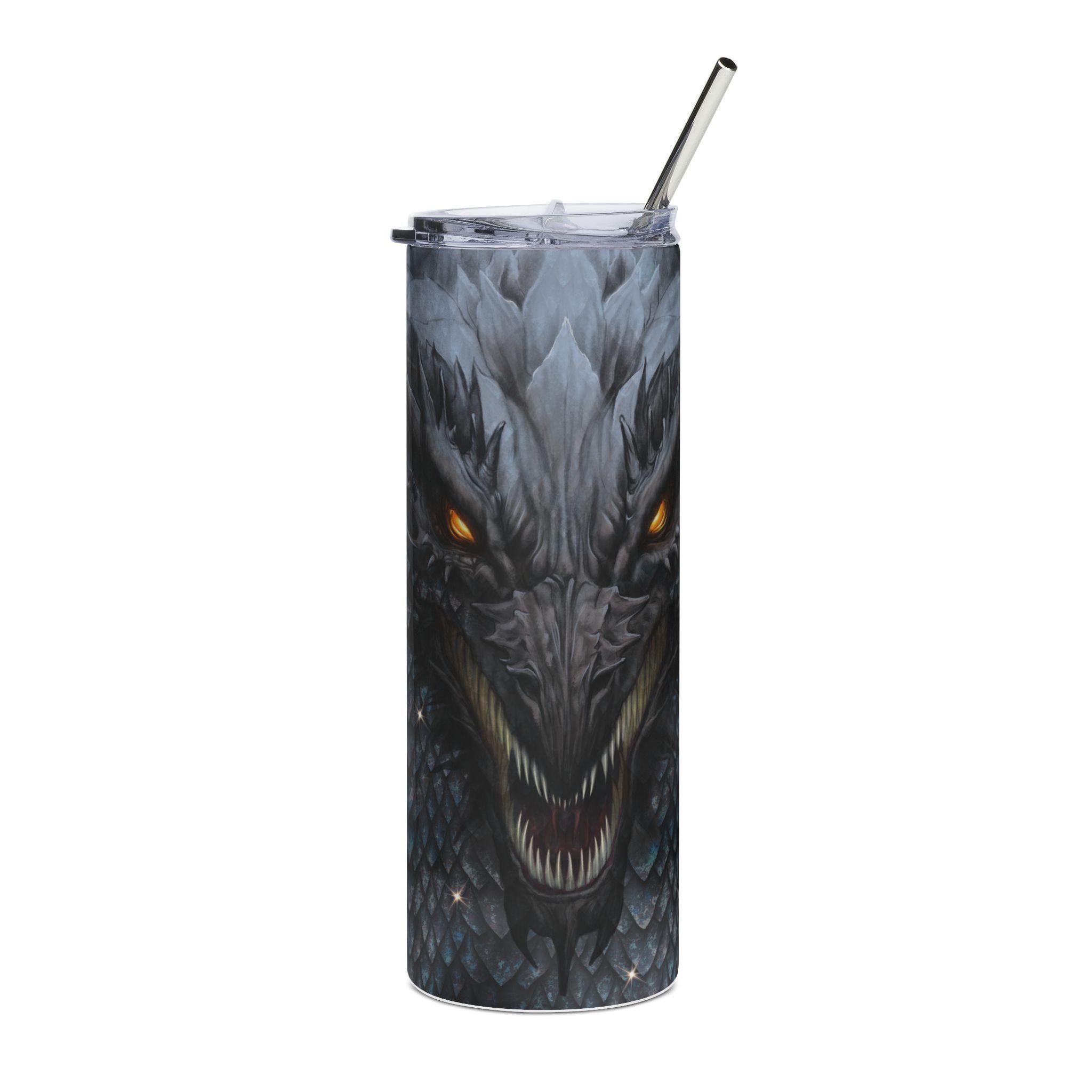A 20 oz stainless steel tumbler wrapped in a moody, dragon-scale illustration that feels alive. The tall, slim cylinder holds a full 600 ml and keeps your drink secure with a clear lid and reusable straw. Deep charcoal scales fade into a menacing dragon face with glowing amber eyes — a design that adds quiet intensity to a morning commute, a long gaming session, or a brisk hike. The glossy protective varnish gives the artwork depth and helps guard against wear while the durable stainless steel body resists rust. Use it when you want a drink container that reads like armor: functional, bold, and quietly fierce.
