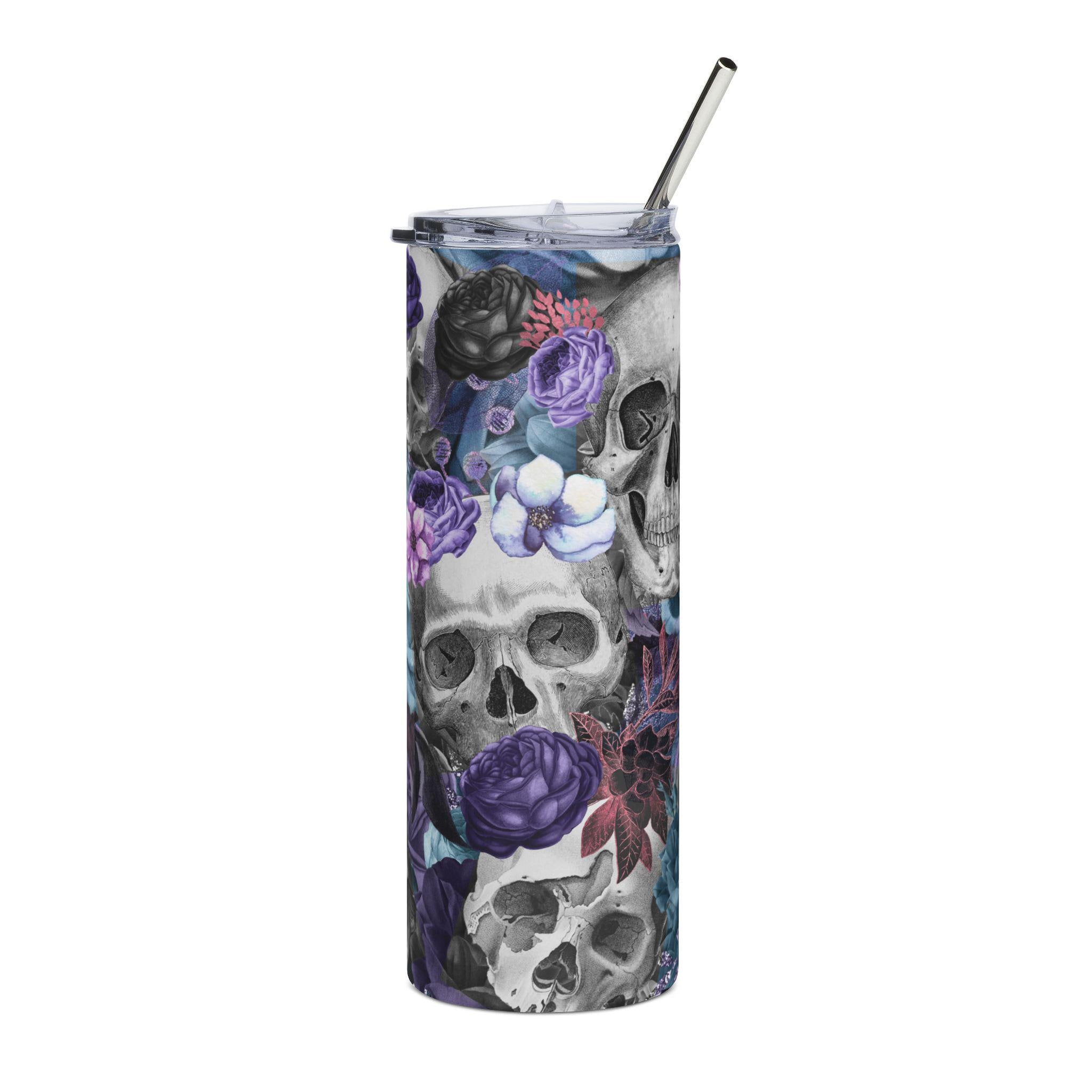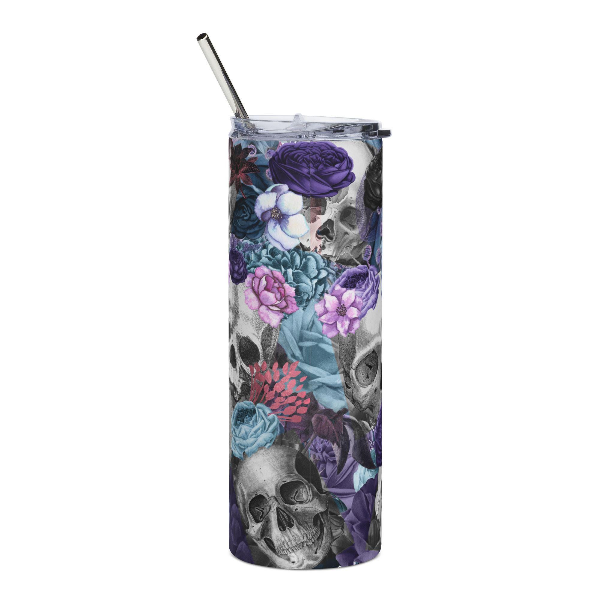 This 20 oz stainless steel tumbler carries a darkly romantic vibe — hand-filled with detailed skulls and moody flowers in purples and teal. It feels like a quiet alley of moonlit petals: cool to hold, visually rich, and made to travel with you. Keep chilled water or an iced drink at hand while the artwork wraps the full 360° surface; the glossy protective layer keeps colors deep and slightly luminous. The included clear lid and metal straw make sipping easy on the go, and the slim cylindrical shape slips into cup holders and backpacks without fuss. For people who love gothic florals and low-light beauty, this tumbler blends utility with a striking, personal statement.