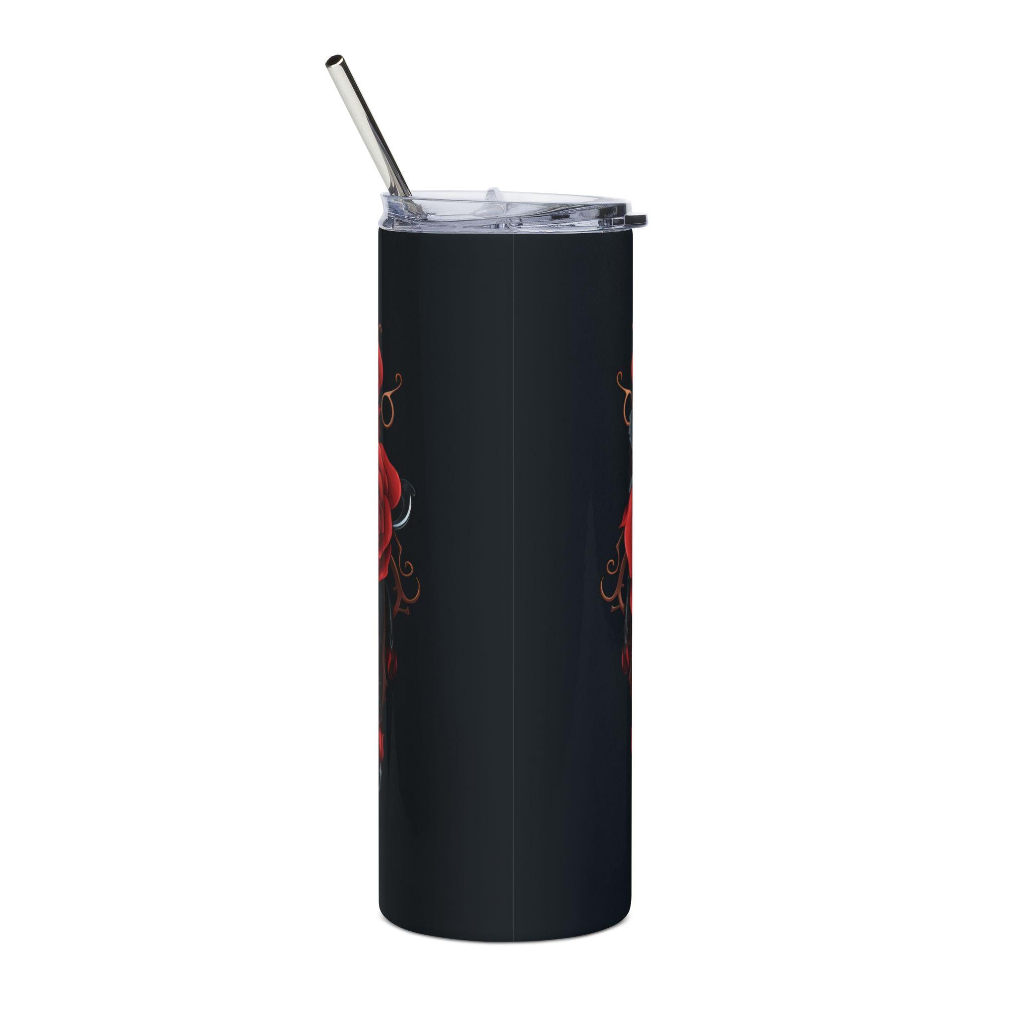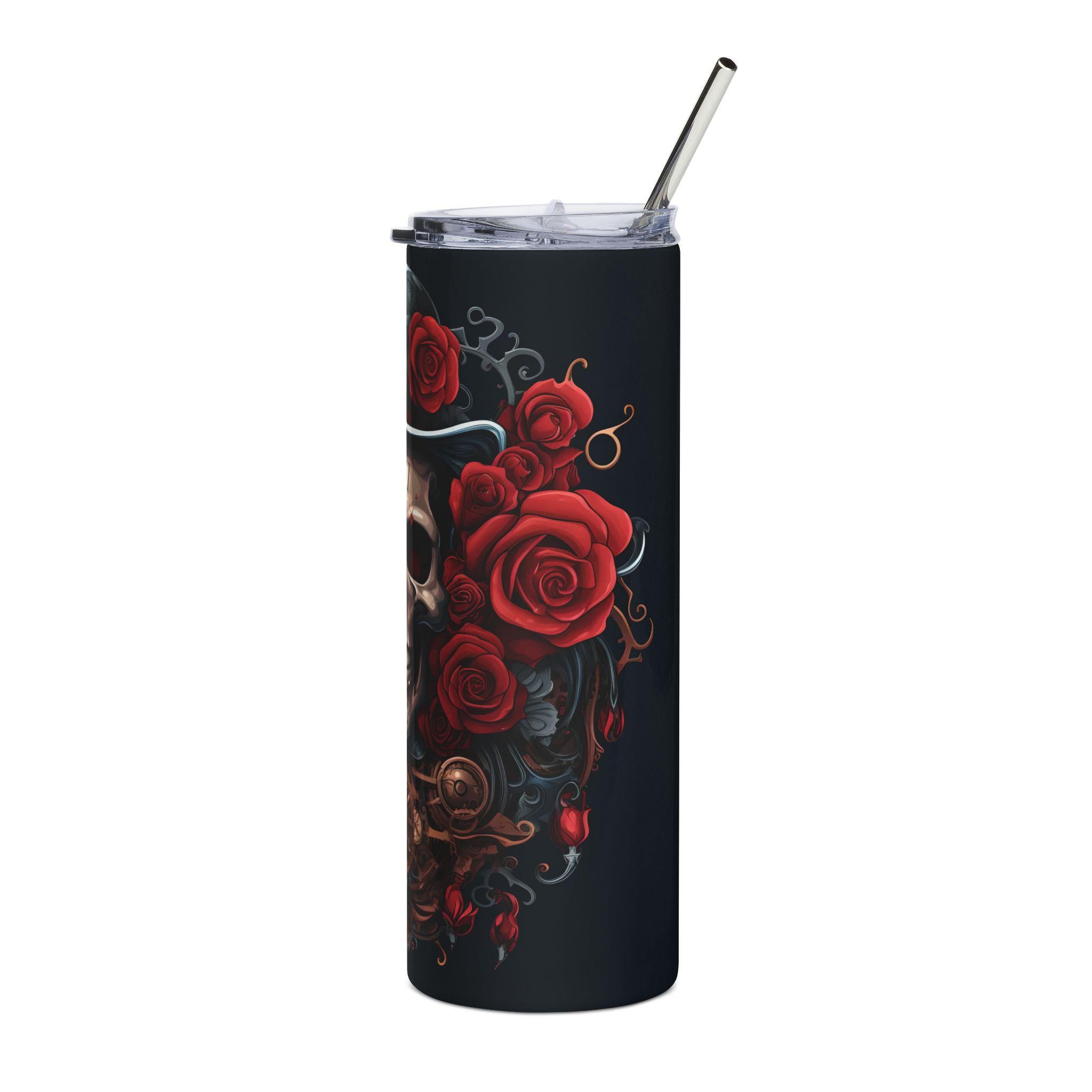 Tall, slim stainless steel tumbler wrapped in a moody, gothic design — a grinning skull beneath a weathered top hat, framed by deep red roses and vintage clockwork. It feels like a midnight ride through an old carnival: dark, detailed, and oddly romantic. This tumbler slips easily into a bag or cup holder, keeping your drink close during late-night drives, long studio sessions, or tattoo-shop hangs. The glossy protective coating makes the artwork pop while guarding it from wear, and the included lid and straw keep spills down and sips steady when you’re on the move.