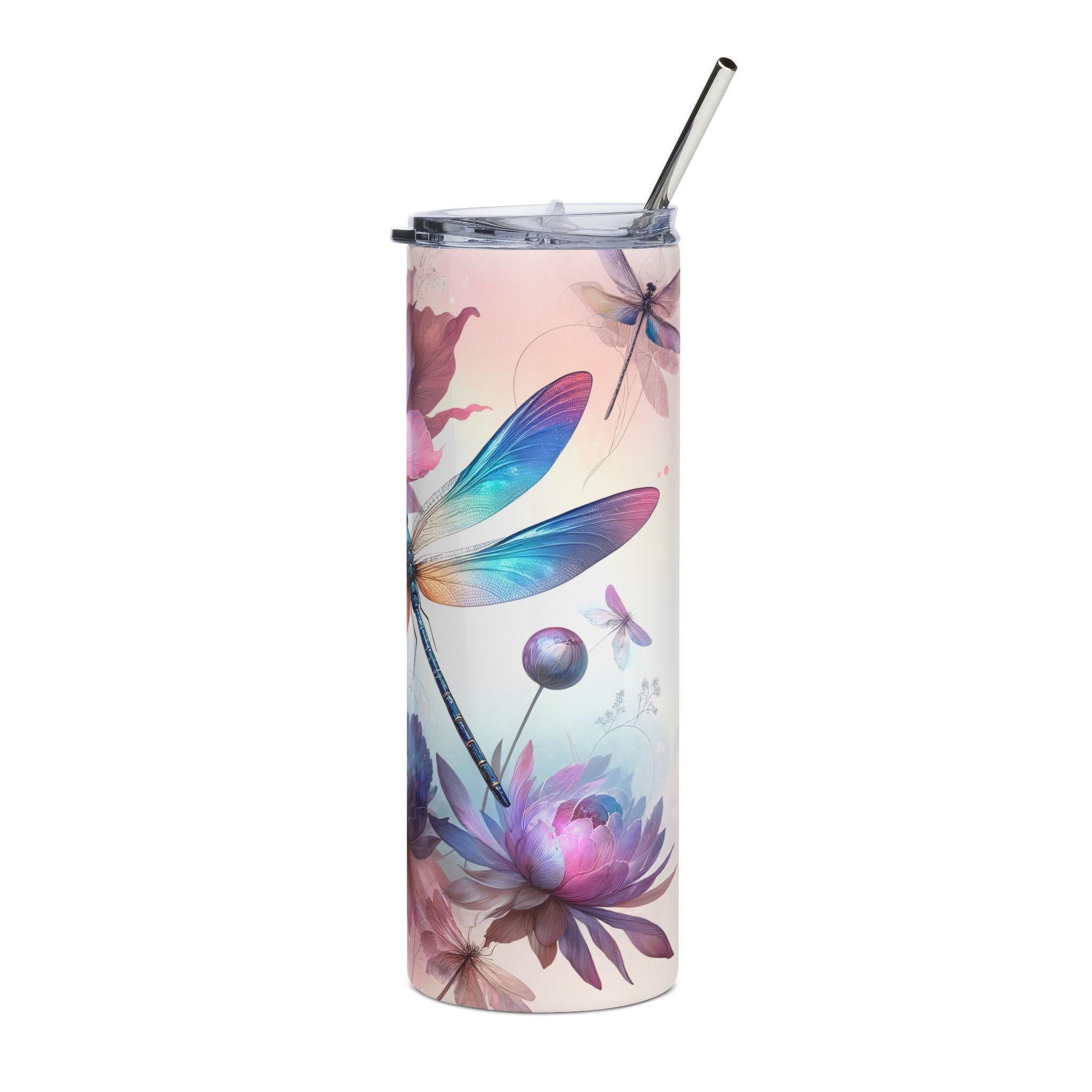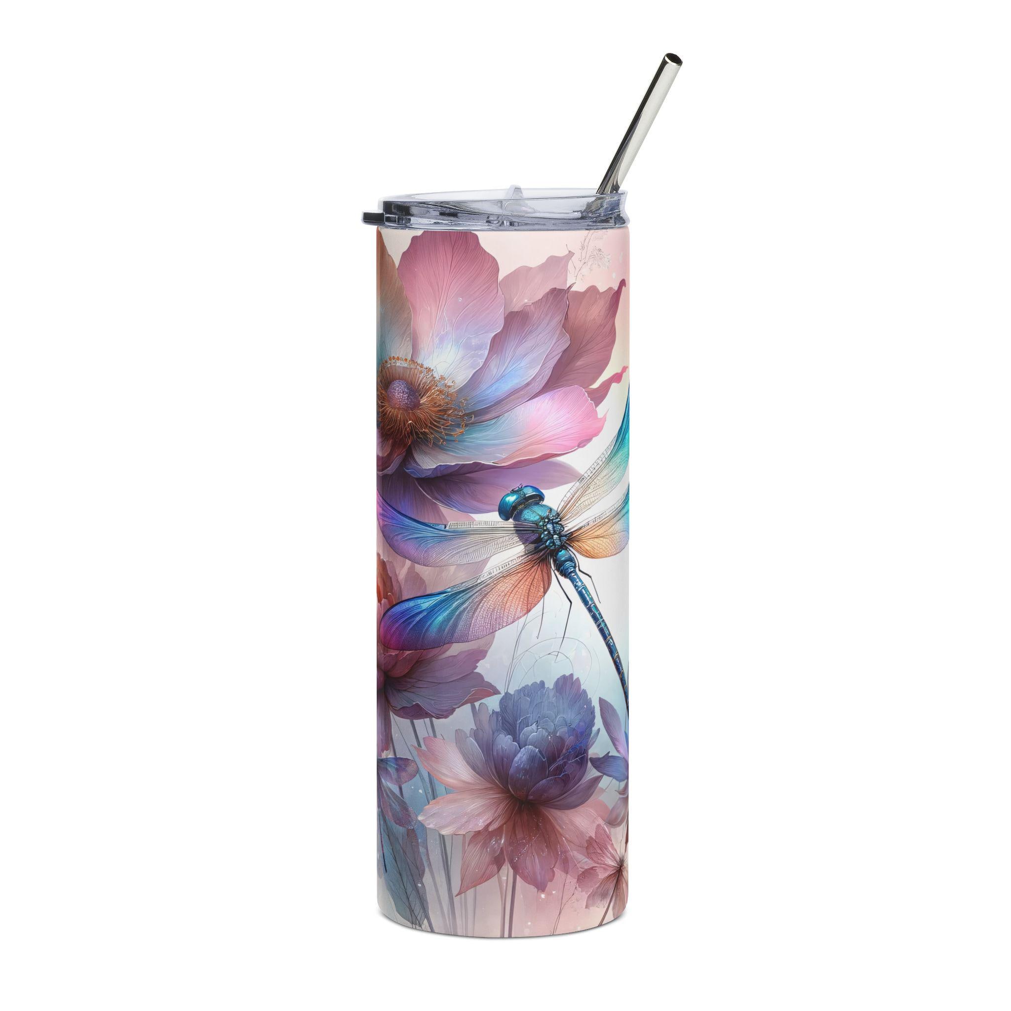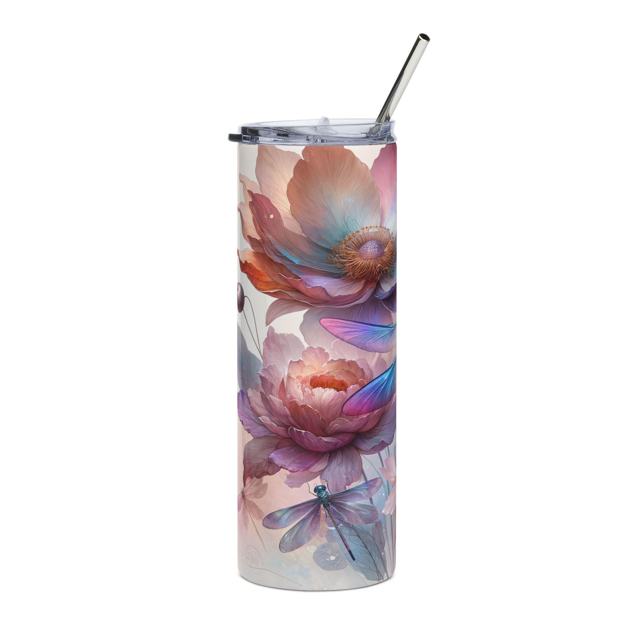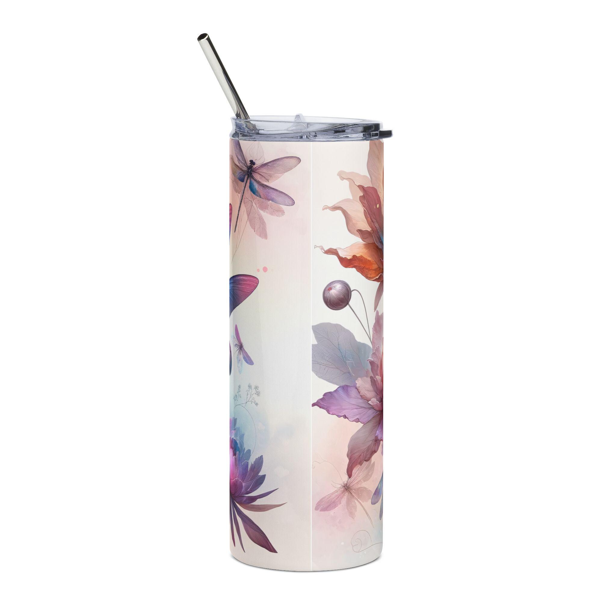 Sip slowly and let color settle in. This 20 oz stainless steel tumbler wraps a soft, watercolor garden around your drink — layered petals and delicate dragonflies in blush, teal, and lavender. The slim, cylindrical shape slips easily into a bag or cup holder and keeps your hand comfortable while you move through a busy day or linger with a book on the porch. The glossy protective layer preserves the artwork’s sheen; the included lid and metal straw make cold sips effortless. It feels like carrying a little moment of calm wherever you go.