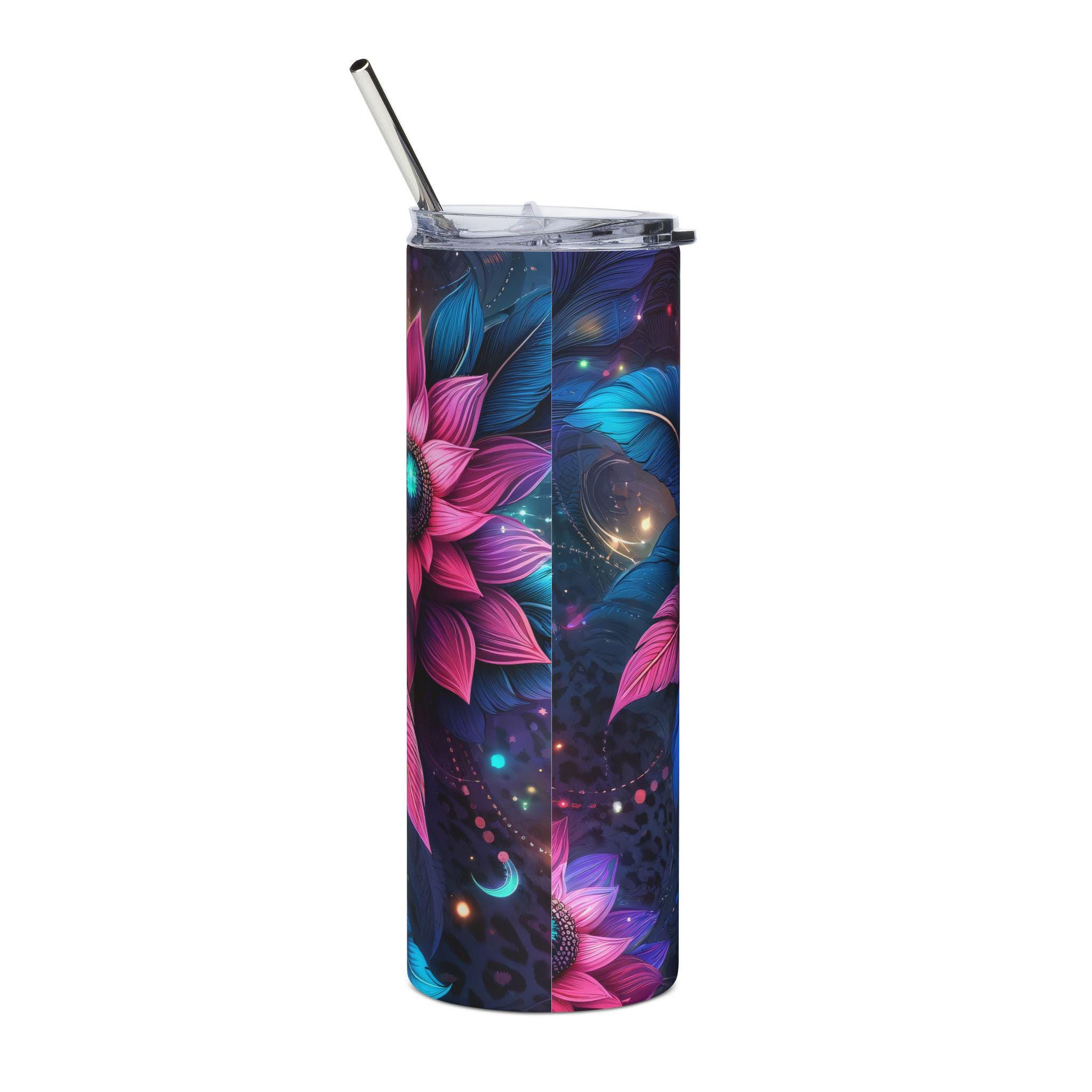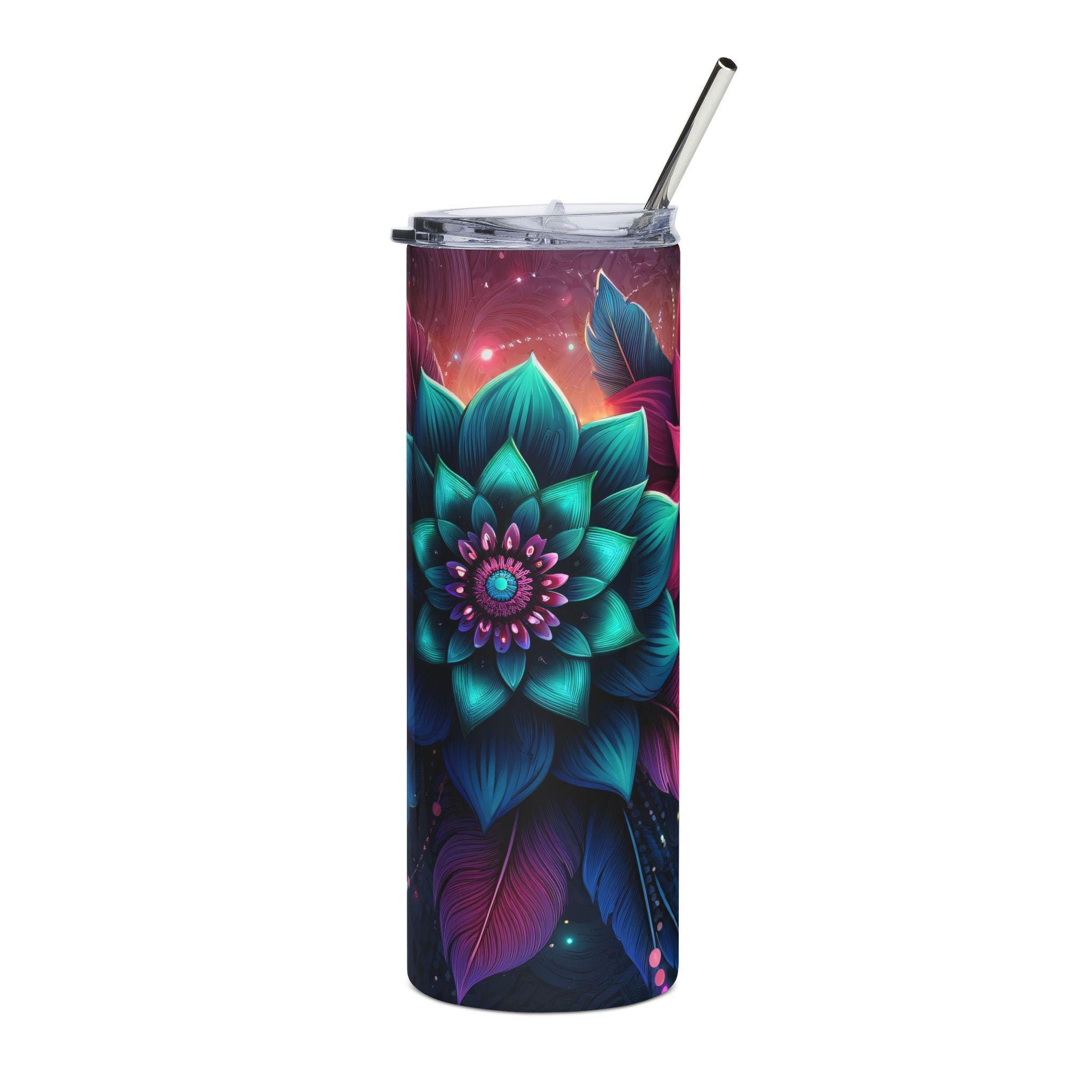 This 20 oz stainless steel tumbler wraps a vivid, jewel-toned floral mandala around a slim, cylindrical silhouette. Cool turquoise, deep indigo, and magenta petals glow against a moody background, turning a simple sip into a small, meditative moment. Lightweight and sturdy, the tumbler keeps your drink contained on commutes, studio sessions, or late-night creative bursts. The included clear lid and reusable straw make it easy to drink on the go, while the glossy protective layer preserves the saturated print so the artwork stays bright through daily use. It sits comfortably in narrow cup holders and feels balanced in hand — a functional piece that also reads like wearable art for anyone who collects colorful, dreamy gear.