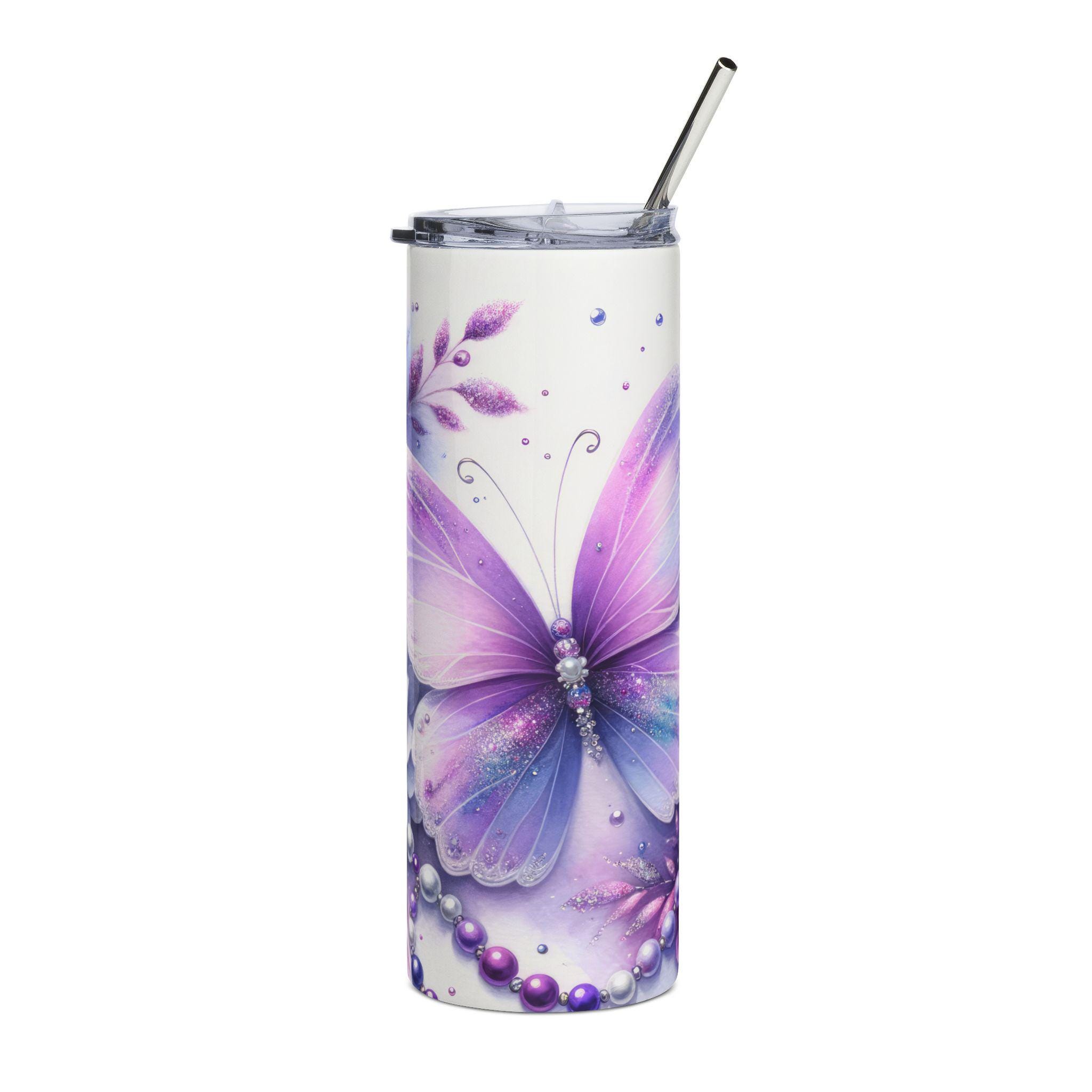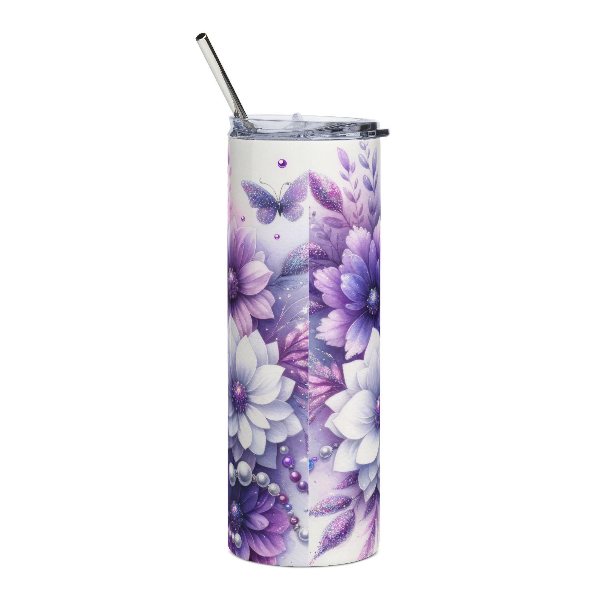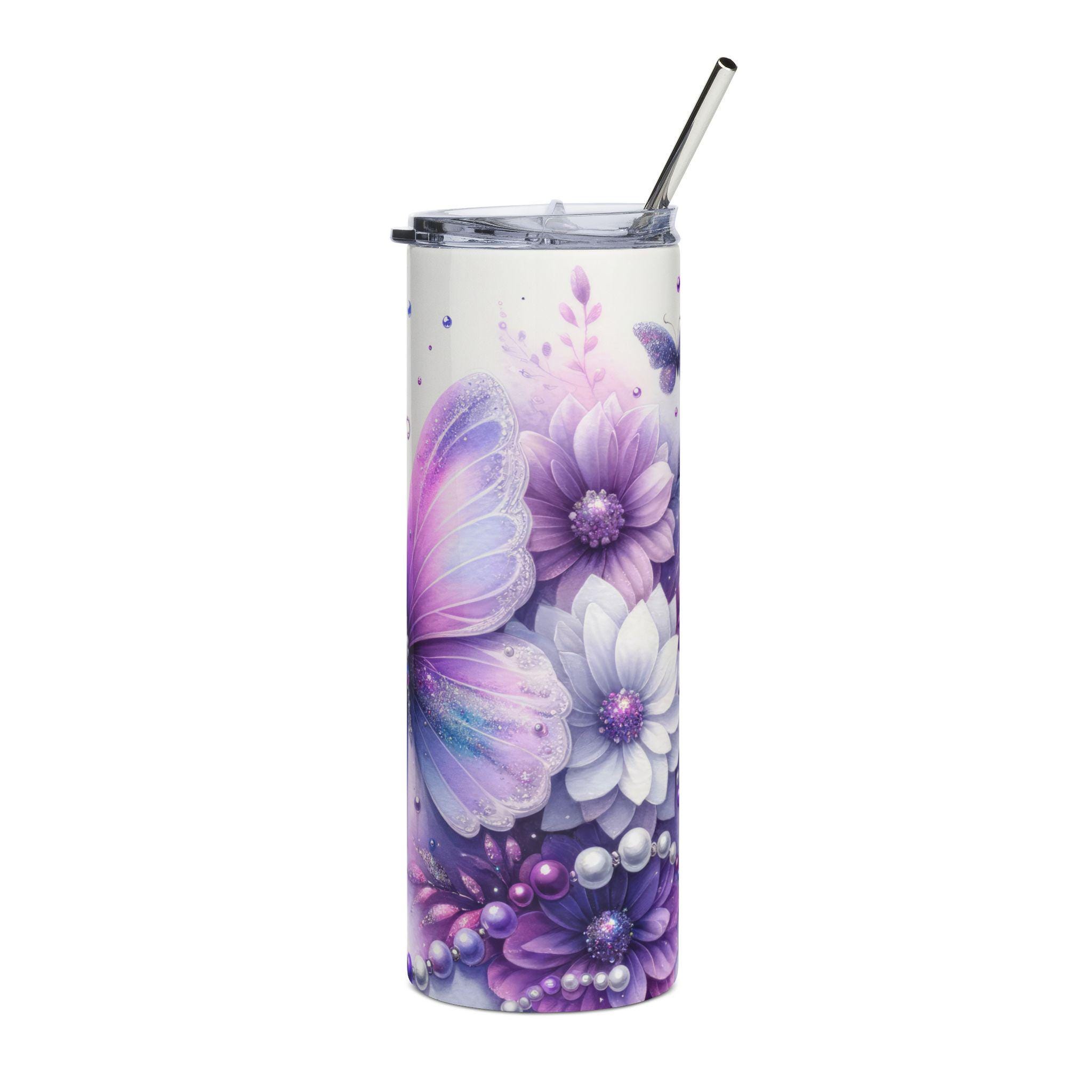 This slim 20 oz stainless steel tumbler wears a dreamy lavender palette—delicate butterflies, soft petals and pearlescent accents wrap the full 360° printable surface. It feels light and personal in the hand, the glossy varnish catching the light and making the artwork glow while the insulated steel core keeps drinks at a steady temperature. A clear, spill-resistant lid and reusable straw make it easy to sip on the move, whether you’re commuting, journaling in a café, or taking a quiet walk in the garden. The cylindrical shape slips into most cup holders and the tall, narrow profile is designed for hands that prefer a sleek, elegant drinkware silhouette. This tumbler blends function and art: durable stainless steel construction for everyday use, plus the kind of soft, feminine illustration that invites a moment of calm whenever you reach for a drink.