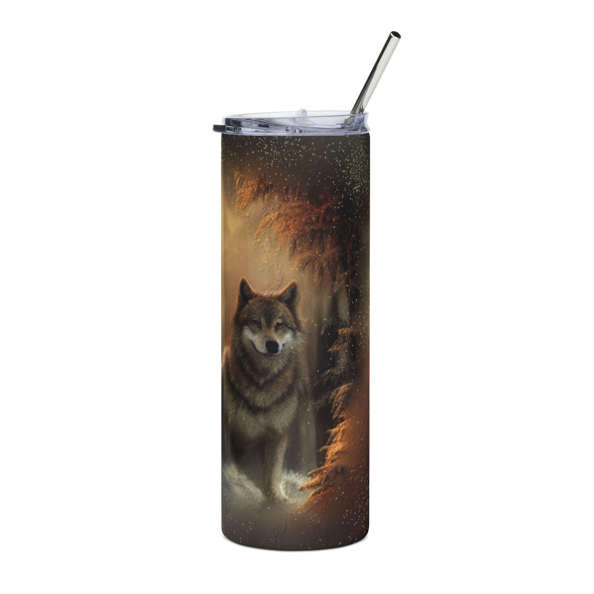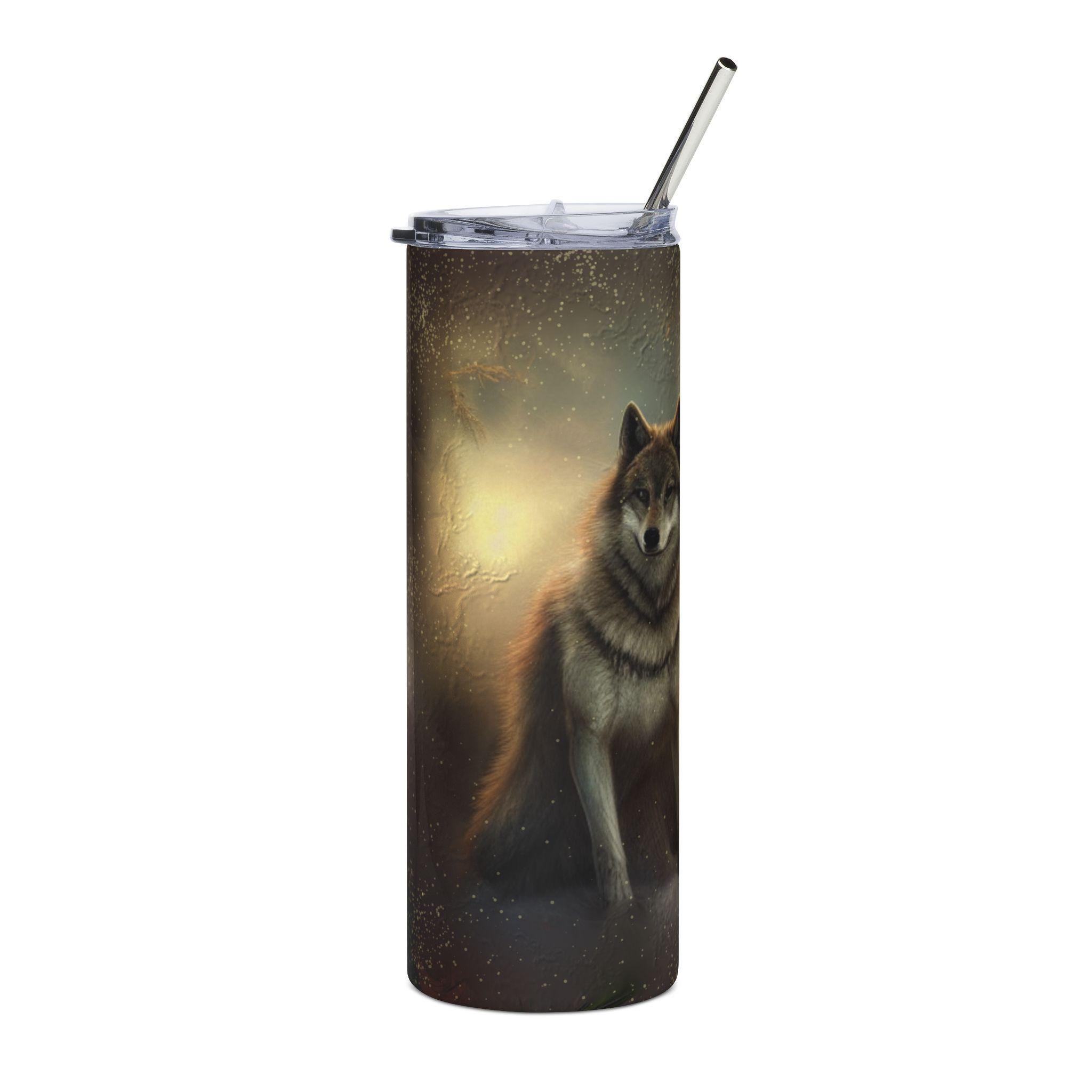 This 20 oz stainless steel tumbler brings a quiet, woodland presence to your daily routine. The wraparound artwork shows noble wolves bathed in warm, twilight tones—an image that feels like a slow breath of pine and evening air. The slim, cylindrical silhouette fits cup holders and hands comfortably, while the glossy protective finish keeps the print luminous through everyday use. Use it during long drives, cool morning hikes, or while curled up with a book; it holds hot or cold drinks and lets the wolf scene be a small, steady companion wherever you go.