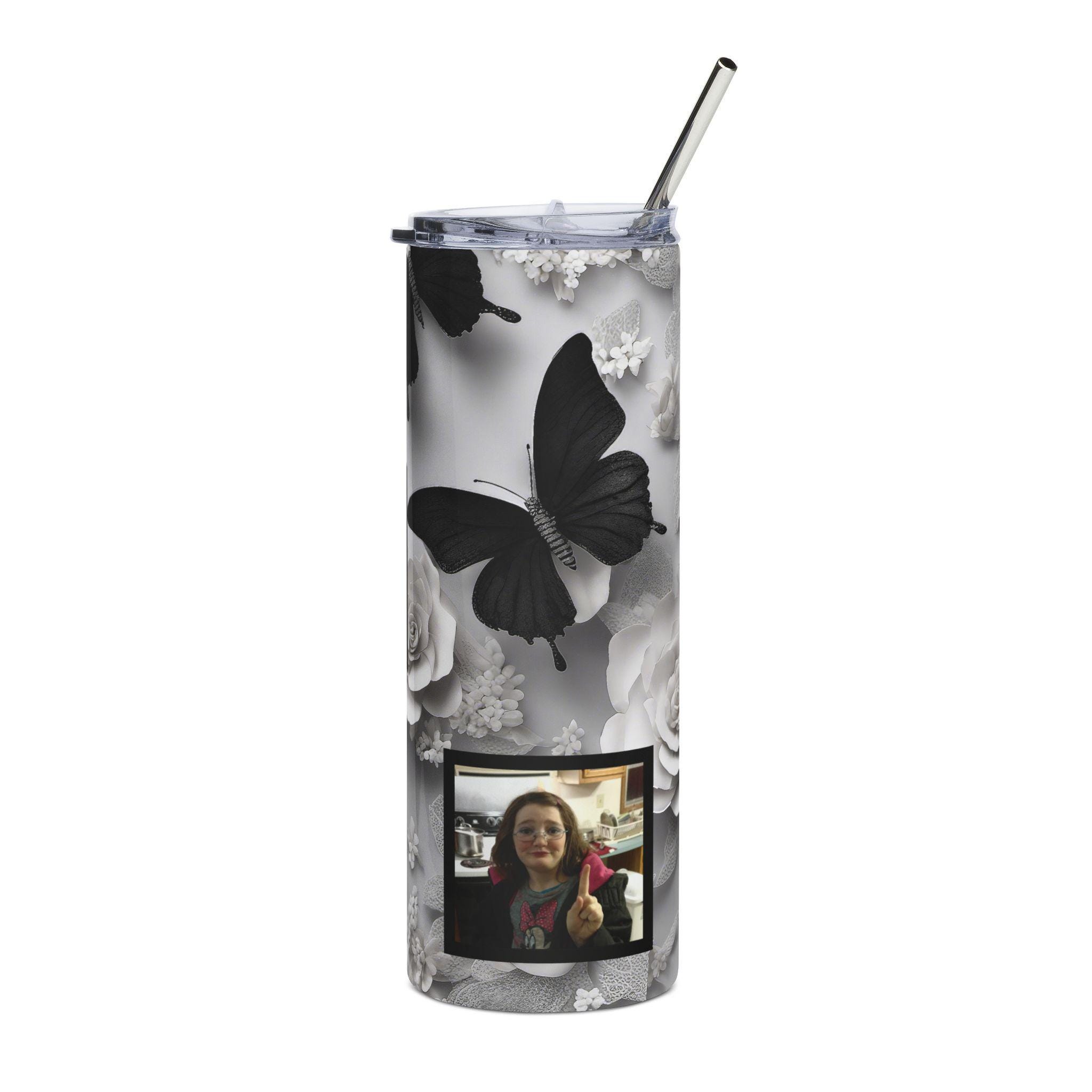 Carry a quiet, personal moment with you wherever you go. This 20 oz stainless steel tumbler wraps a soft grayscale collage of roses and floating butterflies around your photos, creating a gentle, reflective mood. It feels like a small private shrine: cool to the touch, solid in hand, and finished with a glossy protective coat that catches the light. The included lid and straw make it easy to sip at the studio desk, on a morning walk, or during a late-night creative session. For someone who treasures memories and subtle, elegant design, this tumbler turns daily hydration into a calm, meaningful ritual.