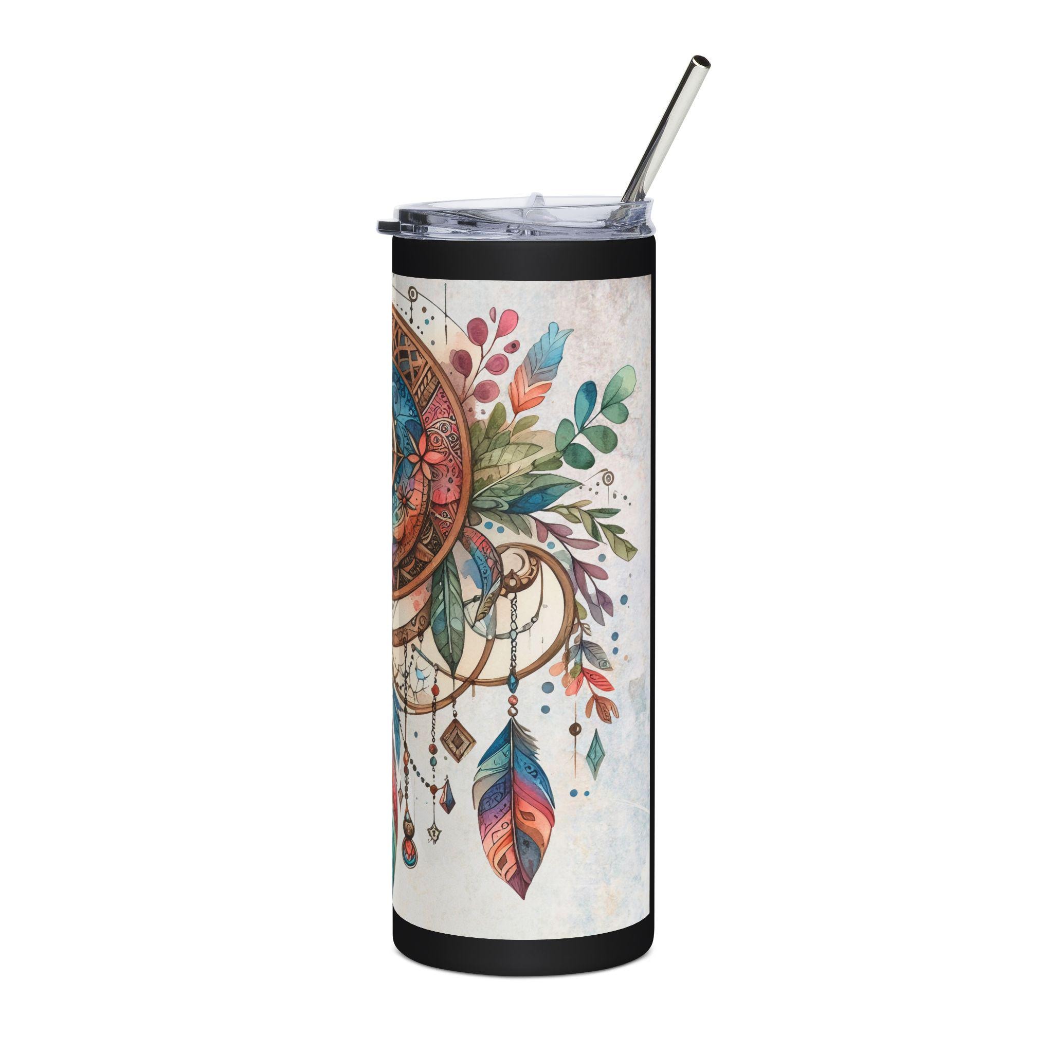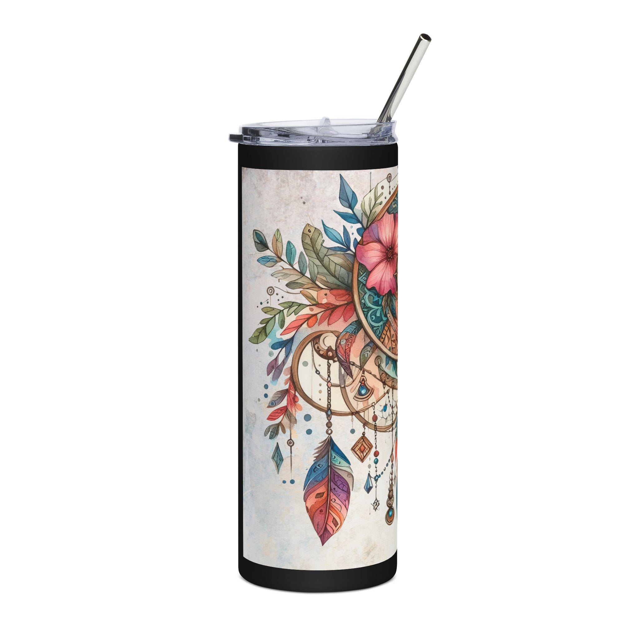 Carry a piece of wanderlust wherever you go. This 20 oz stainless steel tumbler wraps a watercolor dream of dreamcatcher motifs, tropical blooms, and jewel-toned feathers around a slim, travel-ready silhouette. It holds morning coffee, afternoon smoothies, or evening iced tea while keeping your hands comfortable and your drink secure. The glossy protective coat keeps the art vivid, and the included clear lid and straw make sipping on the move easy and spill-resistant. Let it sit on your desk or accompany you to markets and hikes — it’s the quiet, colorful companion that adds a bohemian note to everyday routines.