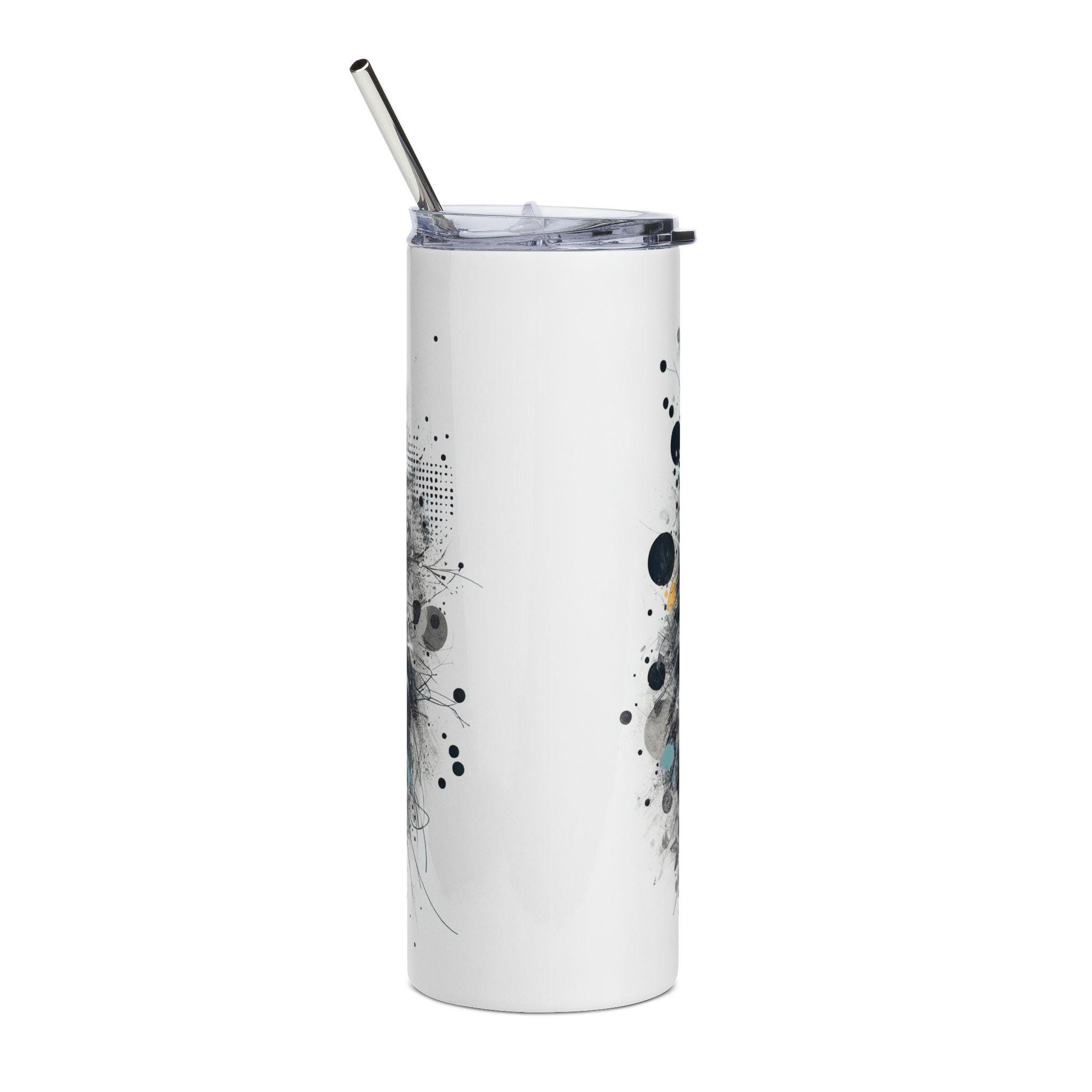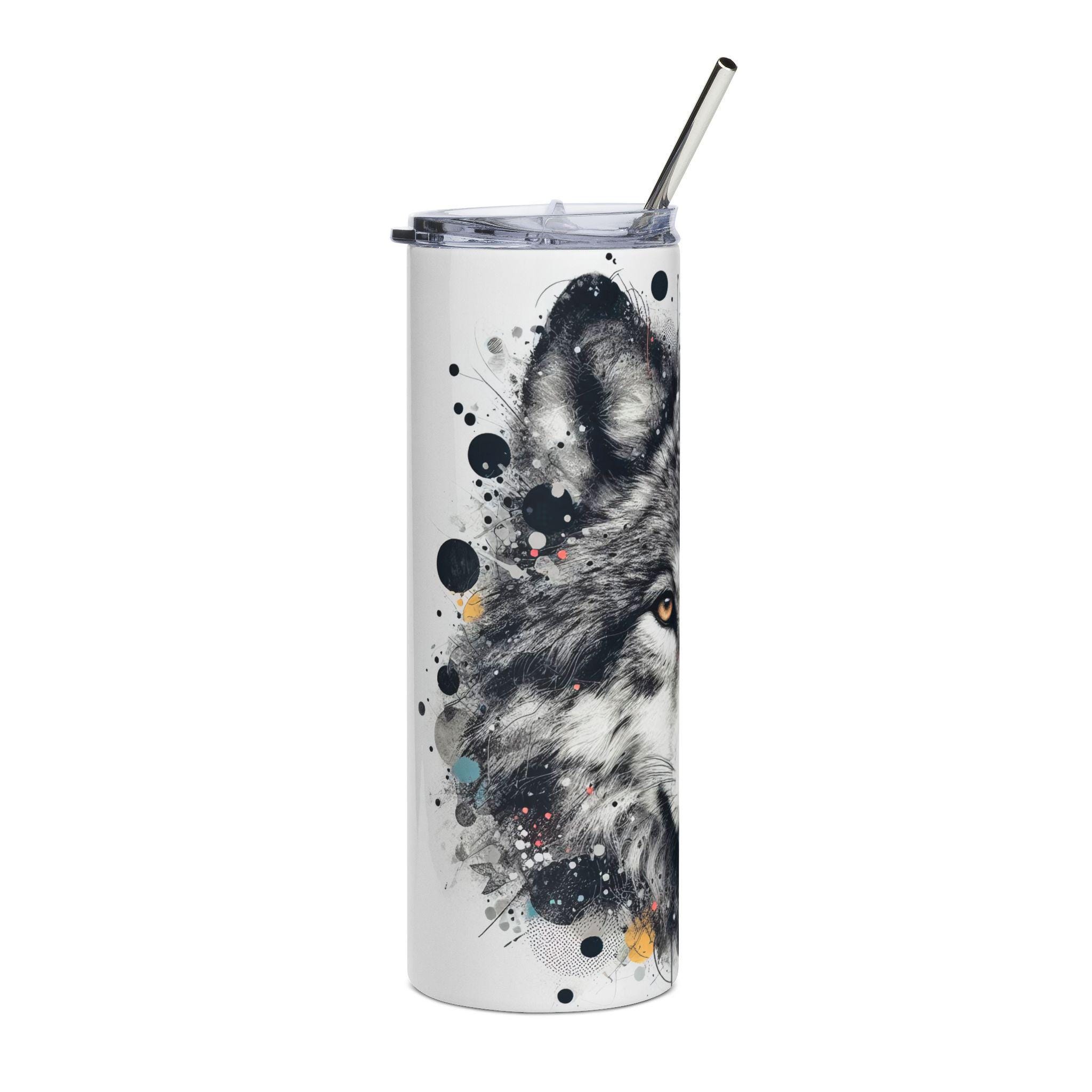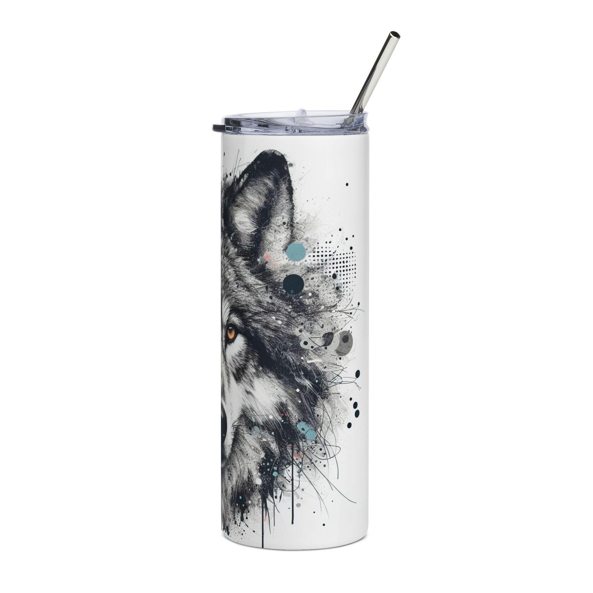 A tall, sleek stainless steel tumbler wrapped in a striking wolf illustration — moody grayscale fur, amber eyes, and ink-splatter accents bring wild, quiet intensity to every sip. The 20 oz cylinder slips easily into cup holders and feels solid in the hand. Use it on morning drives, long hikes, or steady at your desk; the included lid and straw make it simple to hydrate without losing the artwork. The glossy protective varnish keeps the print vivid while the stainless body resists rust and everyday wear. This tumbler blends practical function with a raw, nature-inspired aesthetic for anyone who moves between city streets and forest trails.