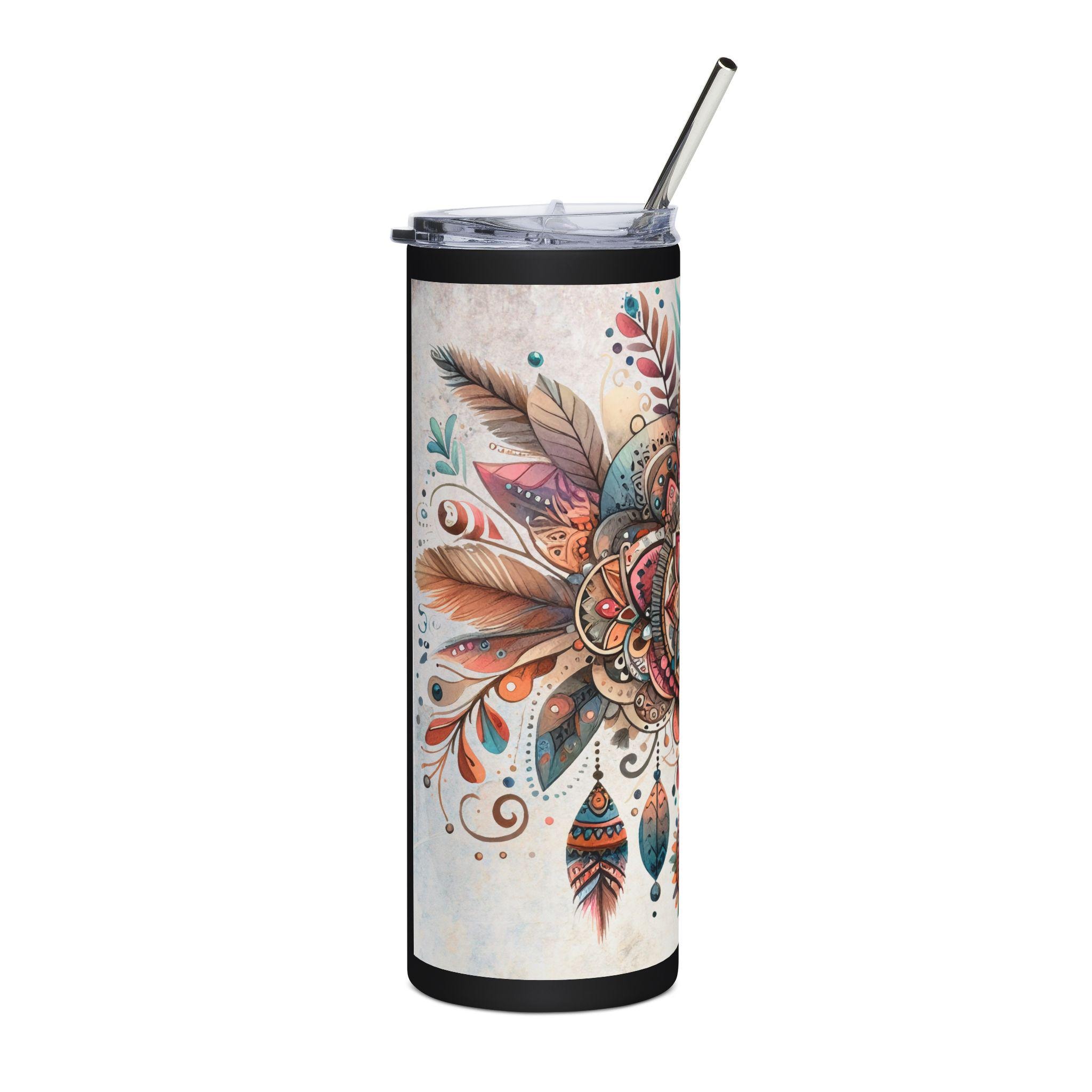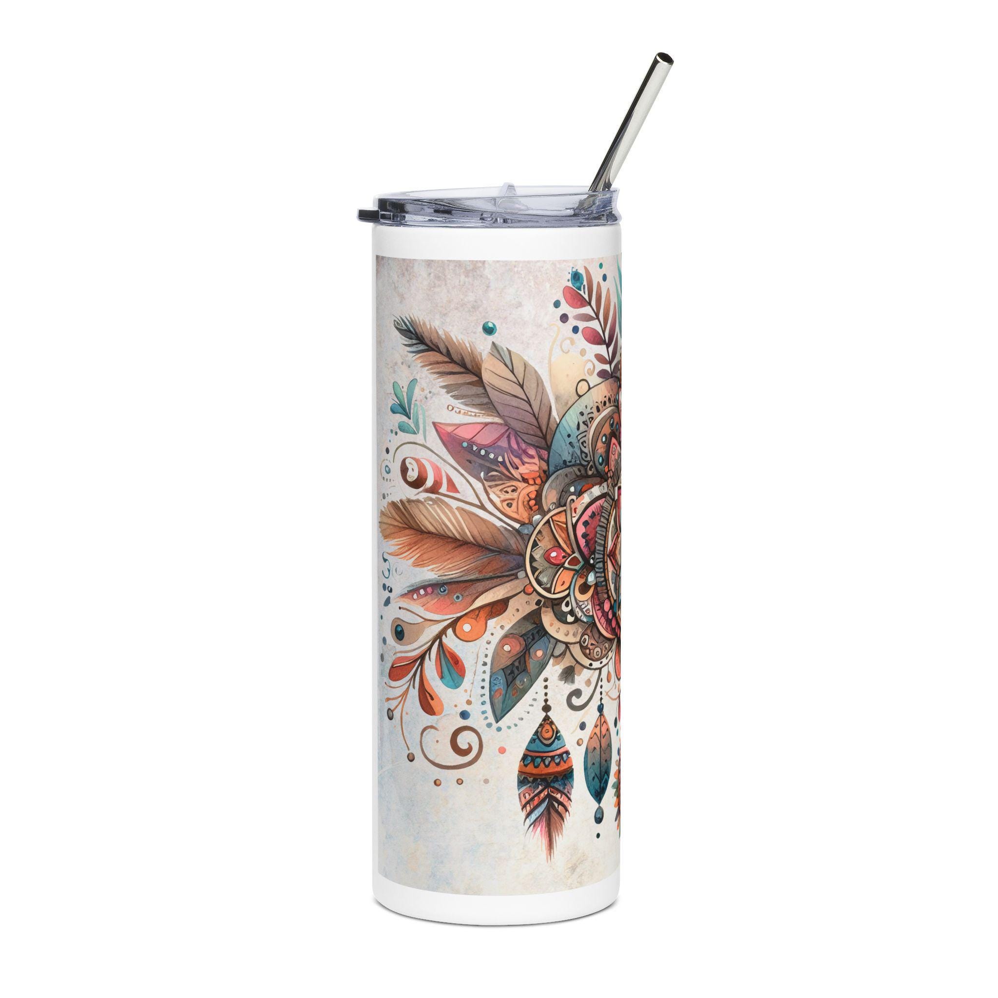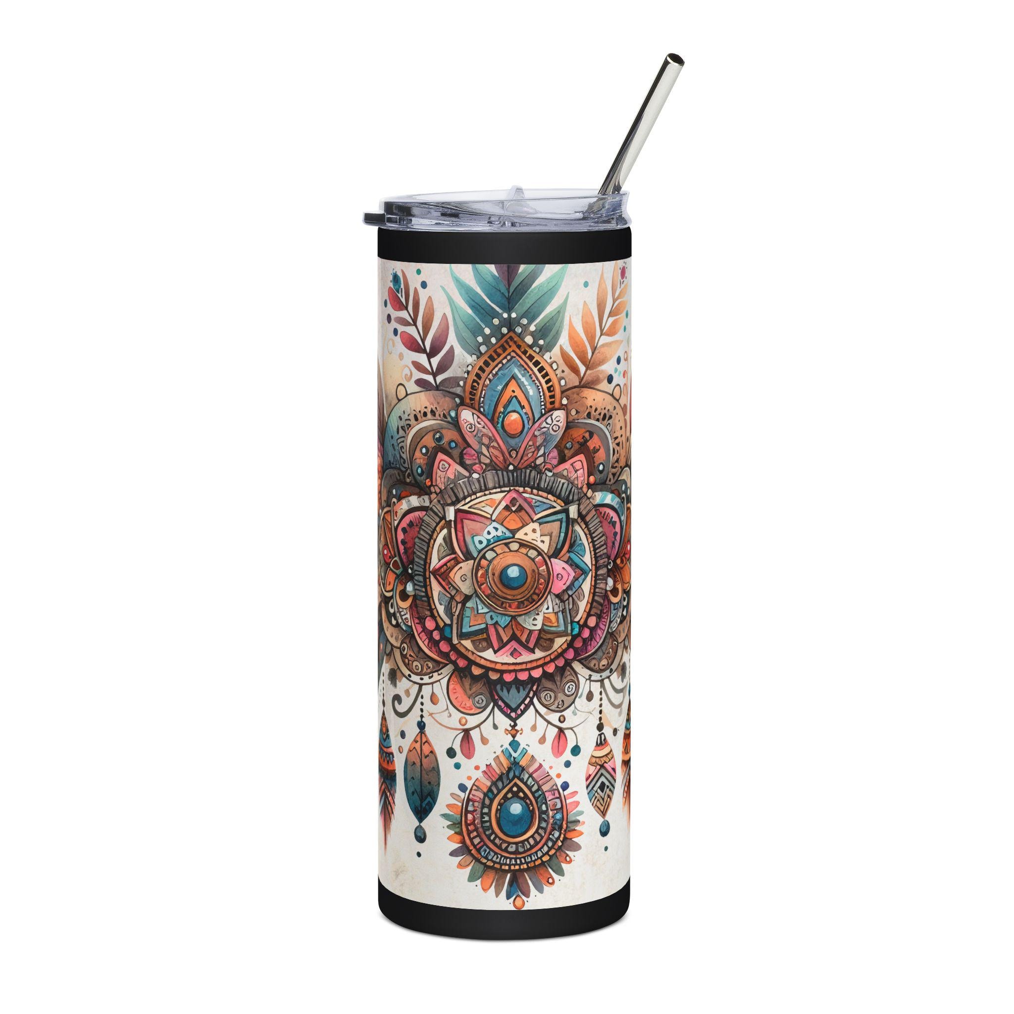 This 20oz stainless steel tumbler wraps a detailed boho-mandala illustration around its slim, cylindrical body. Warm terracotta, teal, and gold tones blend into hand-drawn feathers and jewel-like motifs that catch the eye without shouting. It feels like a quiet, colorful talisman for your daily routine — steady in the hand, keeping drinks at the right temperature while adding an artful pause to commutes, studio mornings, or long desk sessions. The glossy protective finish gives the artwork depth and keeps colors vibrant through regular use. Use it with the included lid and straw for easy sipping on the move or by your favorite window with a sketchbook and tea.