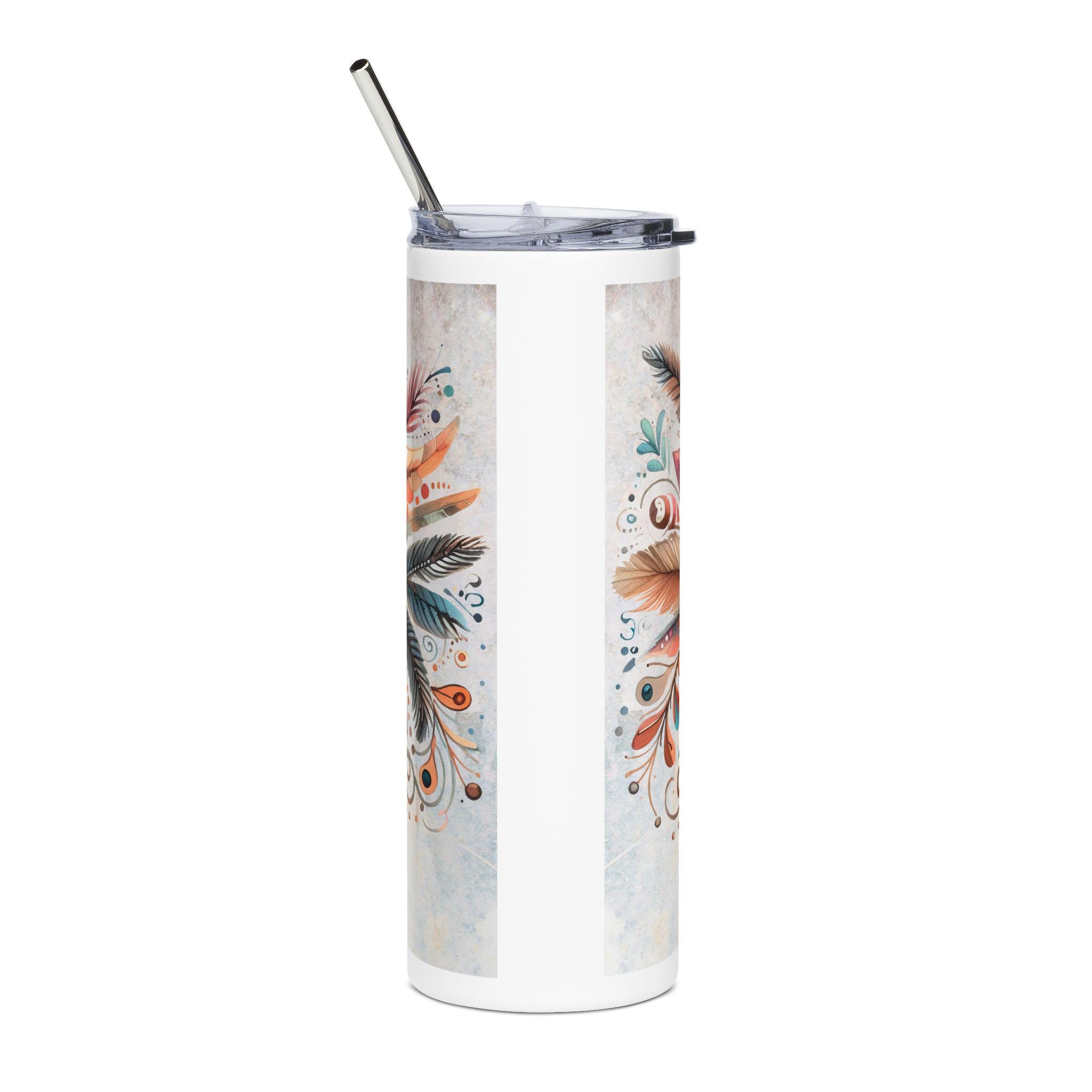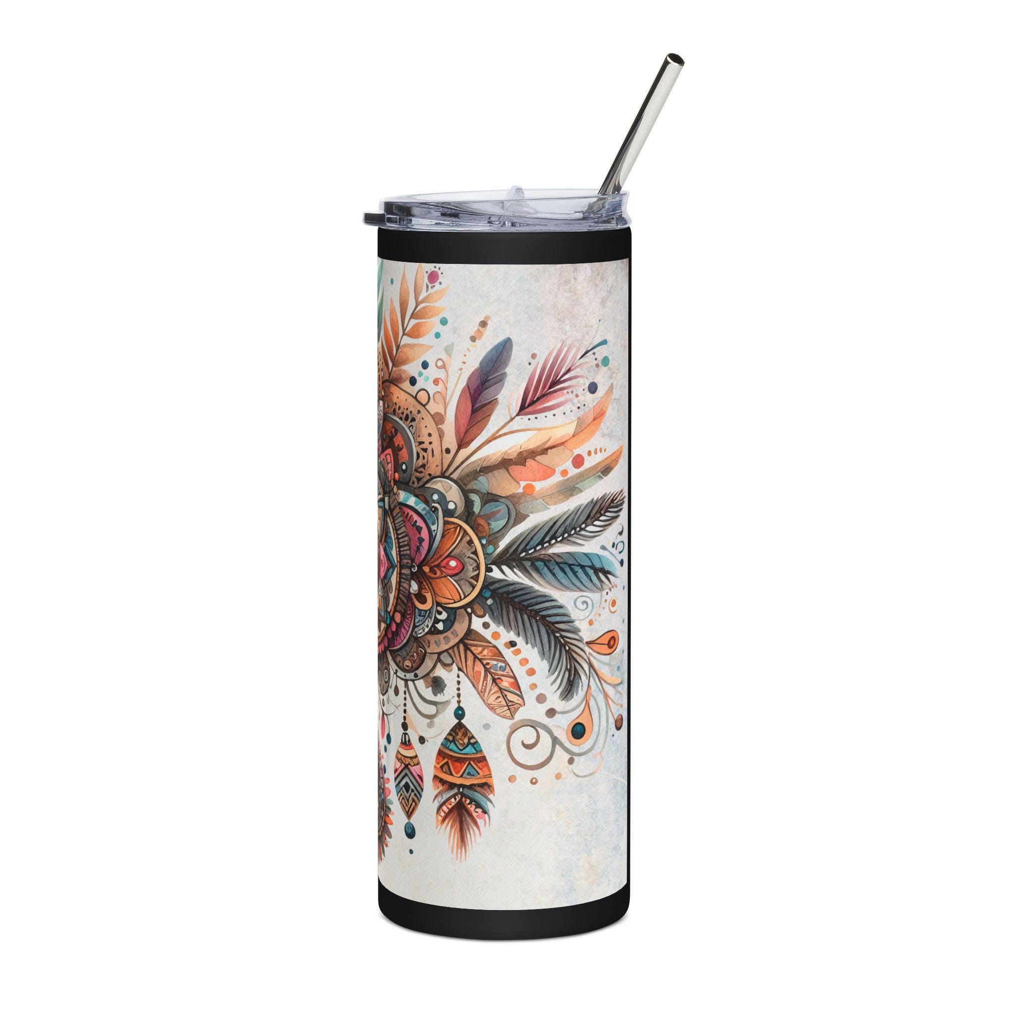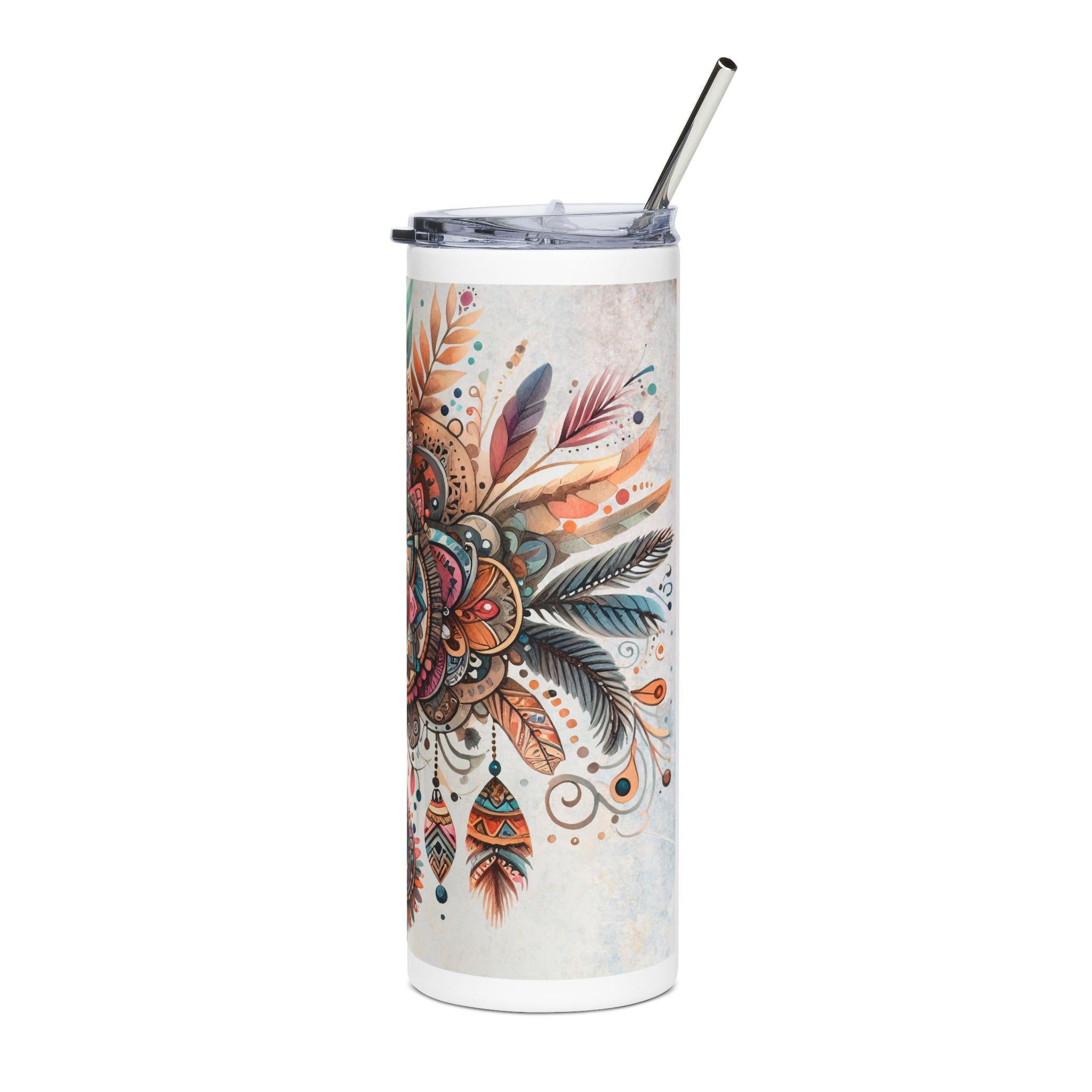 This 20oz stainless steel tumbler wraps a detailed boho-mandala illustration around its slim, cylindrical body. Warm terracotta, teal, and gold tones blend into hand-drawn feathers and jewel-like motifs that catch the eye without shouting. It feels like a quiet, colorful talisman for your daily routine — steady in the hand, keeping drinks at the right temperature while adding an artful pause to commutes, studio mornings, or long desk sessions. The glossy protective finish gives the artwork depth and keeps colors vibrant through regular use. Use it with the included lid and straw for easy sipping on the move or by your favorite window with a sketchbook and tea.