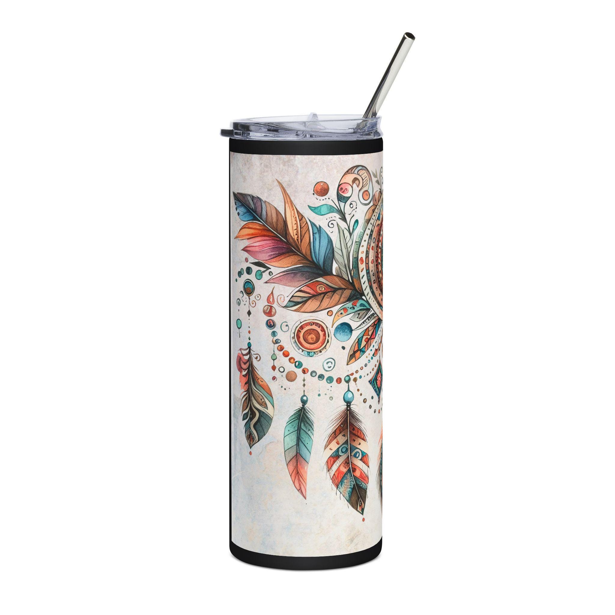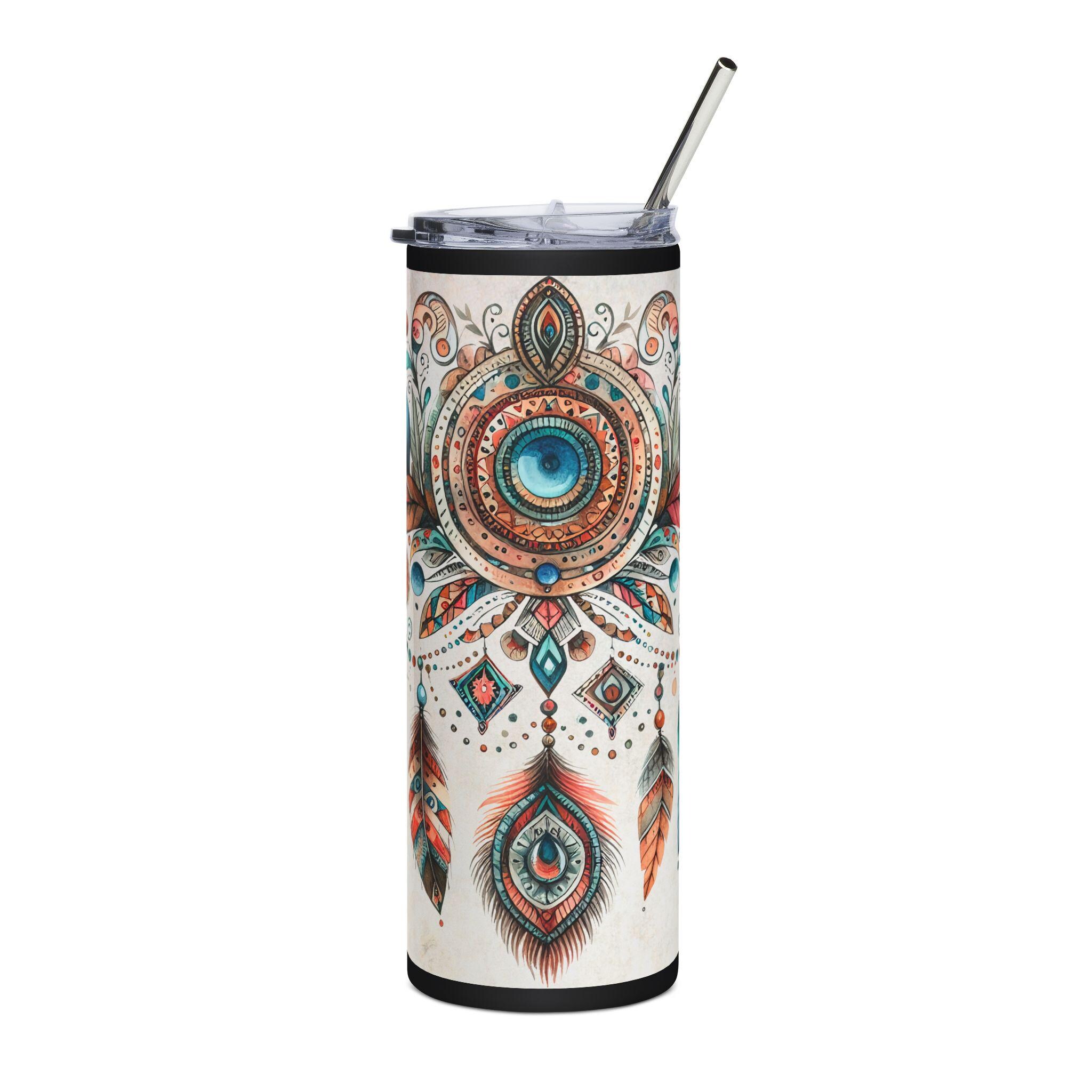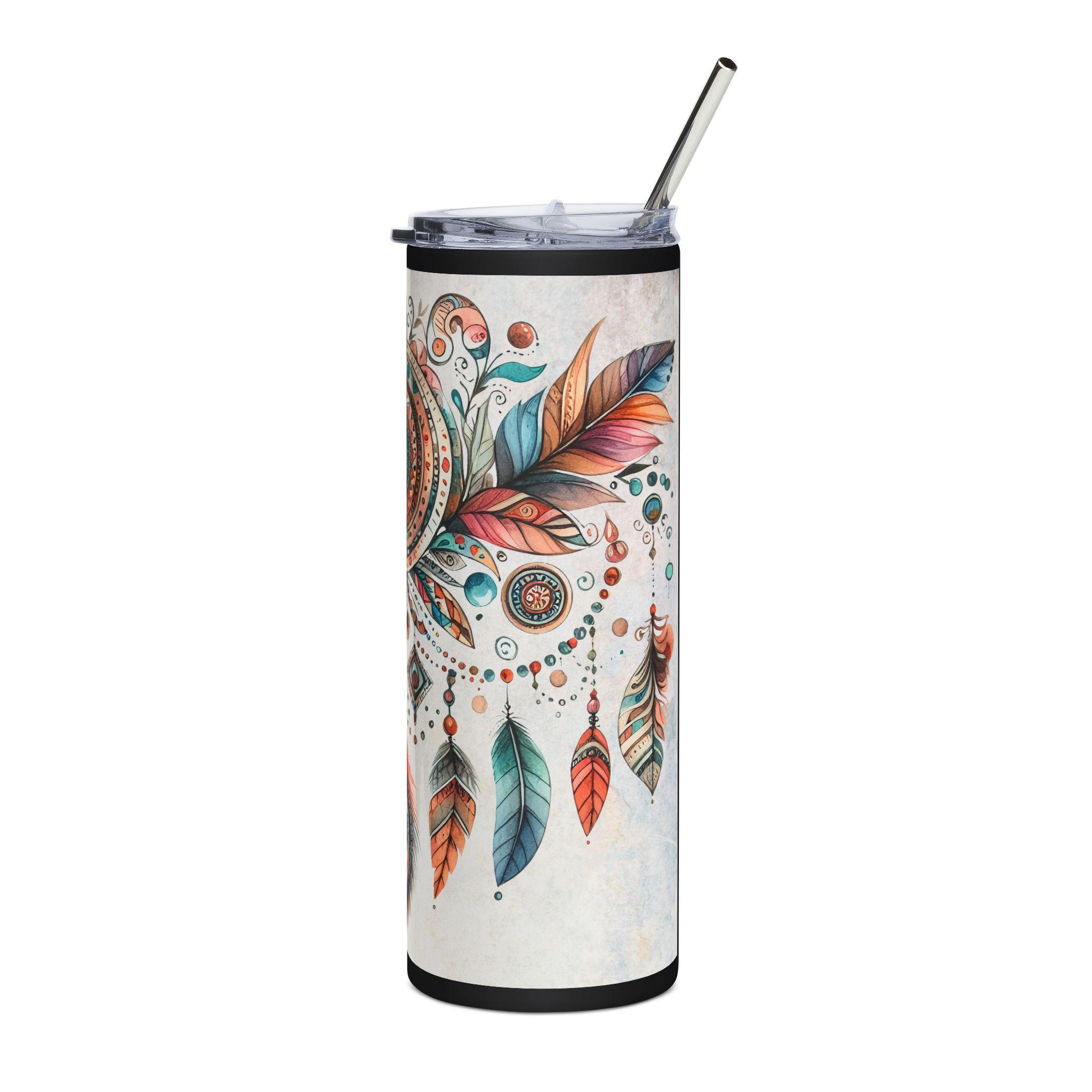 This slender 20 oz stainless steel tumbler carries a hand-painted dreamcatcher and feather motif that feels both earthy and spirited. Smooth to the touch with a glossy protective varnish, the design wraps fully around the cylindrical body so every angle reveals a new detail — teal and rust feathers, delicate beadwork, and an ornate central eye that draws the gaze. It’s made to travel with you: slim enough for cup holders, topped with a clear lid and reusable straw, and built from high-grade stainless steel that resists rust. Bring it to morning markets, long drives, or quiet porch hours — it keeps your drink contained and your style quietly expressive.