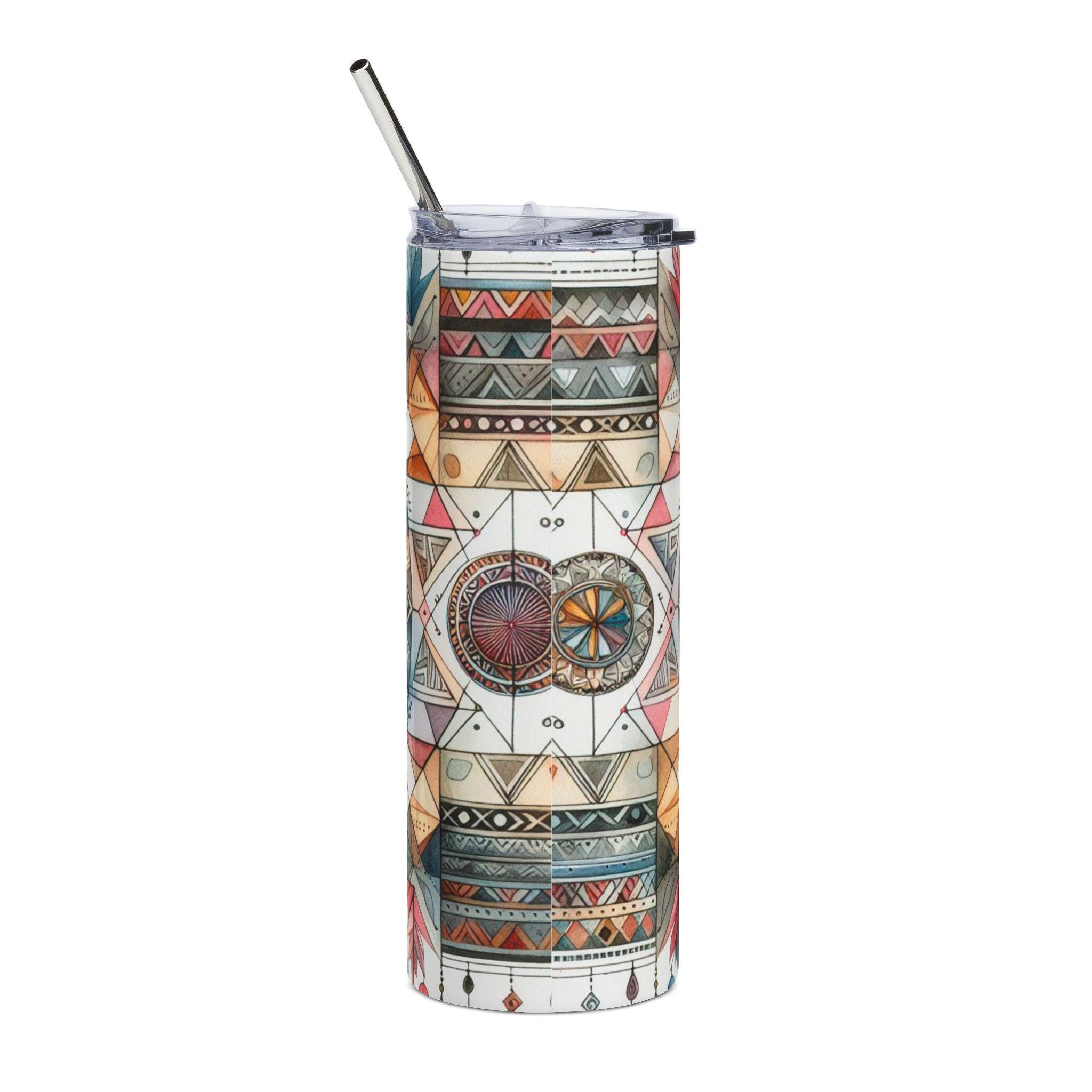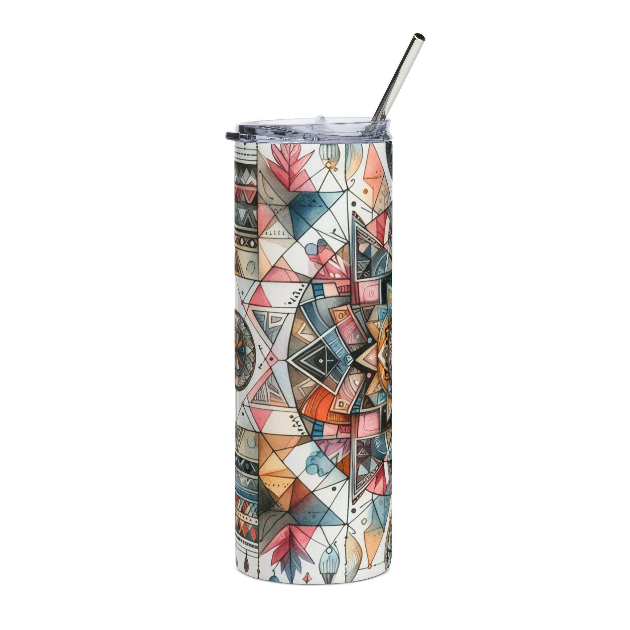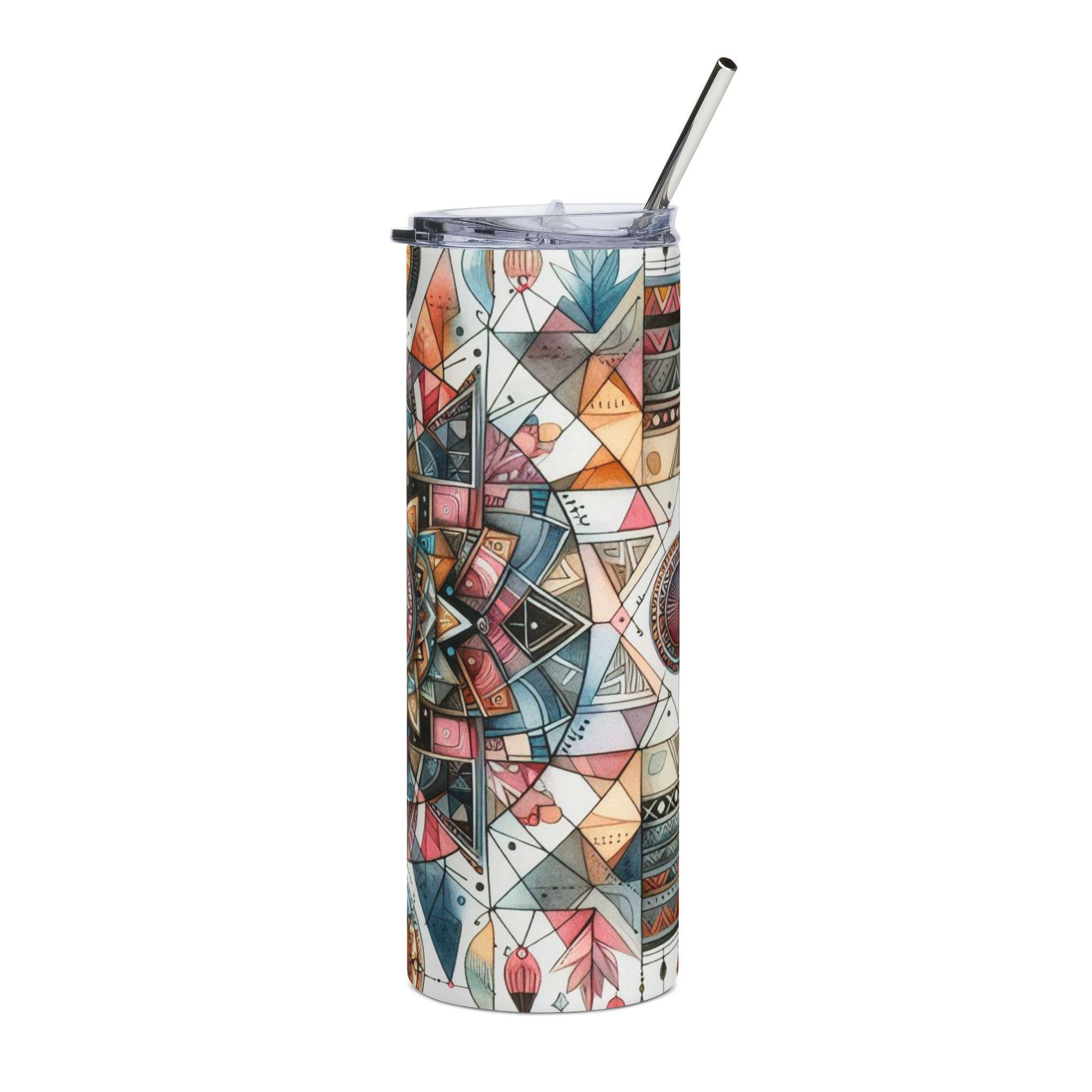 A slim, artful stainless steel tumbler that brings color and calm to every sip. Lightweight and sturdy, this 20 oz tumbler wraps a continuous, hand-drawn mandala and geometric pattern around its full 360° printable surface. The glossy varnish highlights watercolor tones—muted teals, warm ochres, and soft rose—while the clear lid and stainless straw make it an easy companion for morning commutes, studio sessions, or long stretches at the desk. It feels both grounded and inspired—made to move with you and keep drinks insulated, spill-resistant, and stylishly personal.