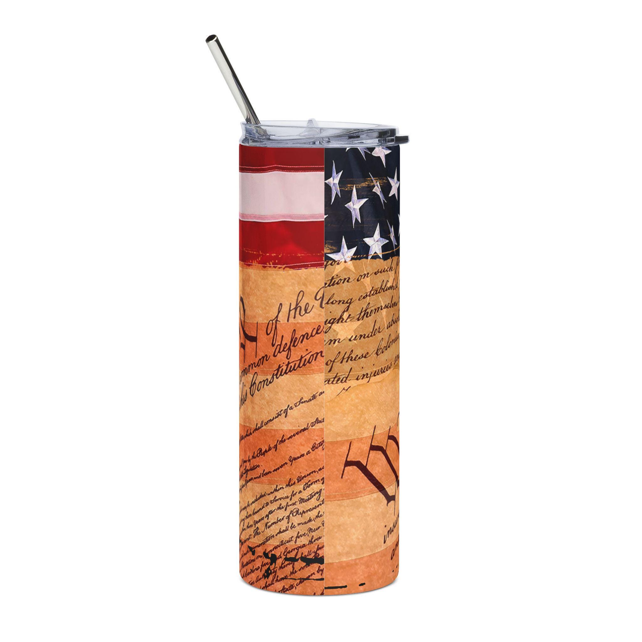 This 20 oz stainless steel tumbler carries a warm, lived-in American spirit — an aged parchment script of the Constitution layered beneath a waving flag. It feels like an heirloom you can take on the road: solid and weighty in the hand, finished with a glossy protective coat that deepens the vintage tones. The slender cylinder slips into most cup holders and comes with a clear lid and stainless straw, so you can sip while driving, standing at a parade, or settling in for a long day of errands. It’s built to resist rust and keep your drink contained, while the full 360° print wraps the story around the tumbler’s body so the imagery reads from every angle.