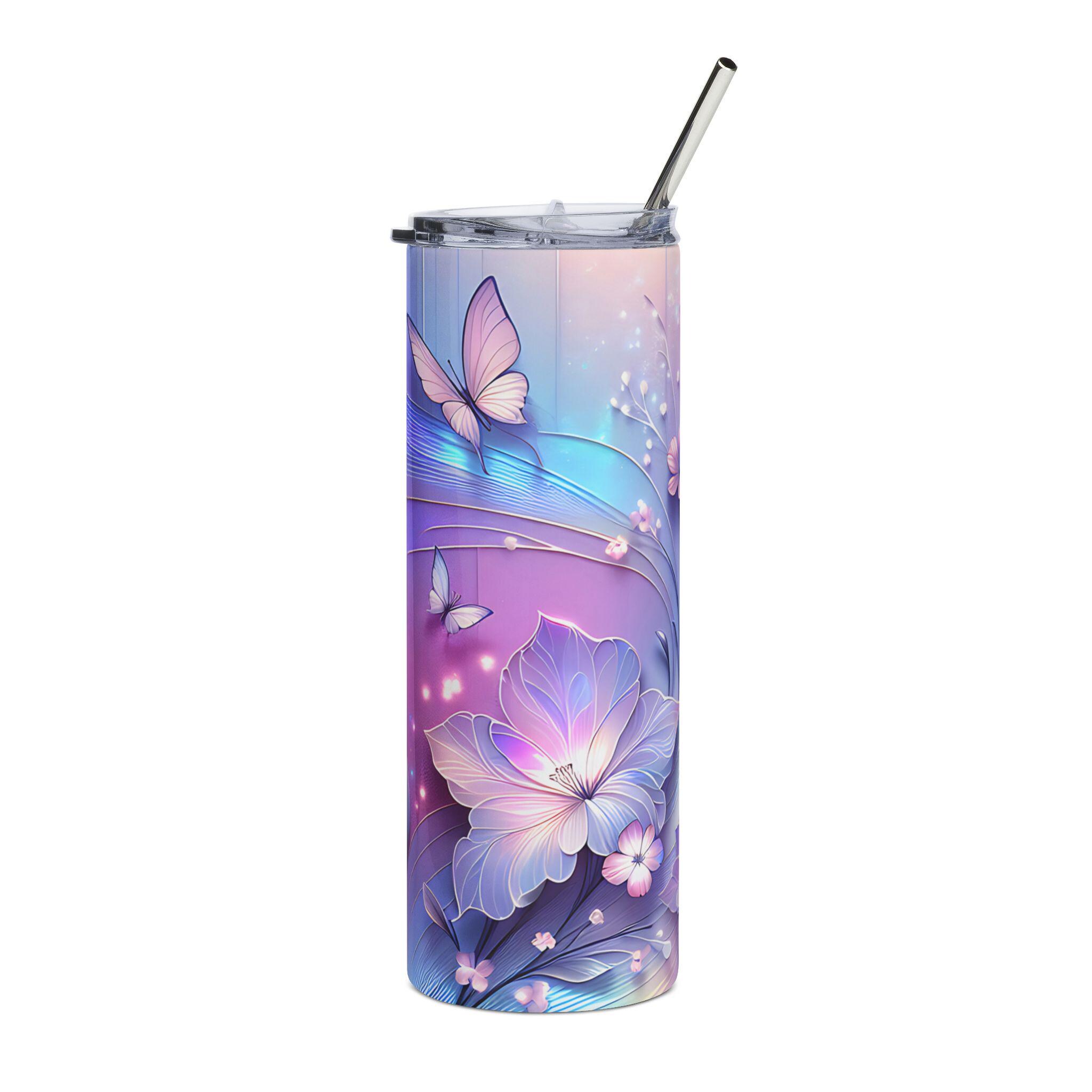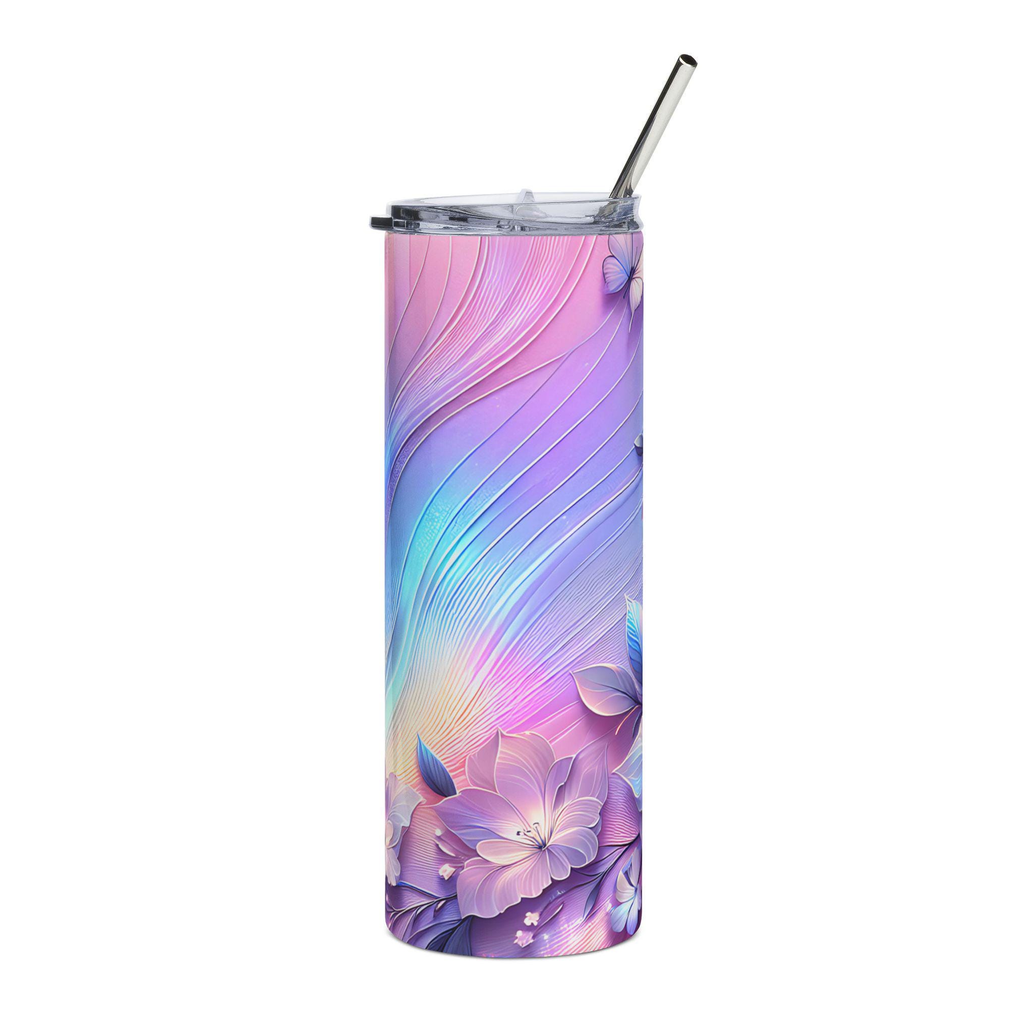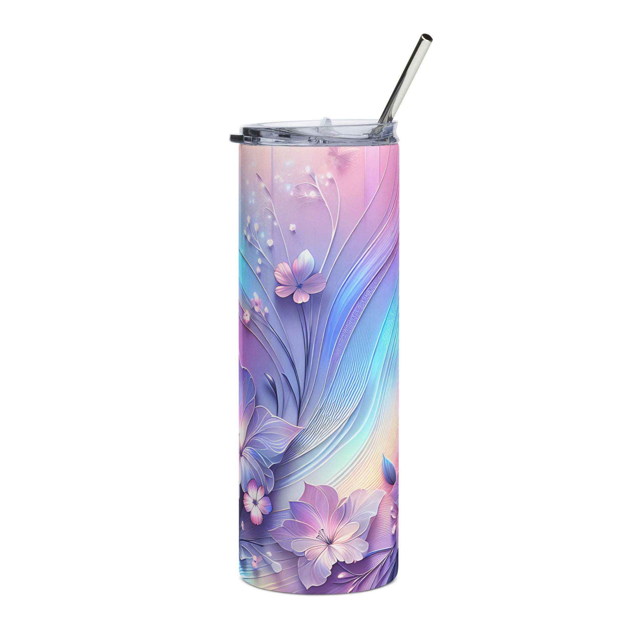 This 20 oz stainless steel tumbler brings a soft, dreamy energy to your daily routine. The slim, cylindrical silhouette is wrapped in a watercolor-like floral design where pastel purples, pinks, and blues flow together like a quiet morning sunrise. It feels light and gentle in your hand yet built to last—rust-resistant steel, a glossy protective finish, and a snug lid with a reusable straw make it a companion for long commutes, studio sessions, or slow afternoons on the porch. The artwork wraps 360°, so the delicate blossoms and fluttering butterfly are visible from every angle, turning a simple sip into a small, calming moment.