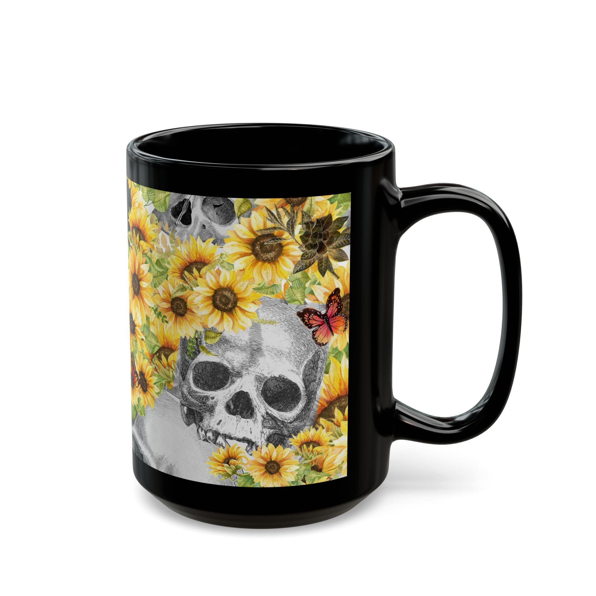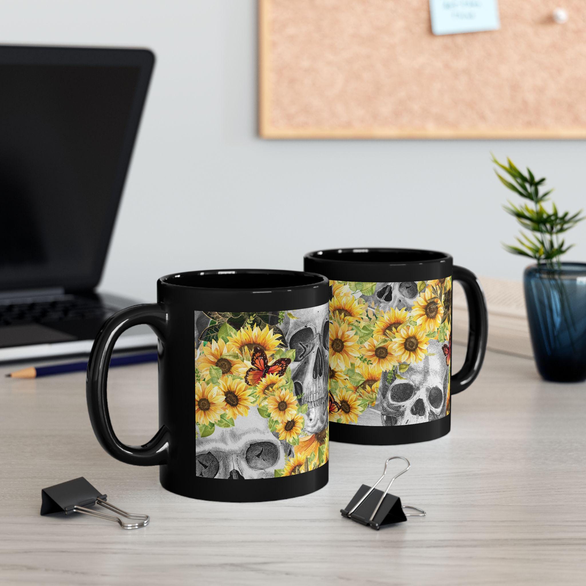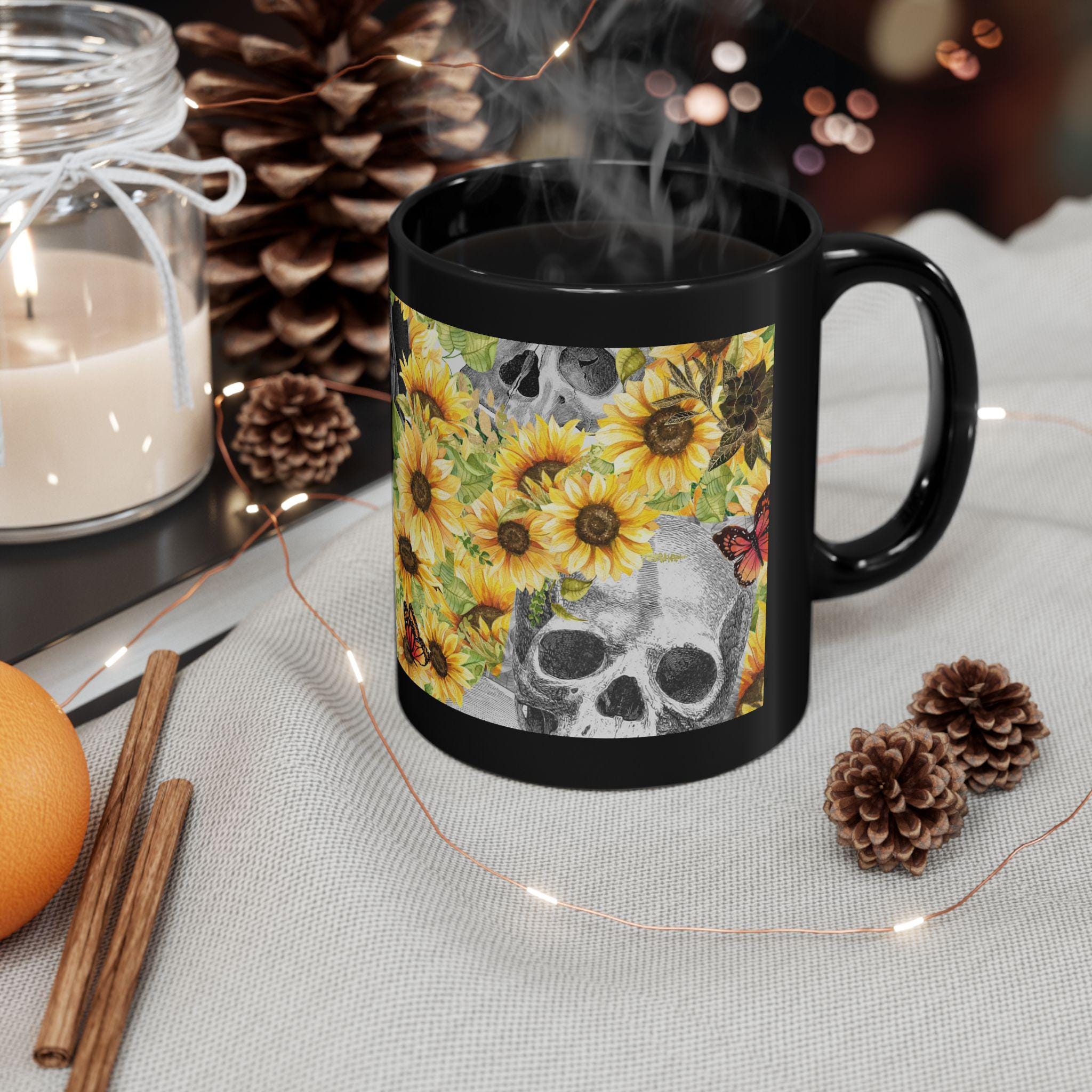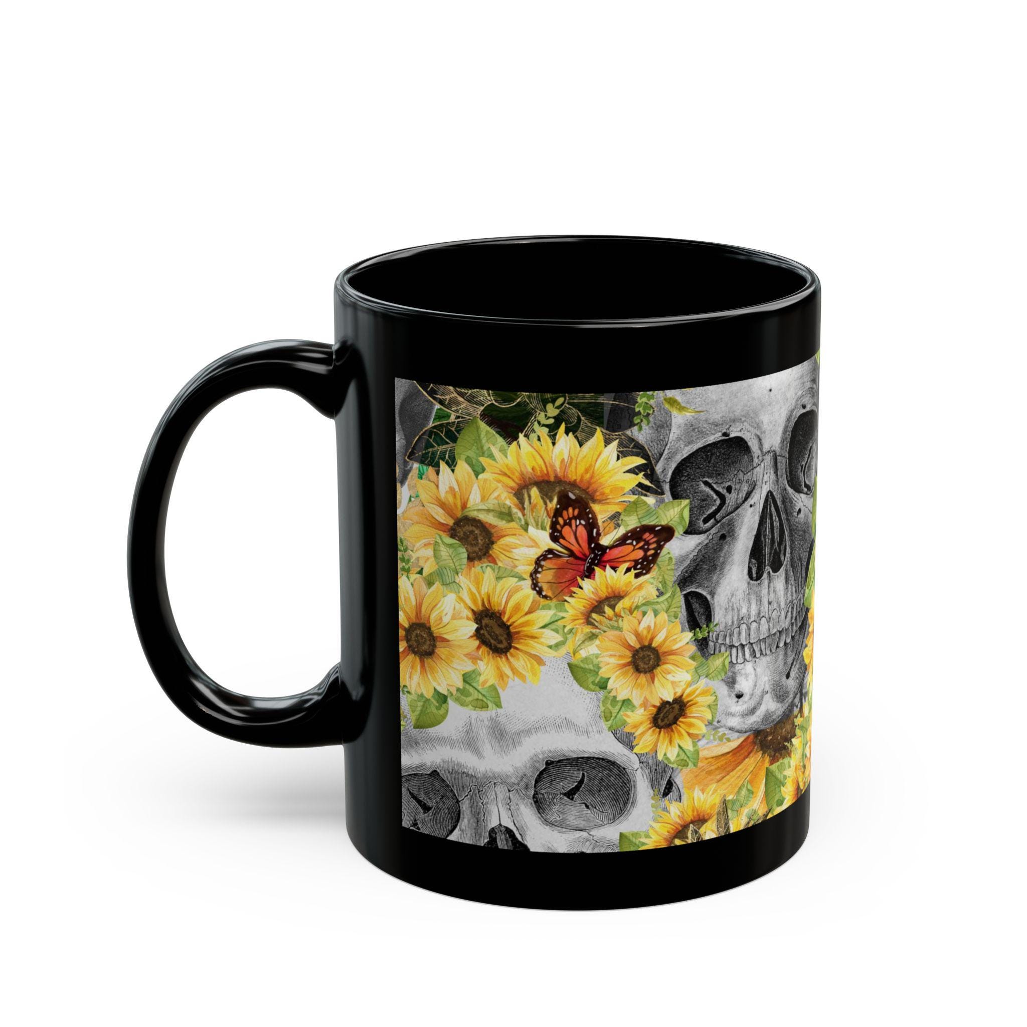 Warm, dark, and unexpectedly bright — this glossy black ceramic mug blends edgy skull art with a cascade of sunflowers and a tiny butterfly for a look that feels like afternoon sunlight through an old, secret garden. The high-contrast print wraps around the mug so the design reads from every angle. Hold it by the comfortable C-handle as the black glaze deepens the artwork’s shadows and makes the yellows pop. It carries quiet, slightly gothic charm for morning coffee, late-night tea, or a desk-side moment of calm and contrast.