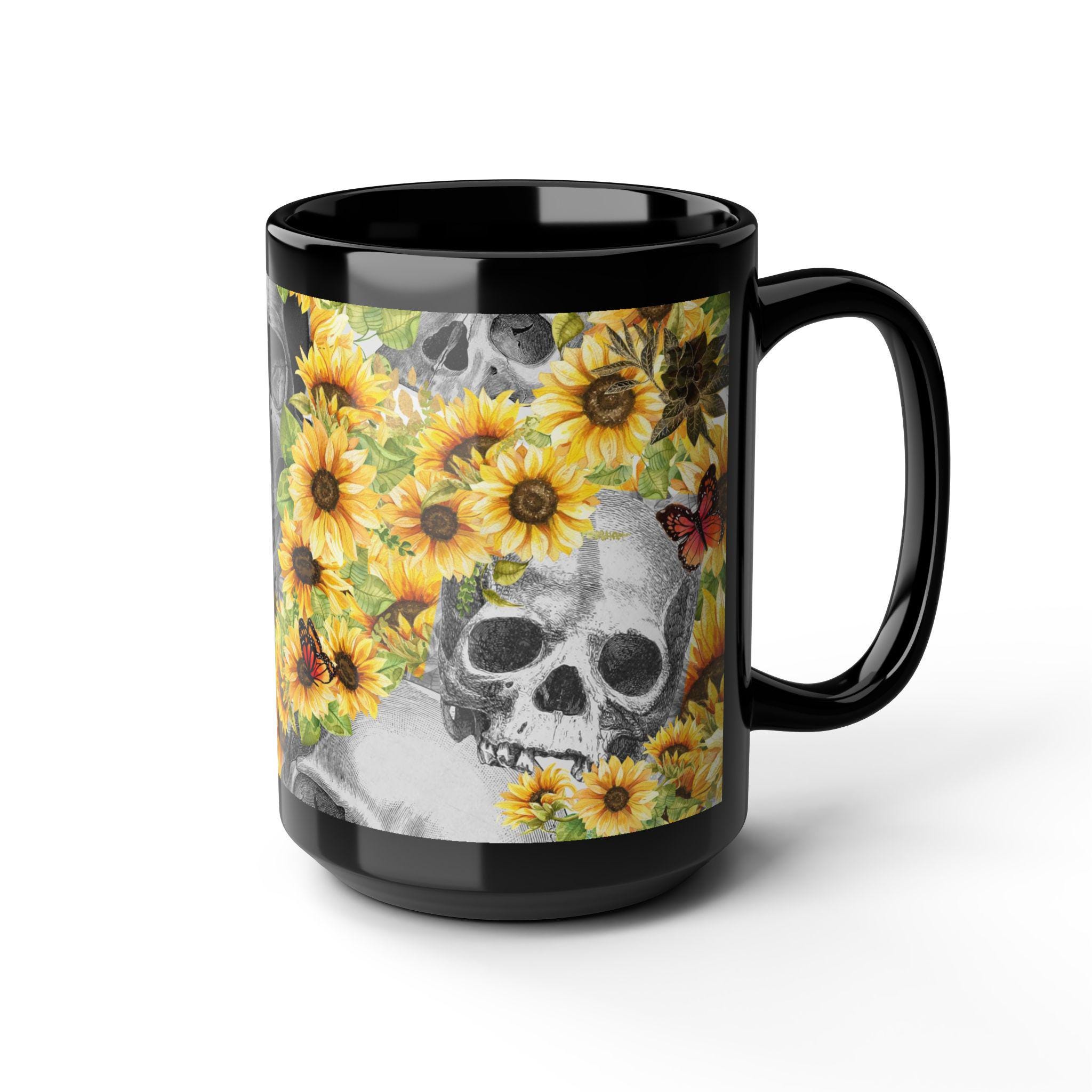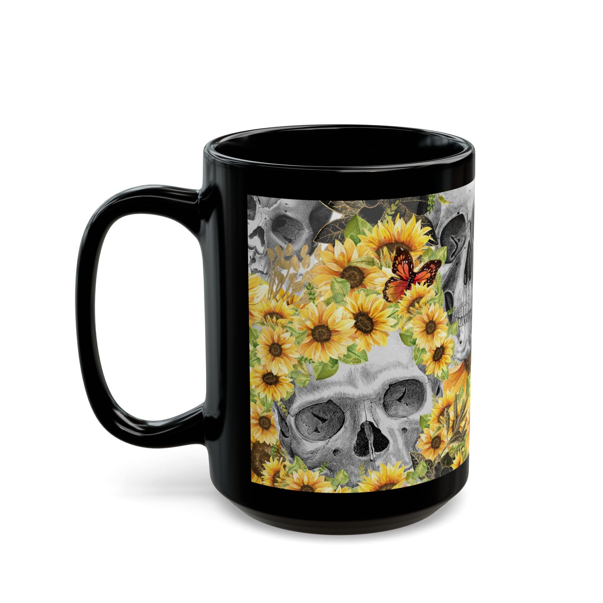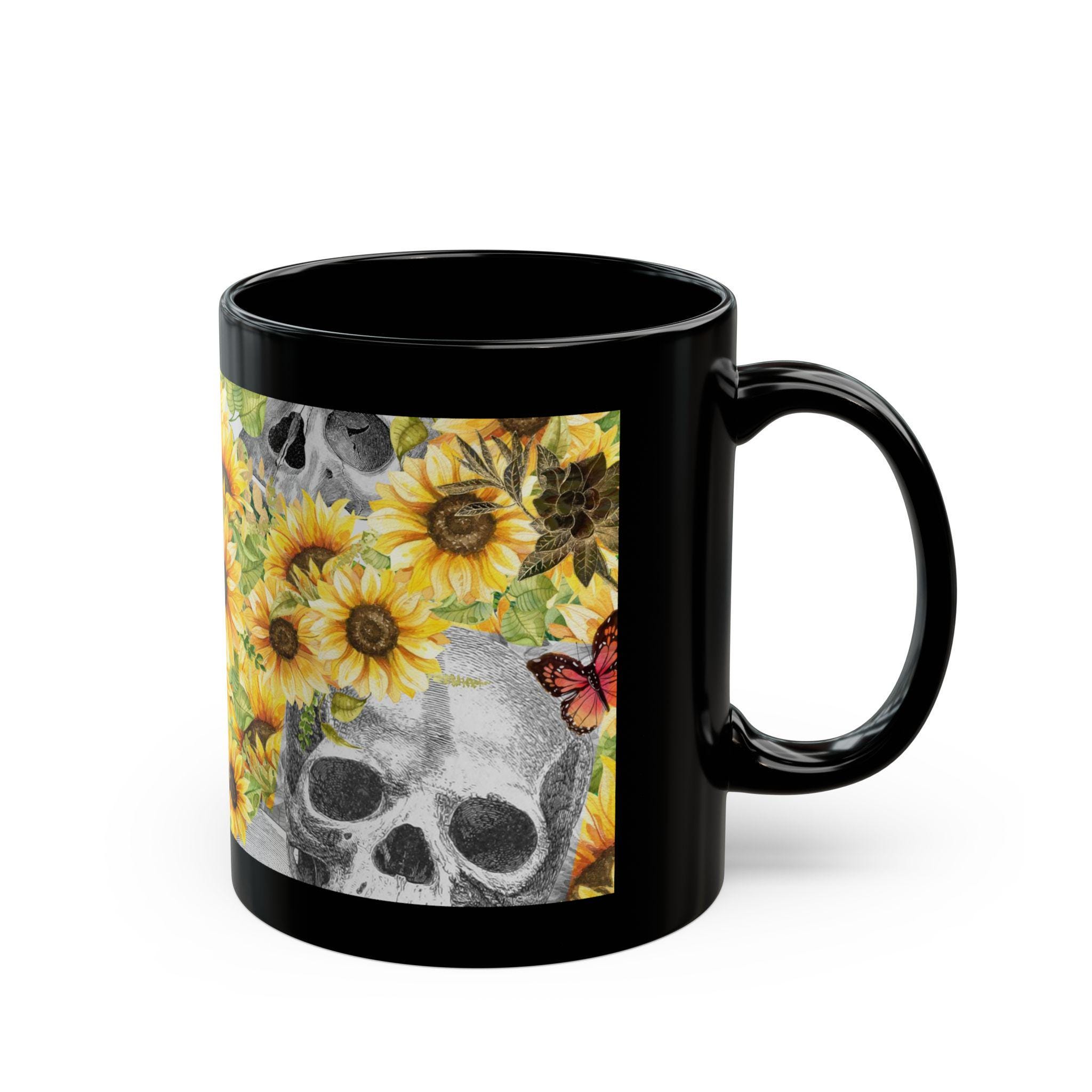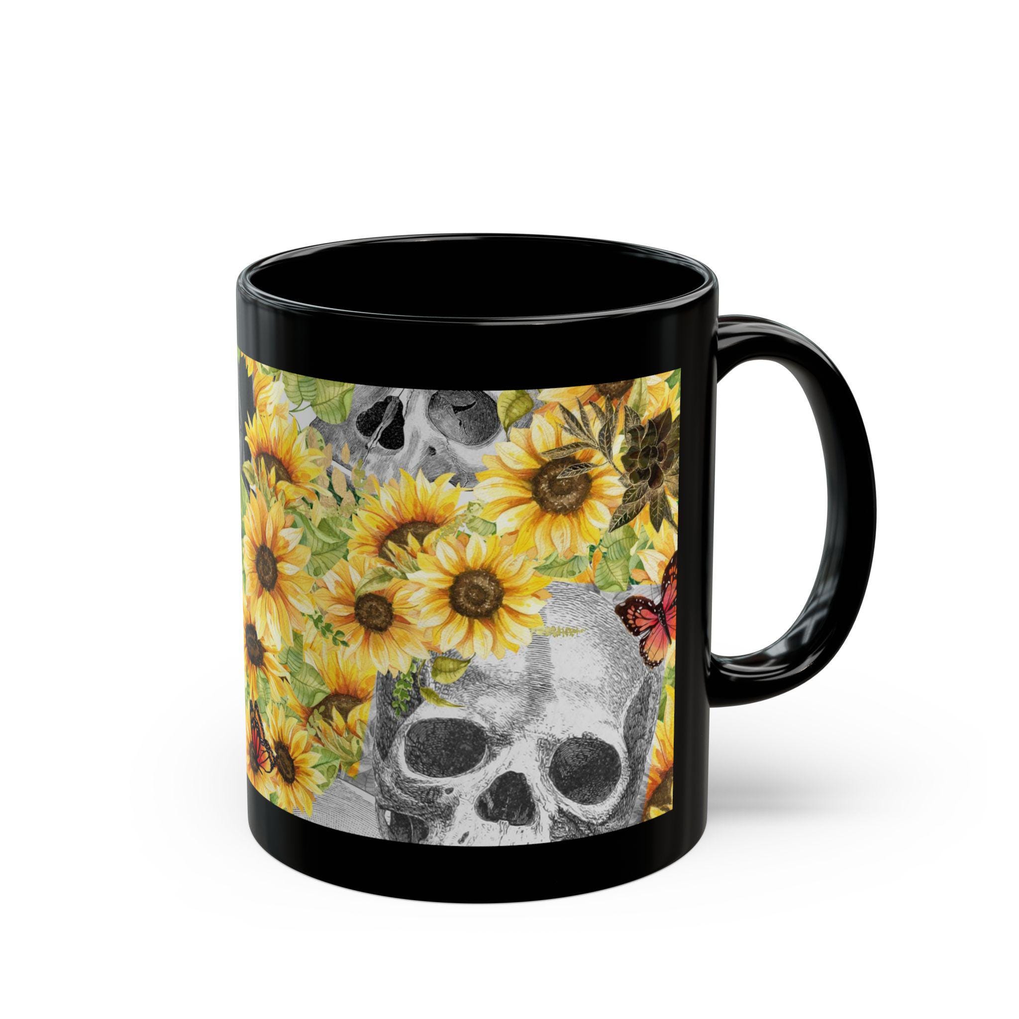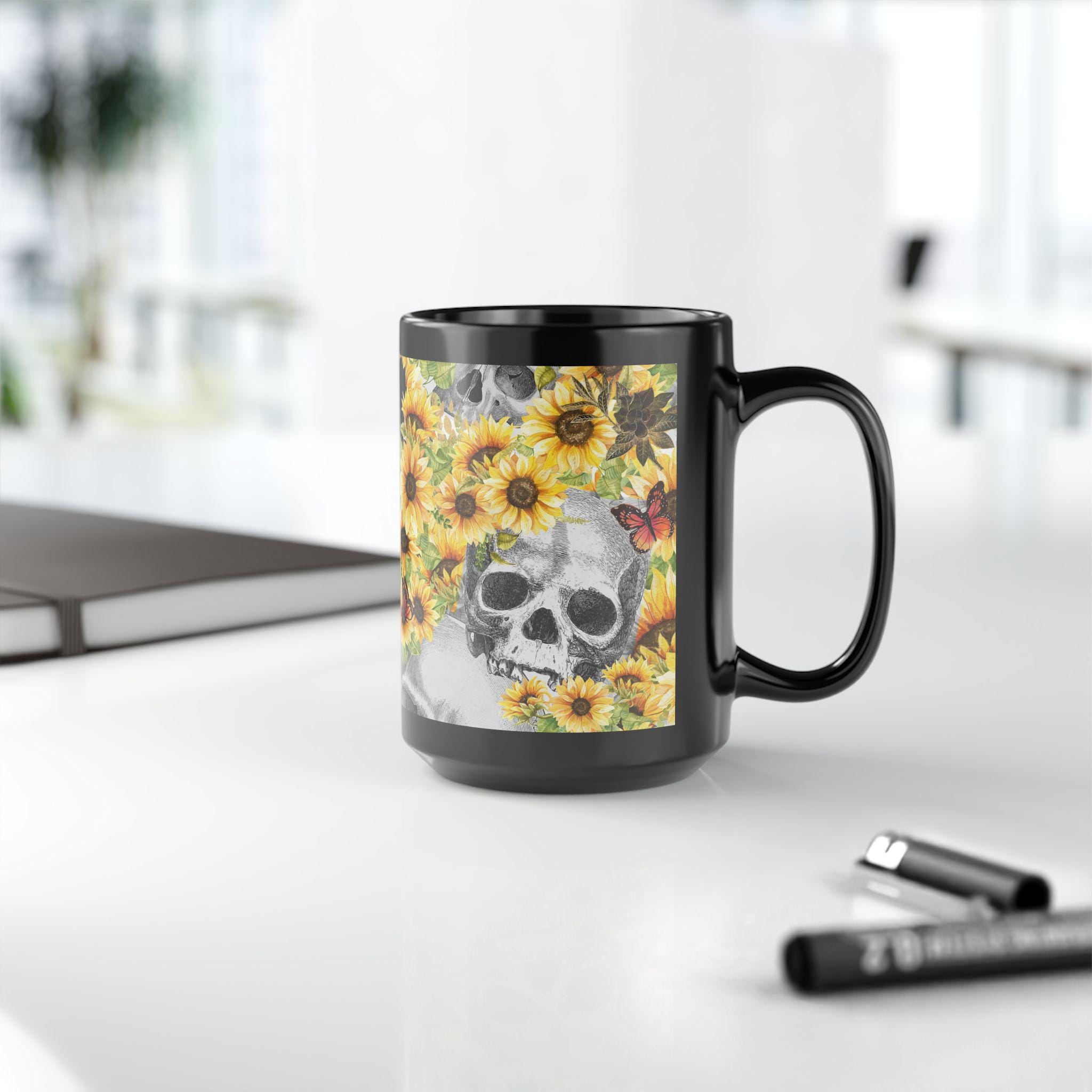 Warm, dark, and unexpectedly bright — this glossy black ceramic mug blends edgy skull art with a cascade of sunflowers and a tiny butterfly for a look that feels like afternoon sunlight through an old, secret garden. The high-contrast print wraps around the mug so the design reads from every angle. Hold it by the comfortable C-handle as the black glaze deepens the artwork’s shadows and makes the yellows pop. It carries quiet, slightly gothic charm for morning coffee, late-night tea, or a desk-side moment of calm and contrast.