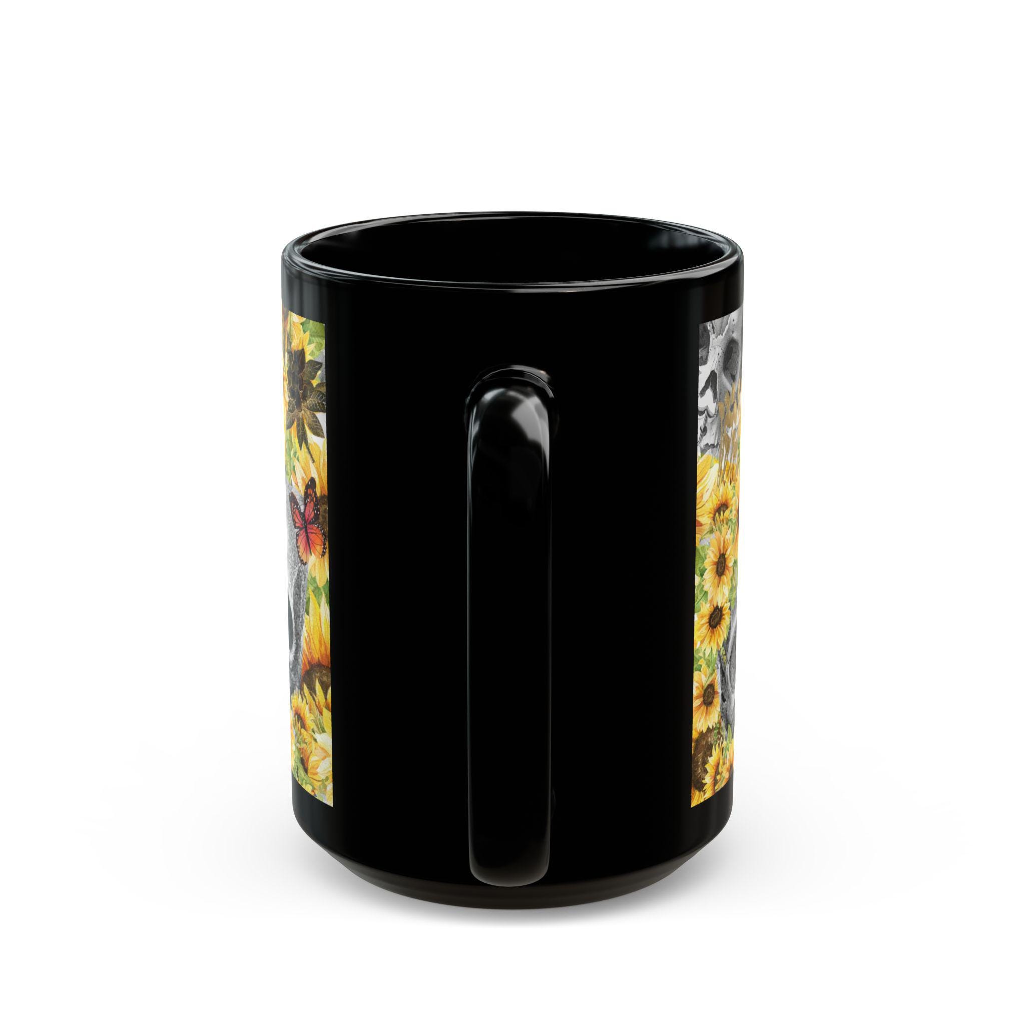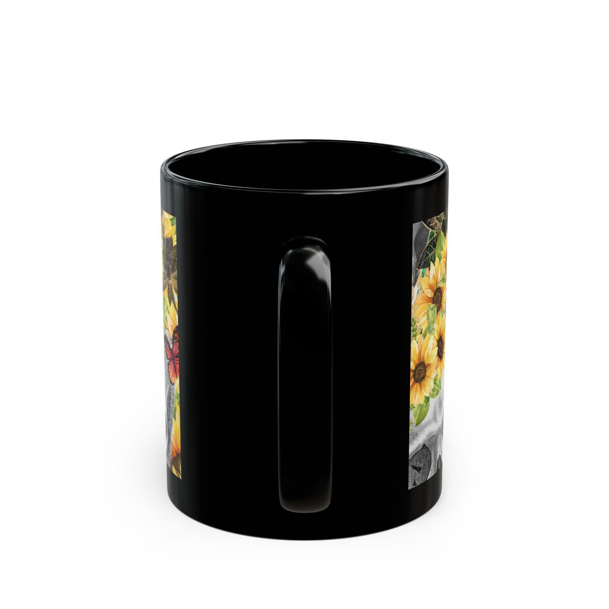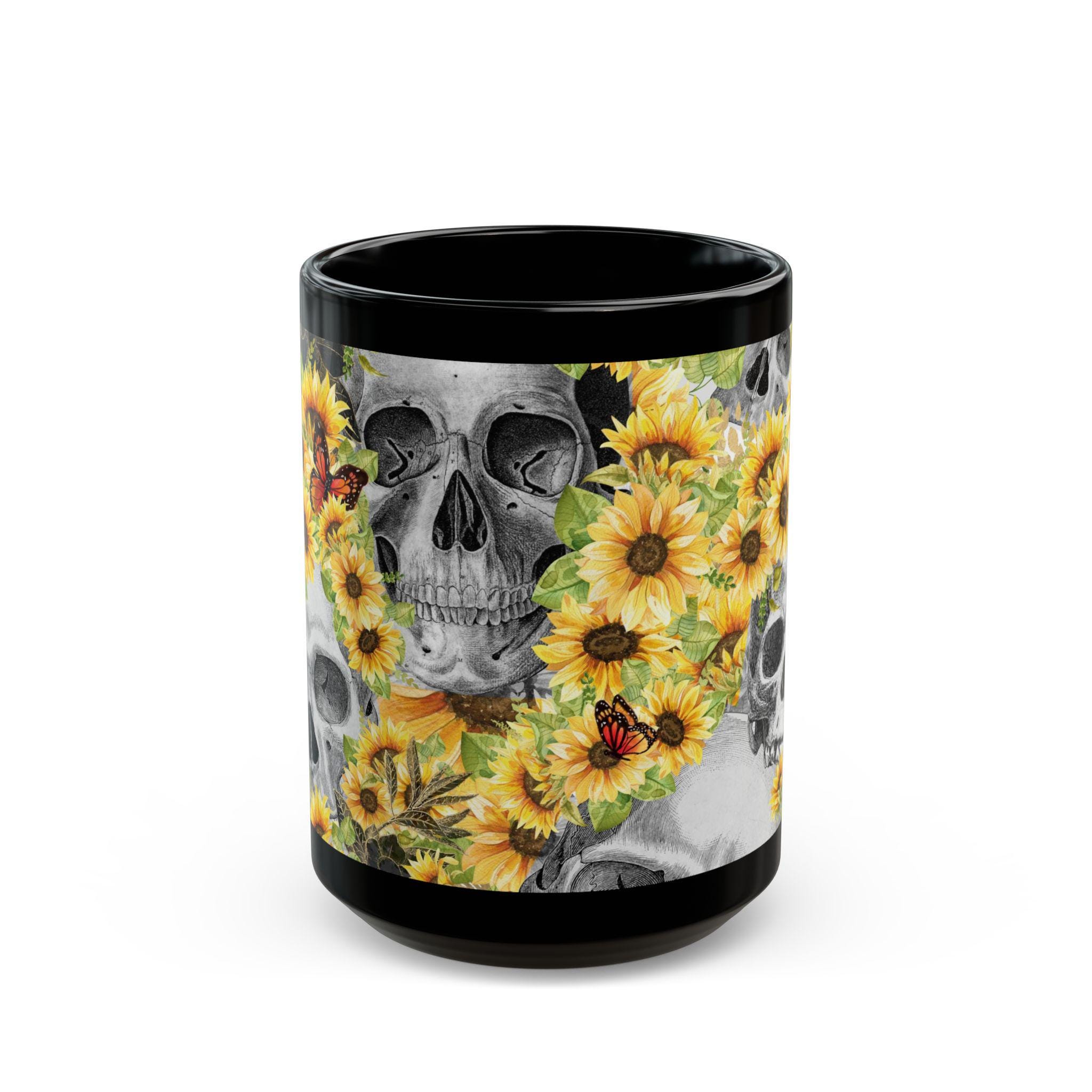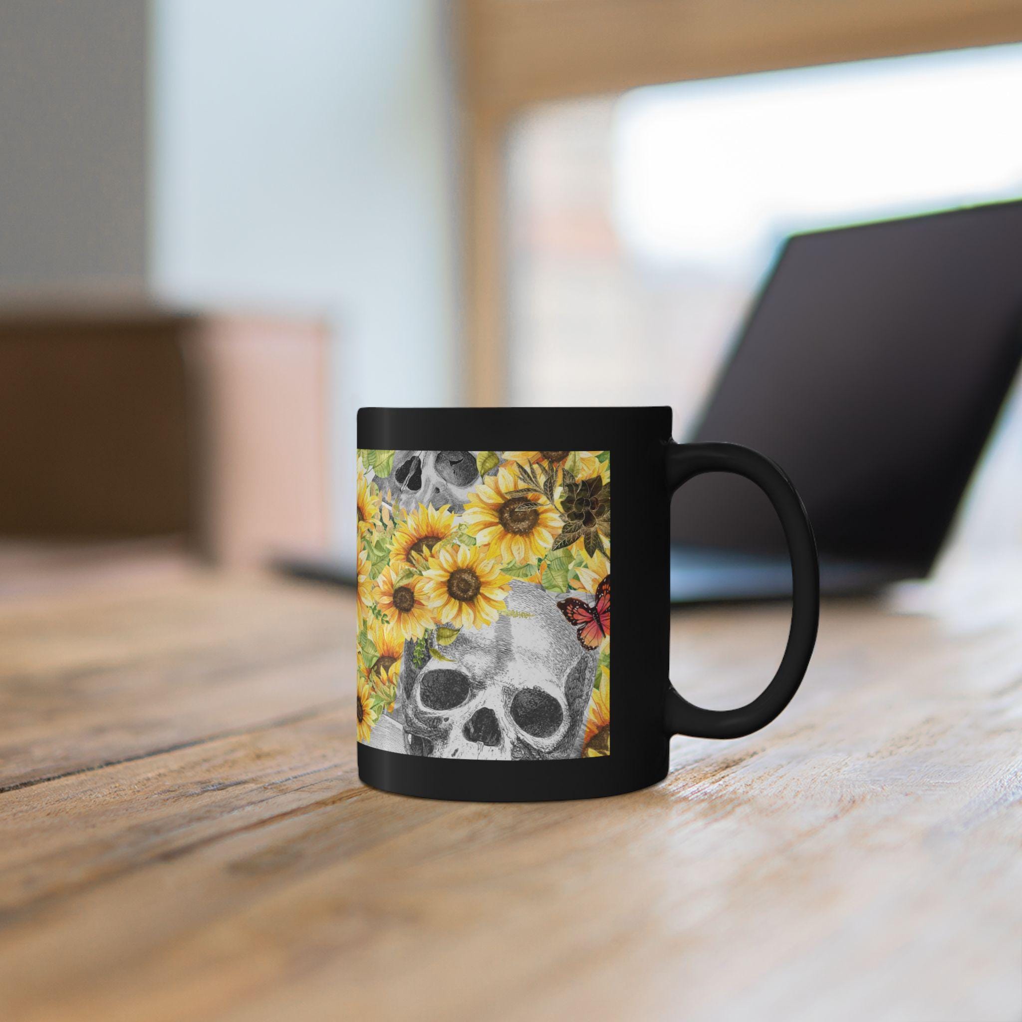 Warm, dark, and unexpectedly bright — this glossy black ceramic mug blends edgy skull art with a cascade of sunflowers and a tiny butterfly for a look that feels like afternoon sunlight through an old, secret garden. The high-contrast print wraps around the mug so the design reads from every angle. Hold it by the comfortable C-handle as the black glaze deepens the artwork’s shadows and makes the yellows pop. It carries quiet, slightly gothic charm for morning coffee, late-night tea, or a desk-side moment of calm and contrast.