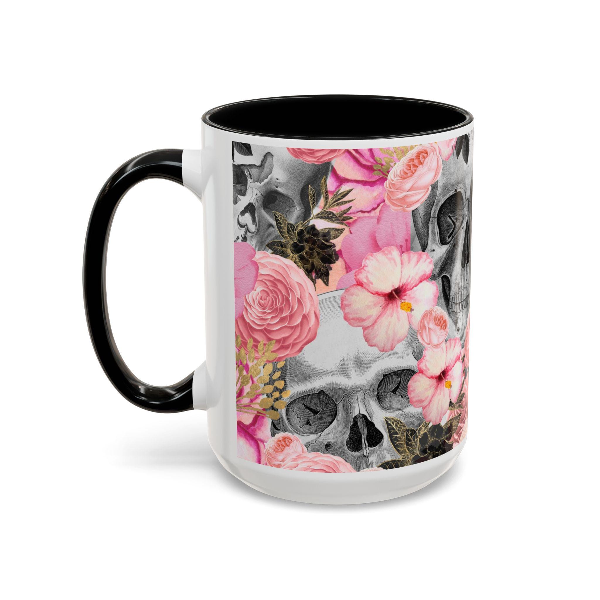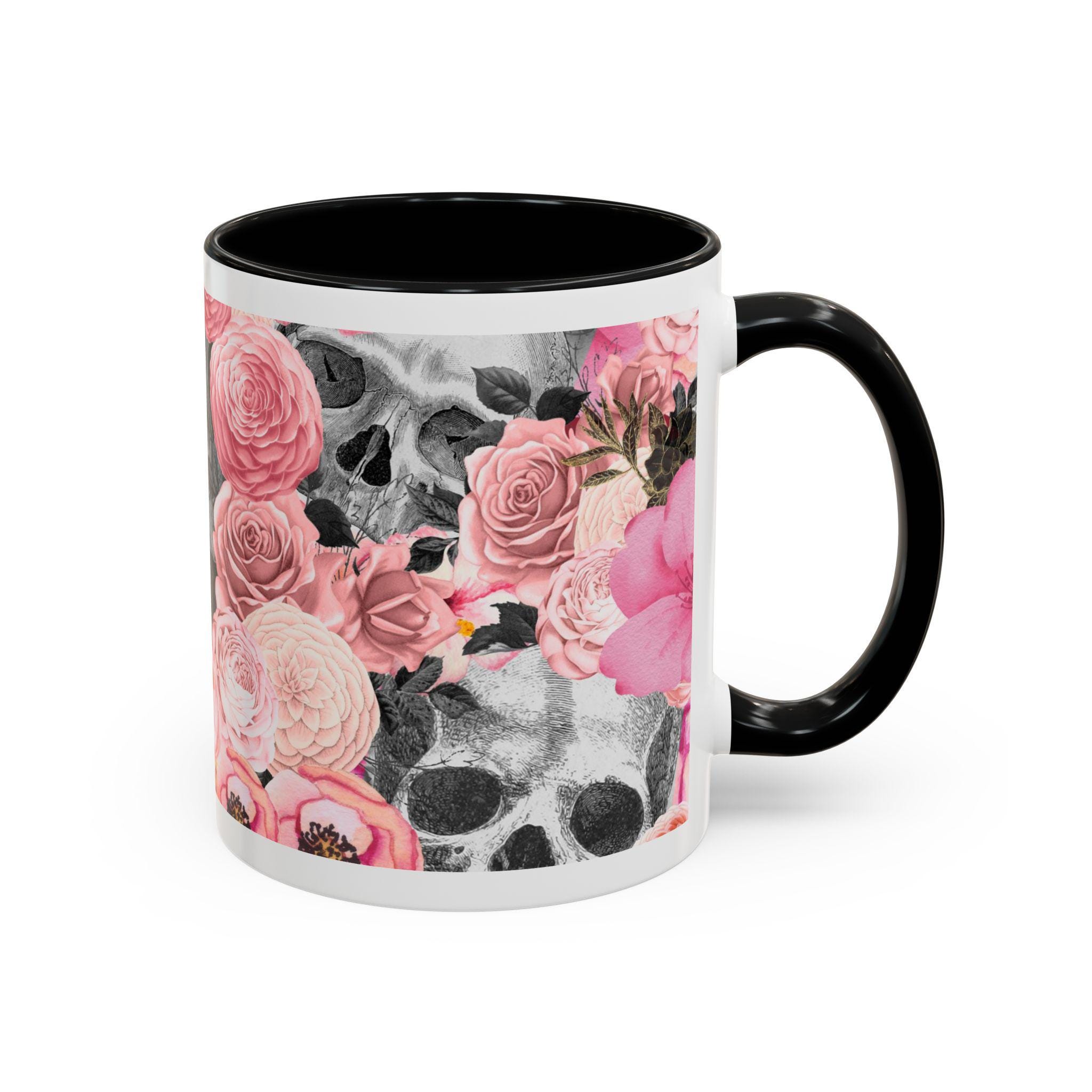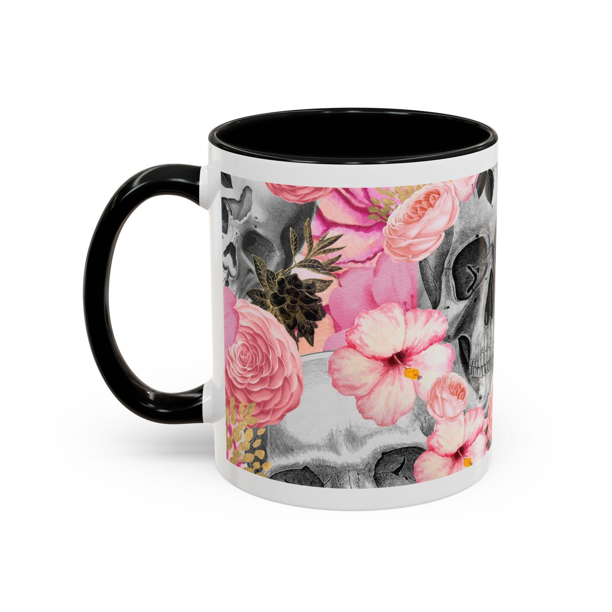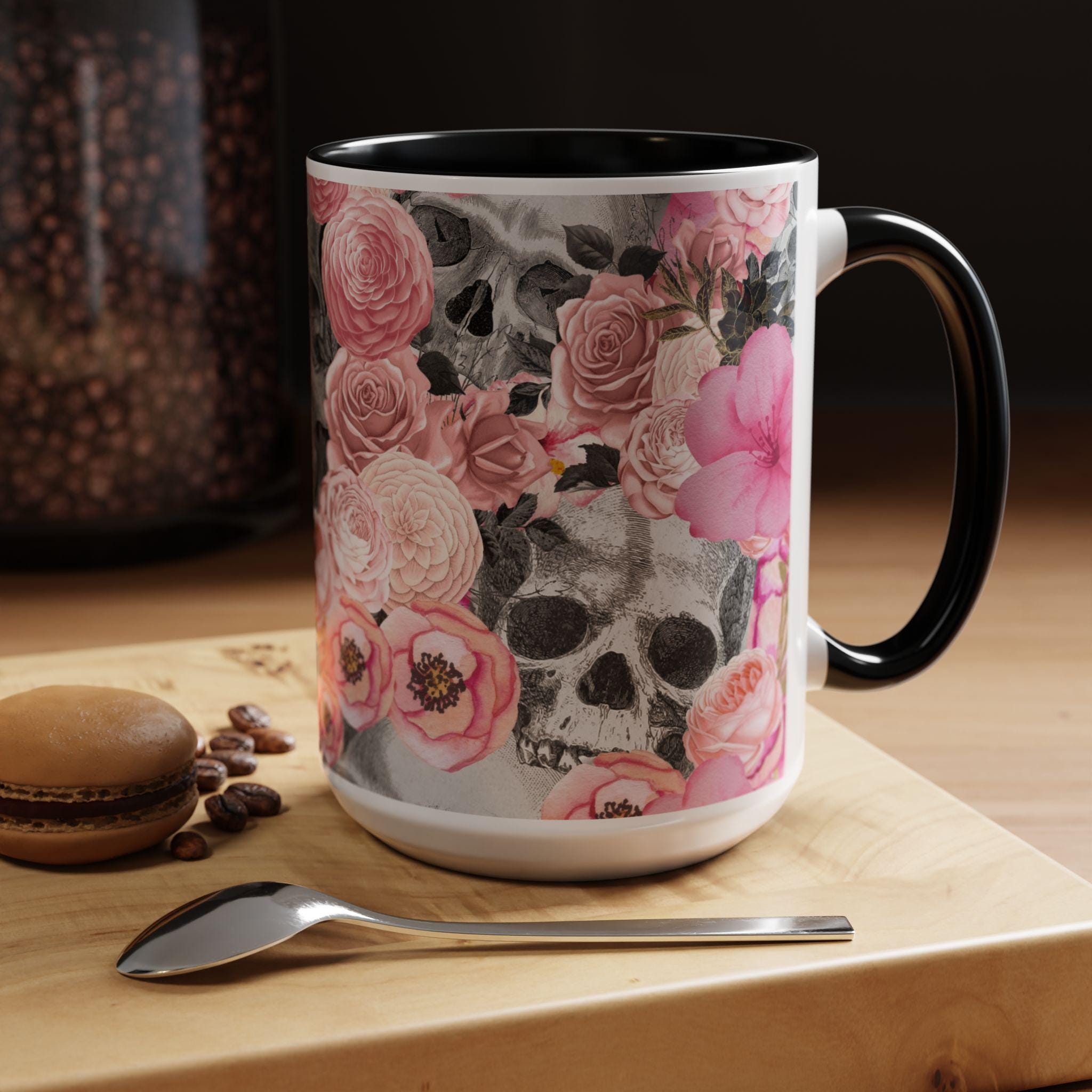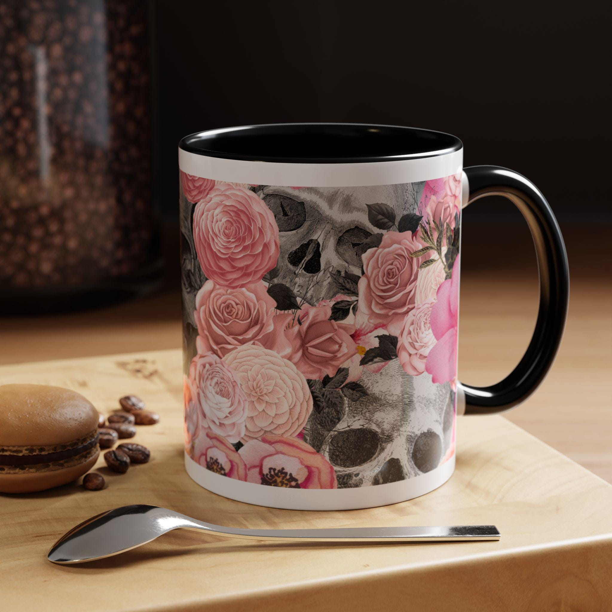 Sip from something a little dark and a little romantic. This ceramic mug pairs a soft, blush floral bouquet with a charcoal skull peeking through the petals — a gentle reminder of contrast and beauty. It feels like morning coffee on a quiet windowsill after a late-night art session. The glossy finish and bold color contrast give each sip a small, cinematic moment.