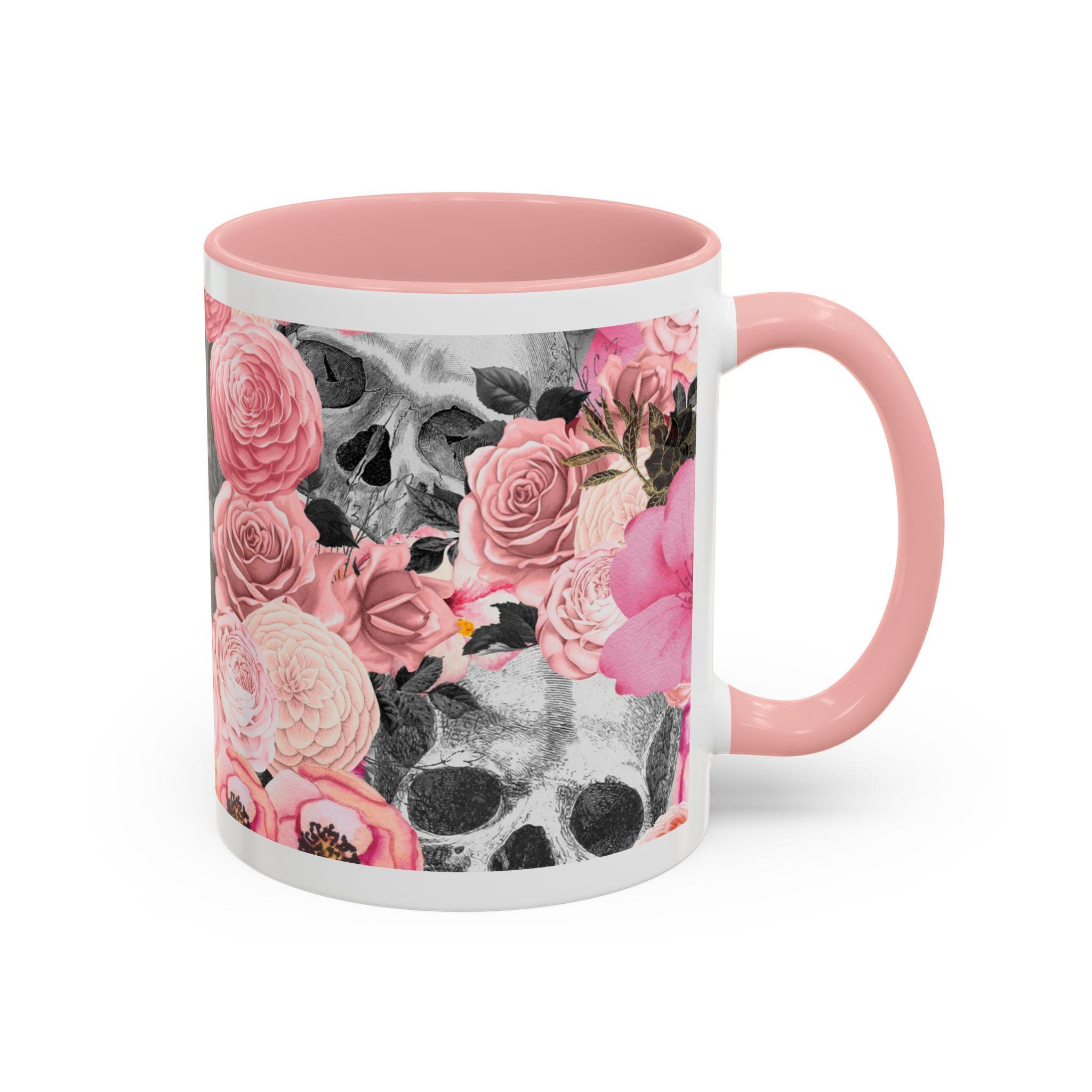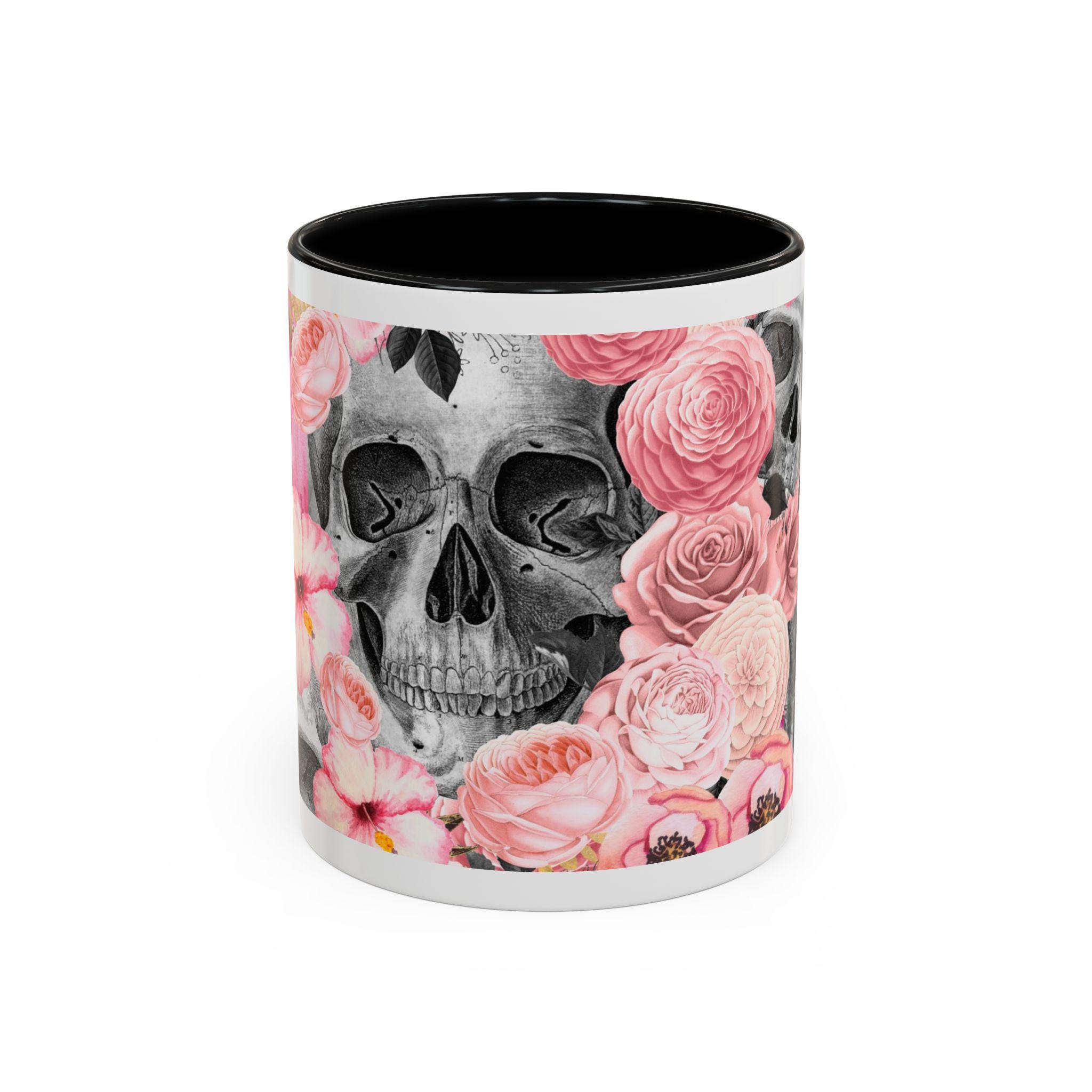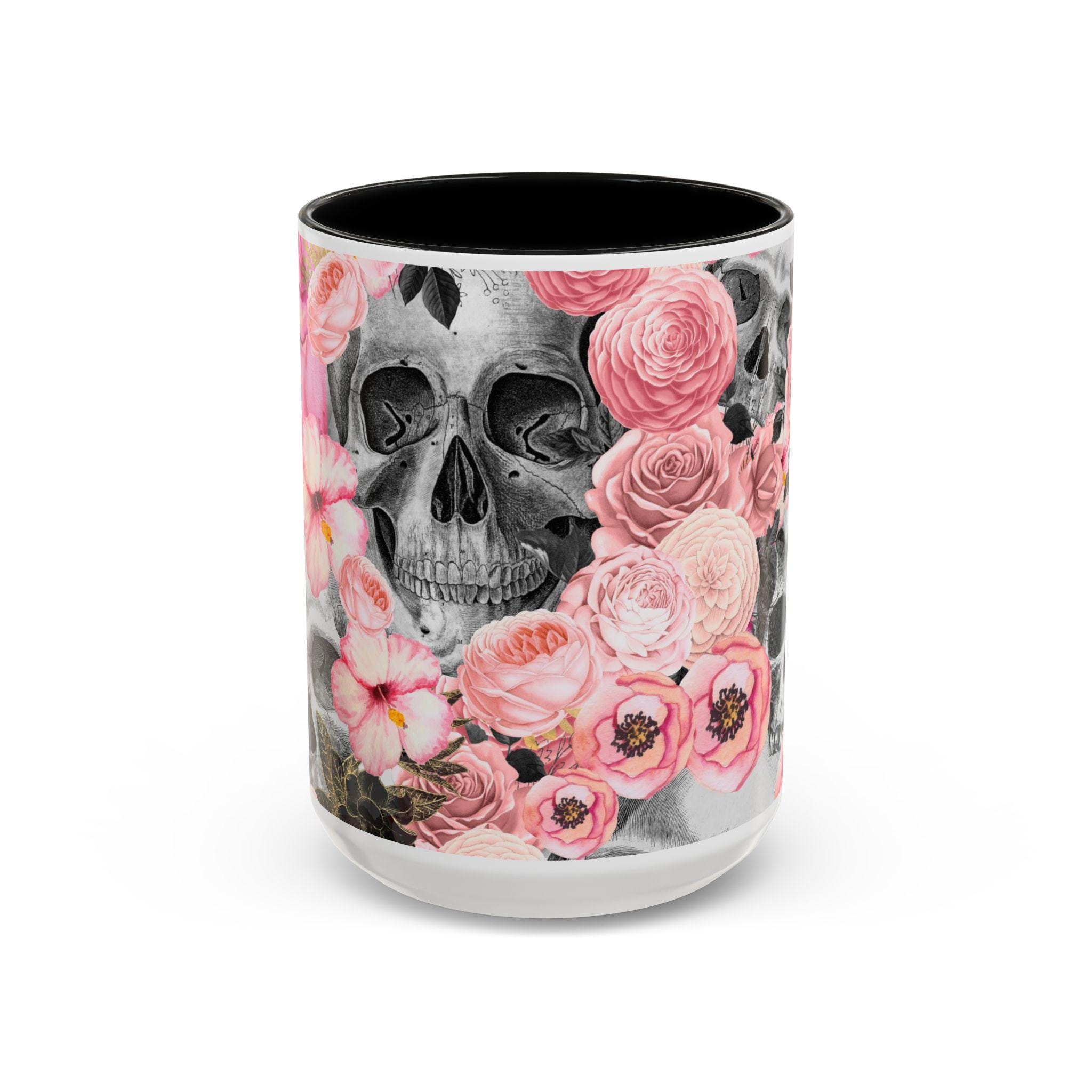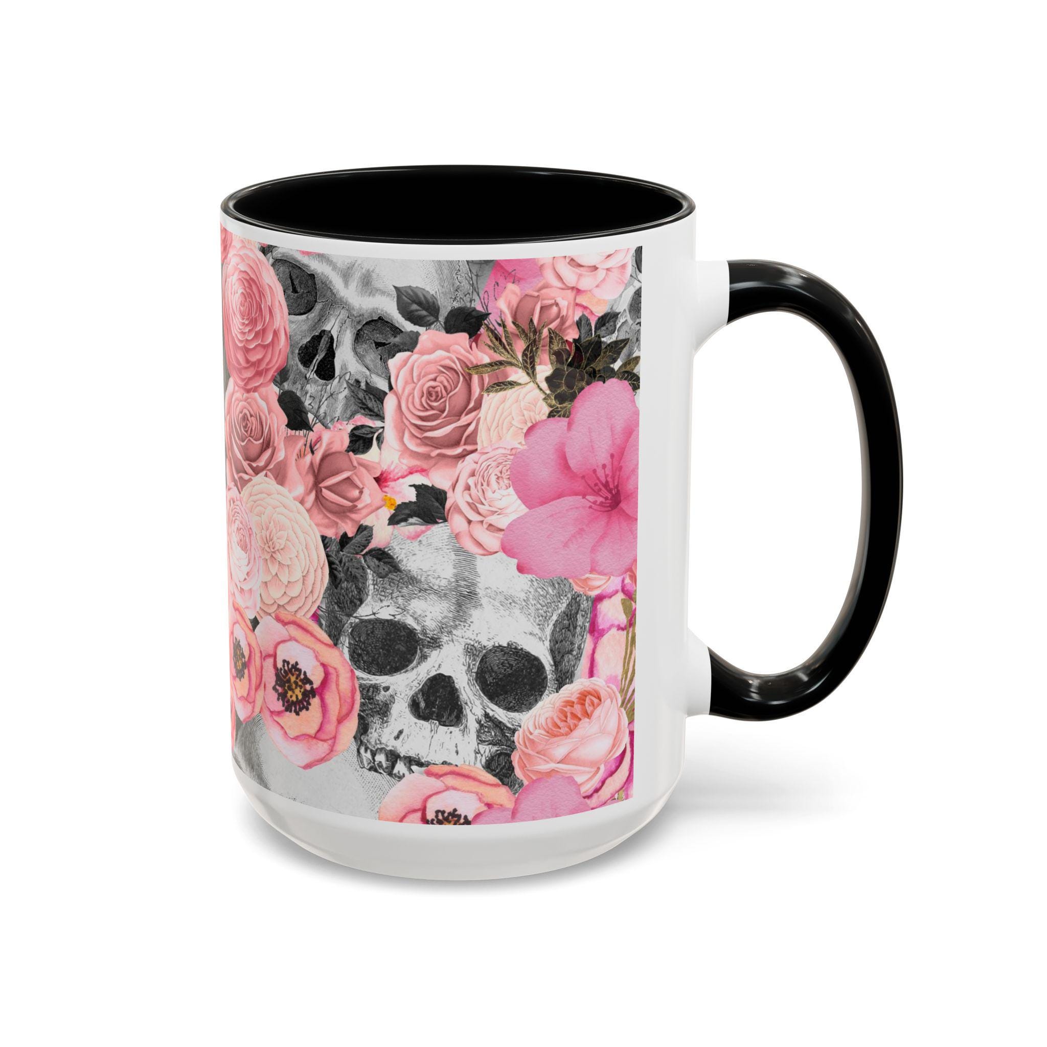 Sip from something a little dark and a little romantic. This ceramic mug pairs a soft, blush floral bouquet with a charcoal skull peeking through the petals — a gentle reminder of contrast and beauty. It feels like morning coffee on a quiet windowsill after a late-night art session. The glossy finish and bold color contrast give each sip a small, cinematic moment.