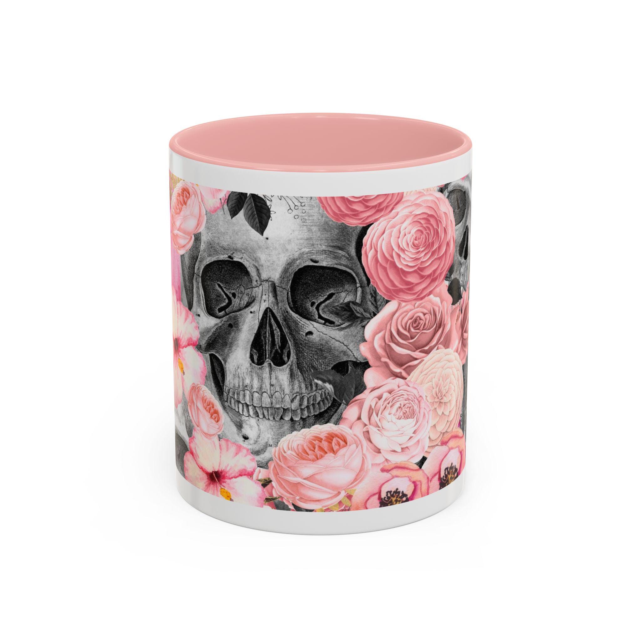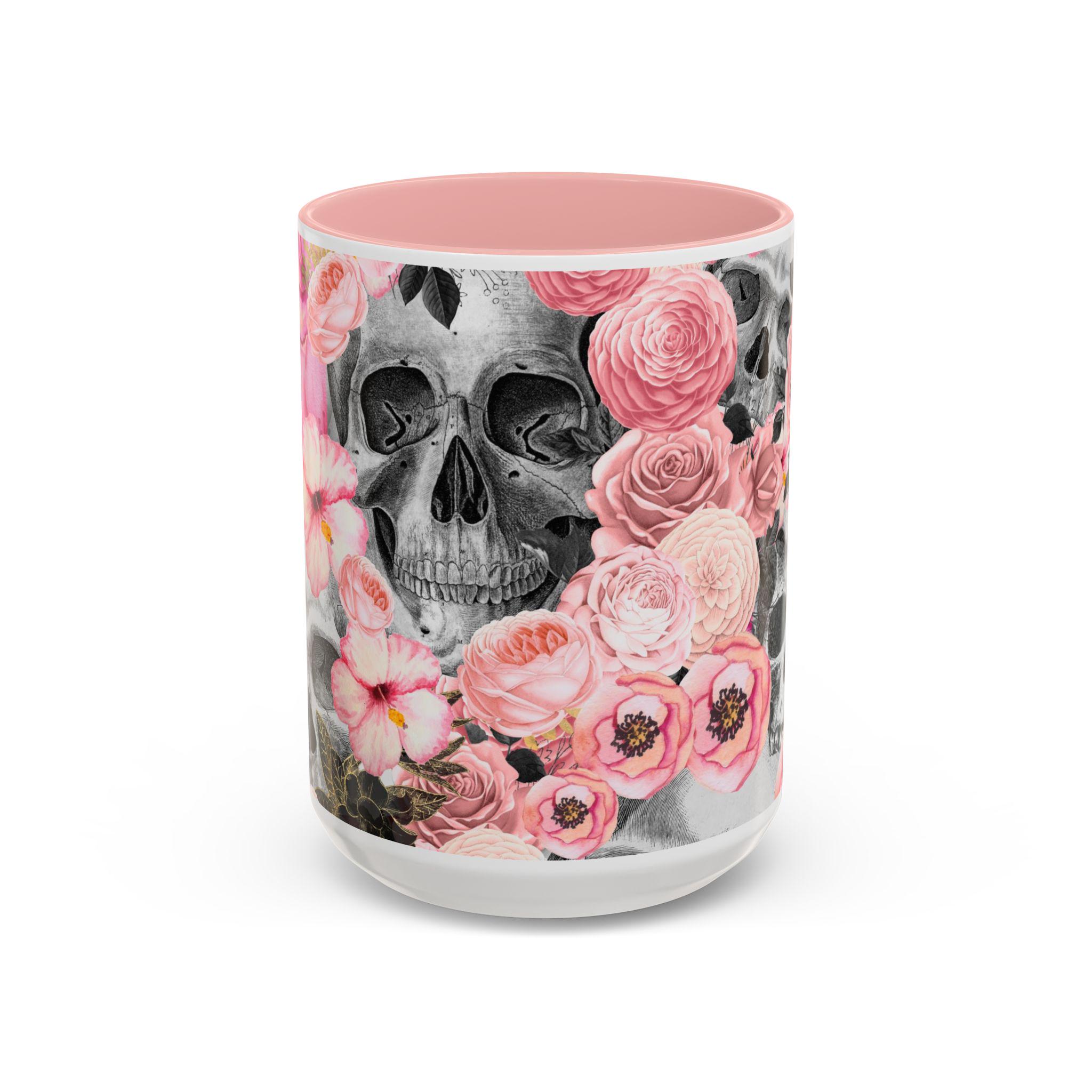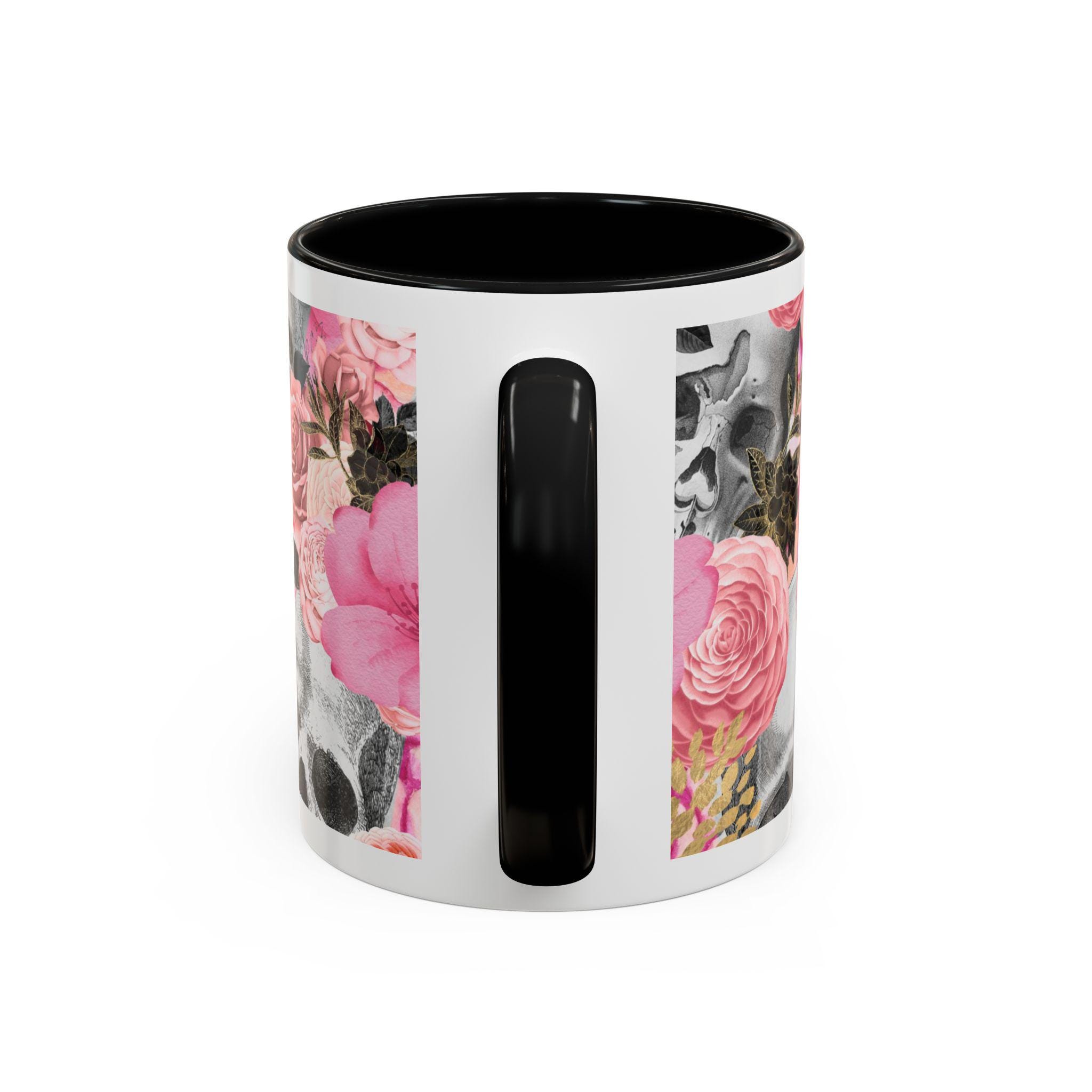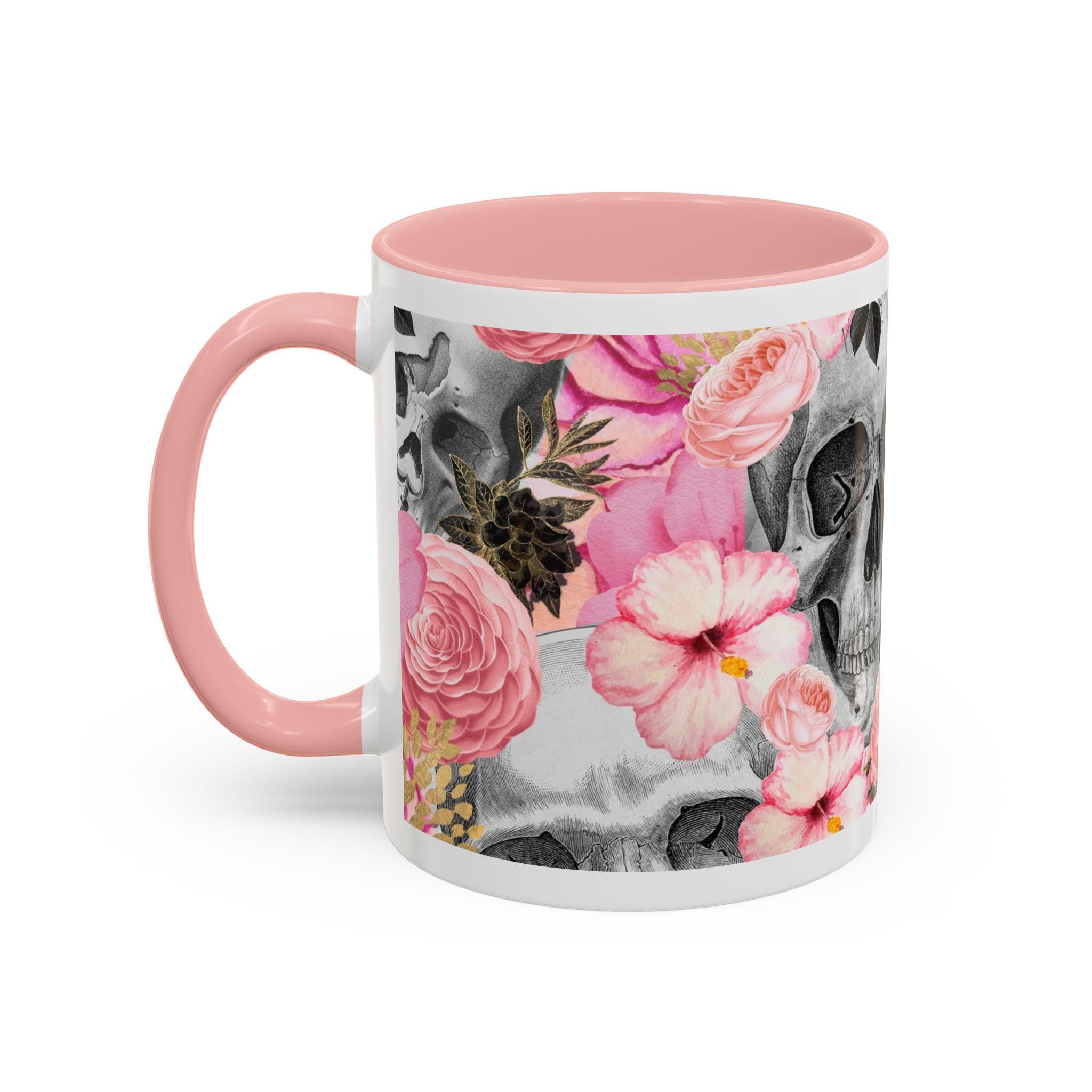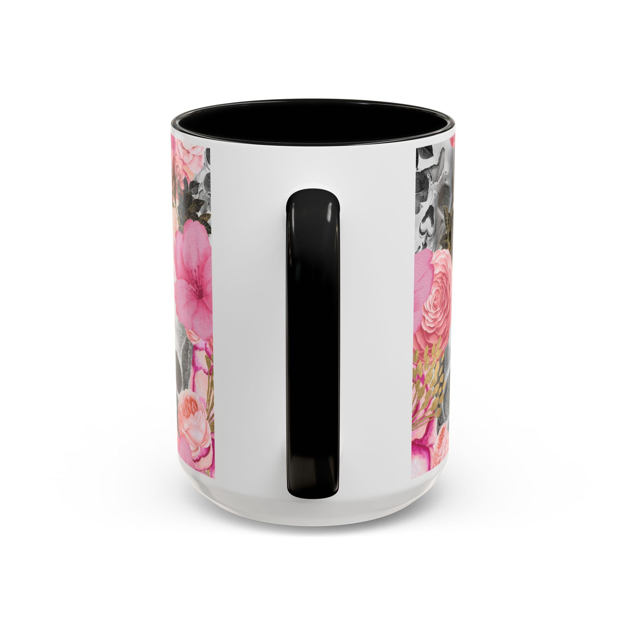 Sip from something a little dark and a little romantic. This ceramic mug pairs a soft, blush floral bouquet with a charcoal skull peeking through the petals — a gentle reminder of contrast and beauty. It feels like morning coffee on a quiet windowsill after a late-night art session. The glossy finish and bold color contrast give each sip a small, cinematic moment.