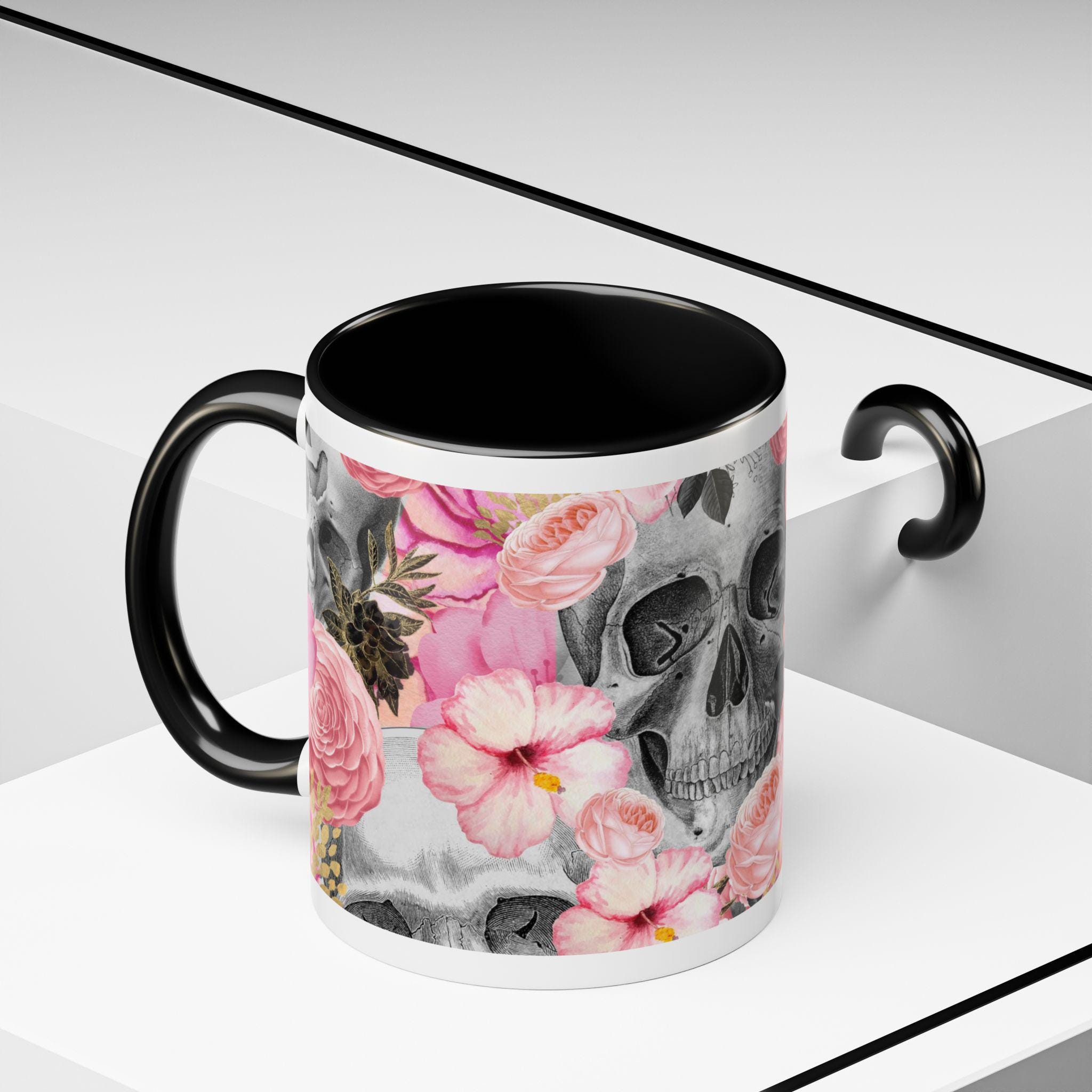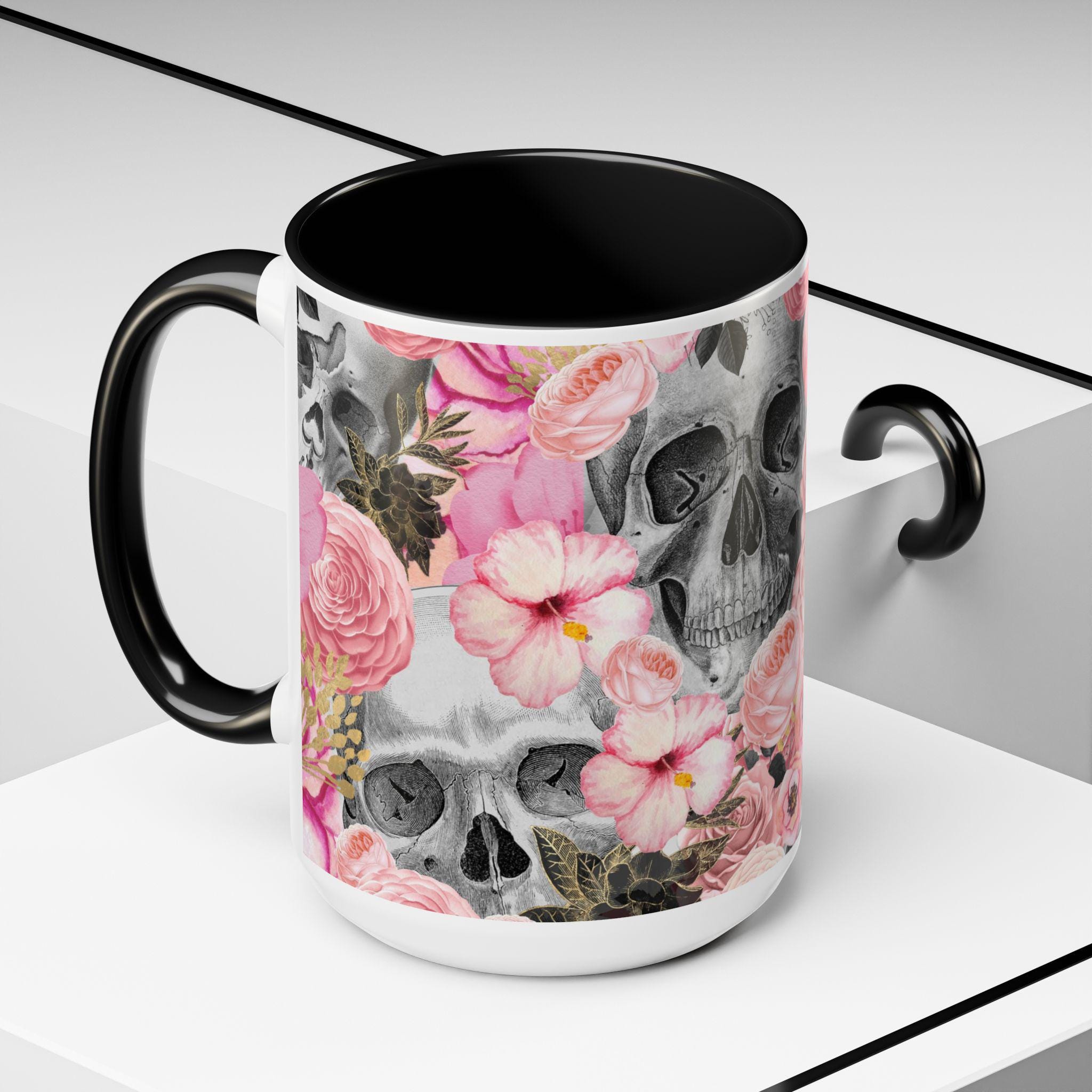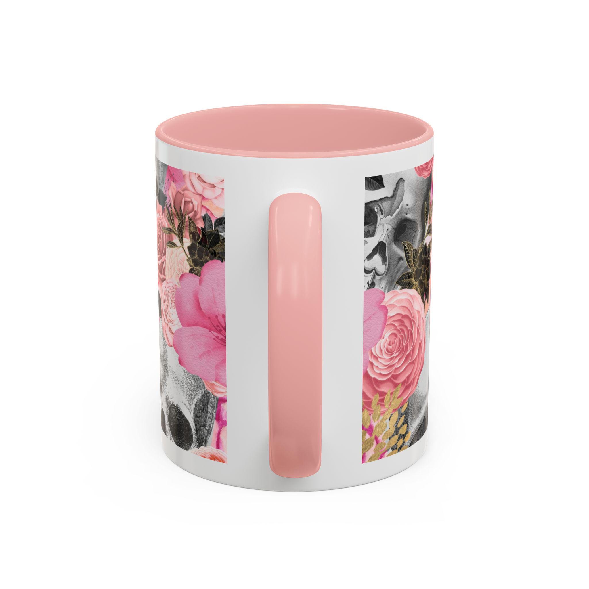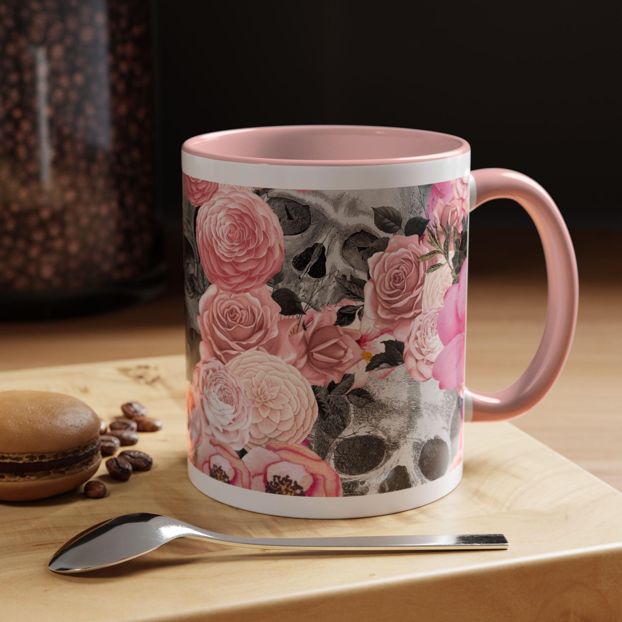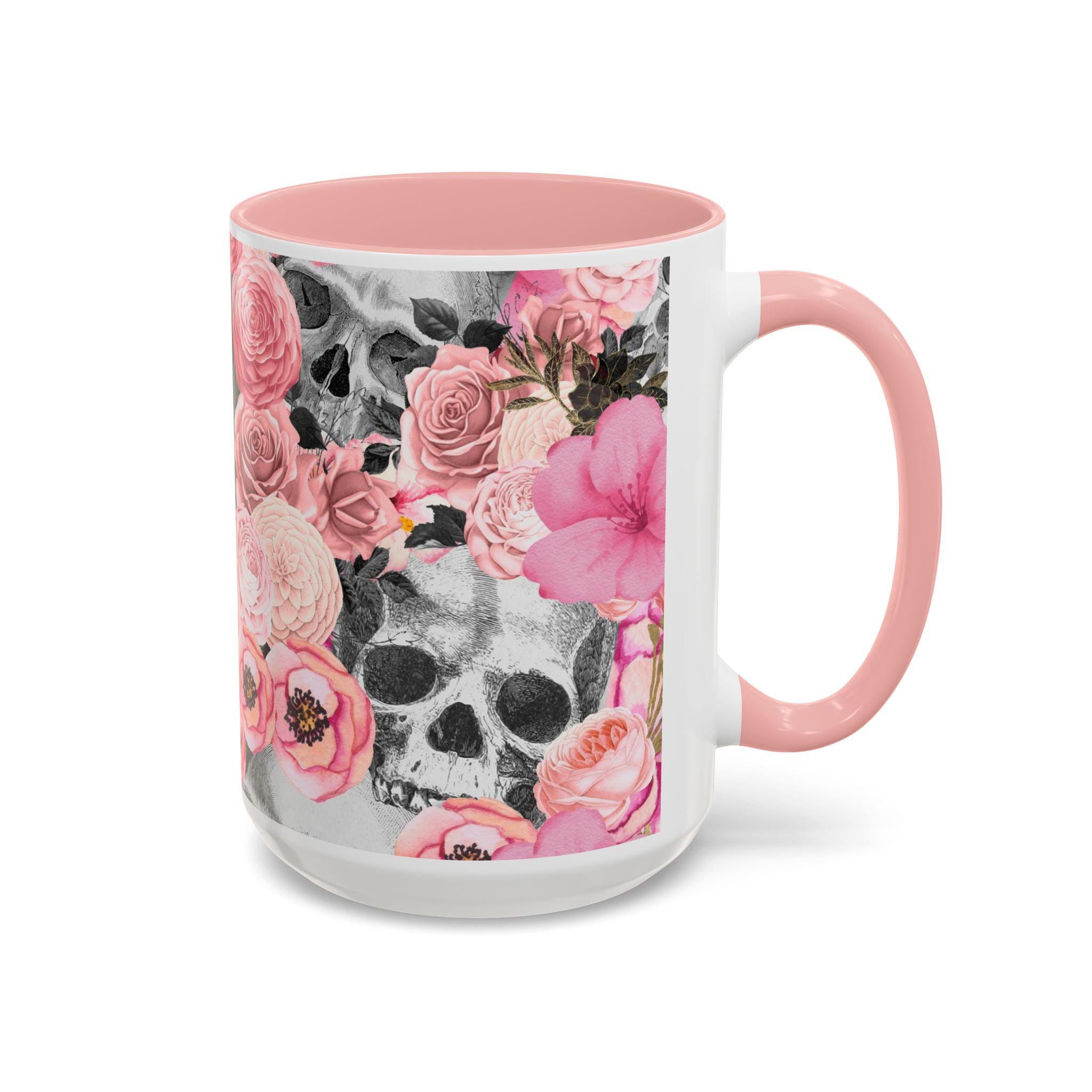 Sip from something a little dark and a little romantic. This ceramic mug pairs a soft, blush floral bouquet with a charcoal skull peeking through the petals — a gentle reminder of contrast and beauty. It feels like morning coffee on a quiet windowsill after a late-night art session. The glossy finish and bold color contrast give each sip a small, cinematic moment.