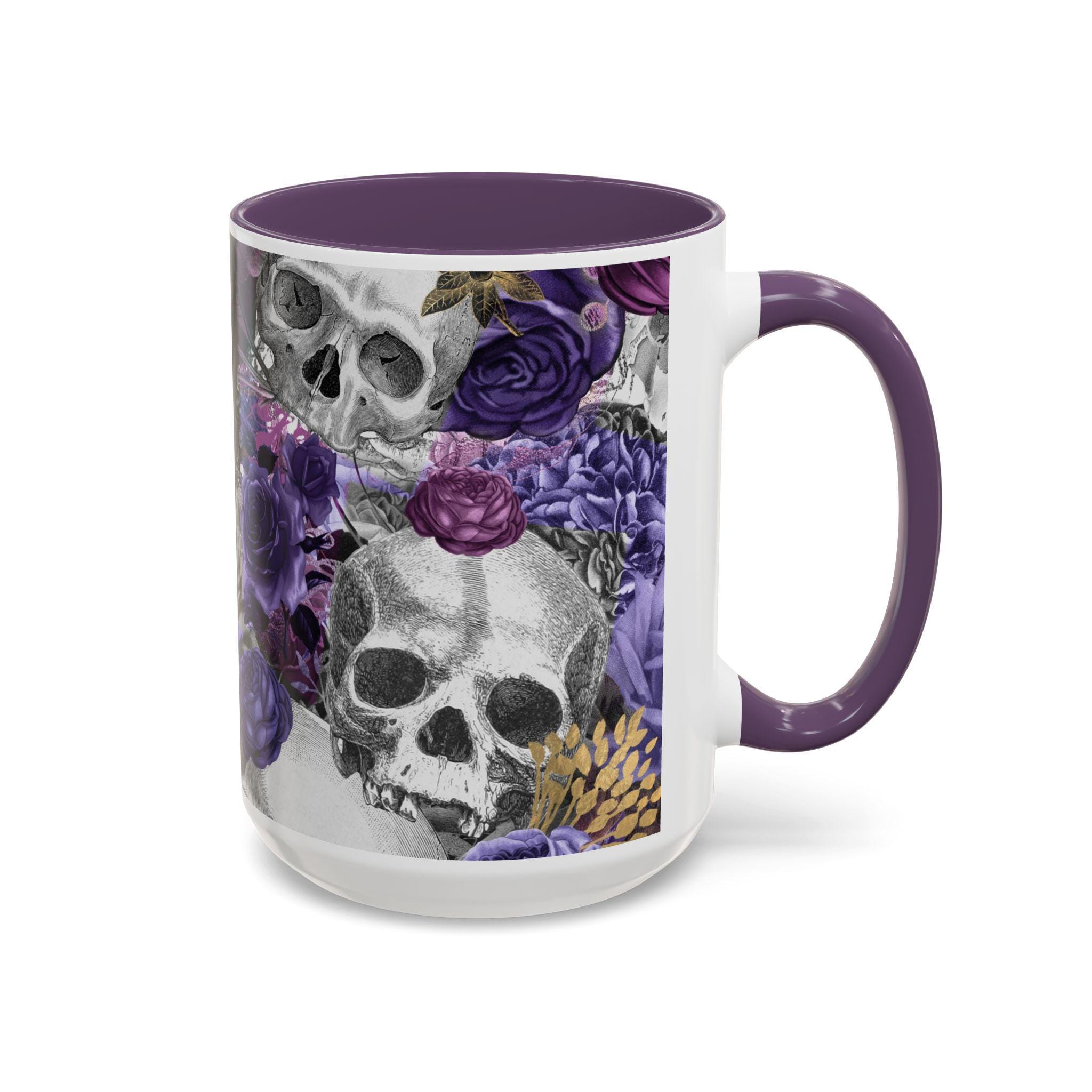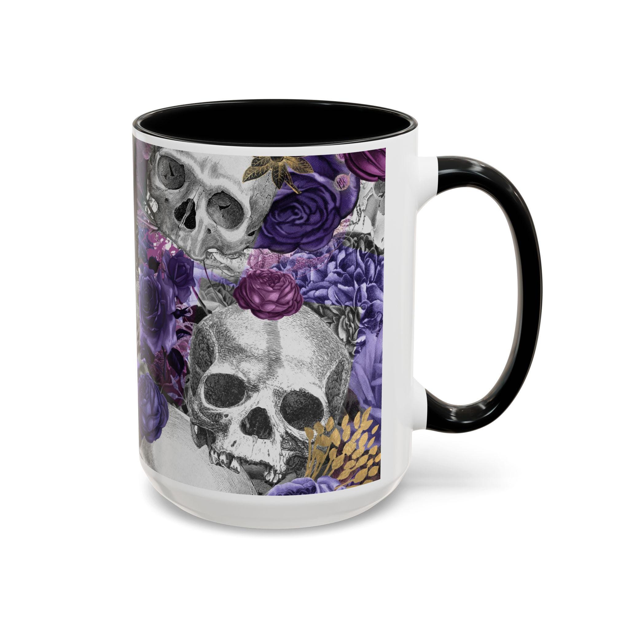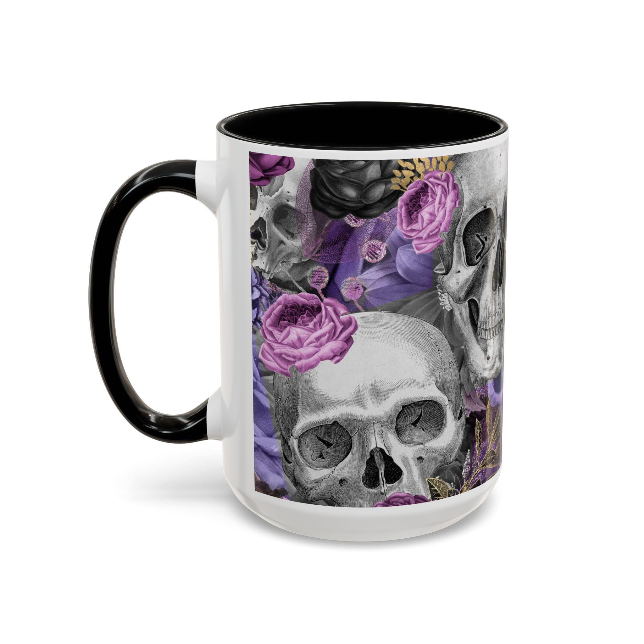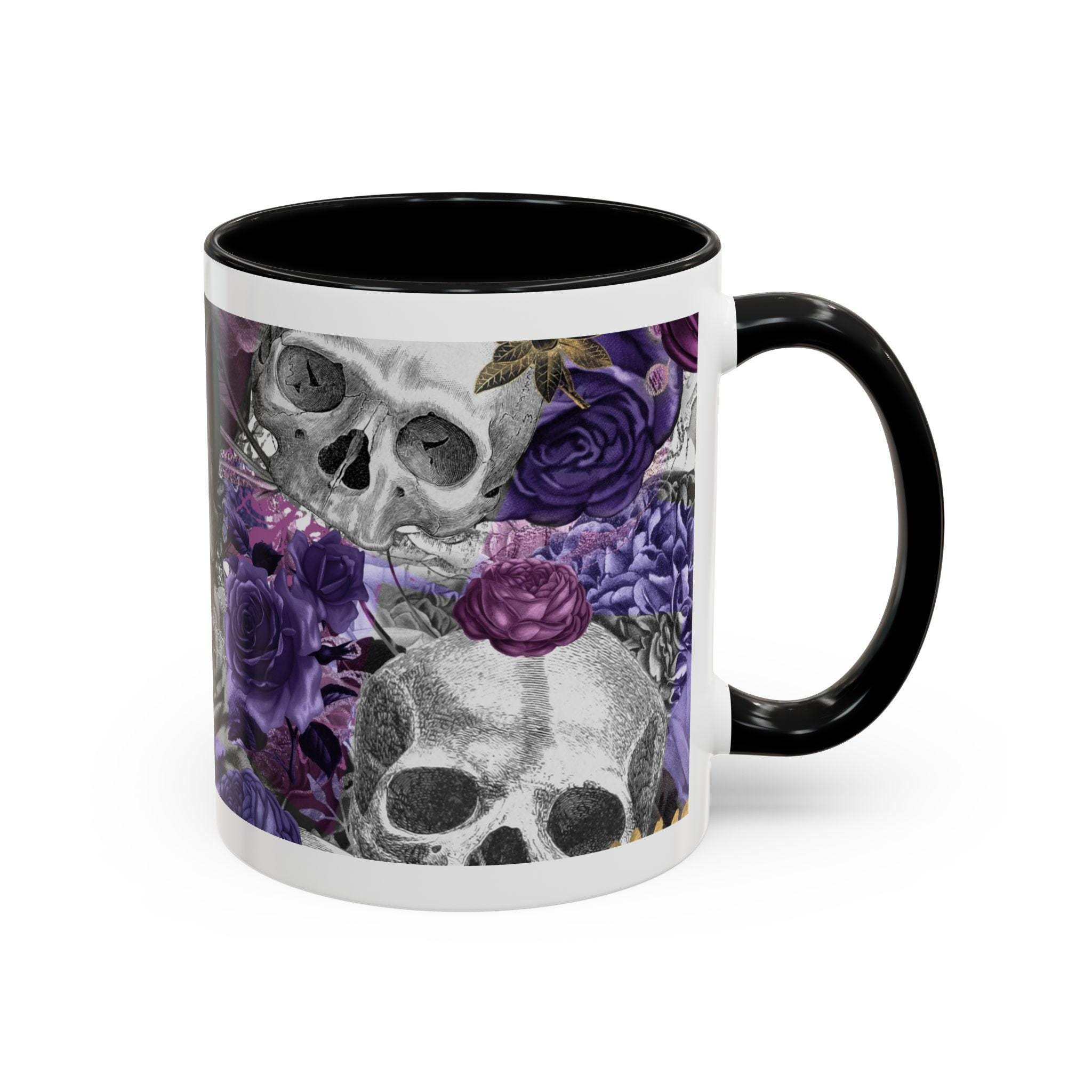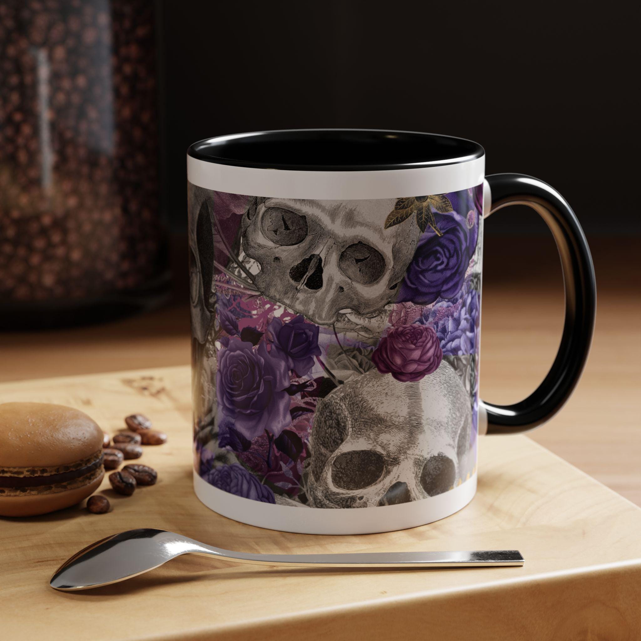 This ceramic accent mug brings a moody, artful edge to your morning ritual. Detailed grayscale skulls mingle with deep purple and mauve roses across the wraparound print, creating a look that’s equal parts gothic and romantic. The colored interior and handle add a bold contrast to the glossy white exterior, making the design pop with every sip. It feels like a quiet, slightly mischievous companion for slow coffee, late-night tea, or a desk-side pick-me-up — for people who prefer their everyday objects to have personality and a touch of dark beauty.