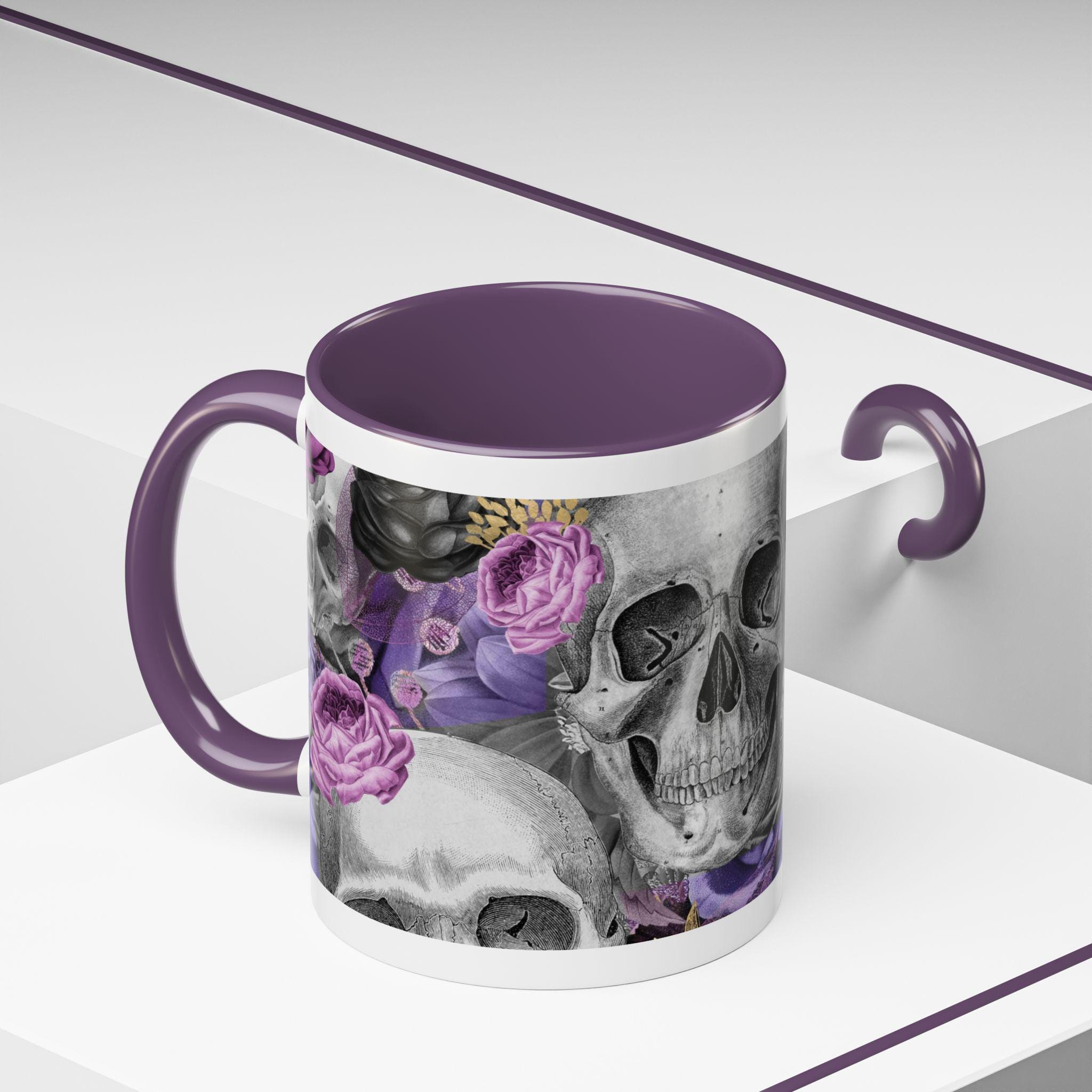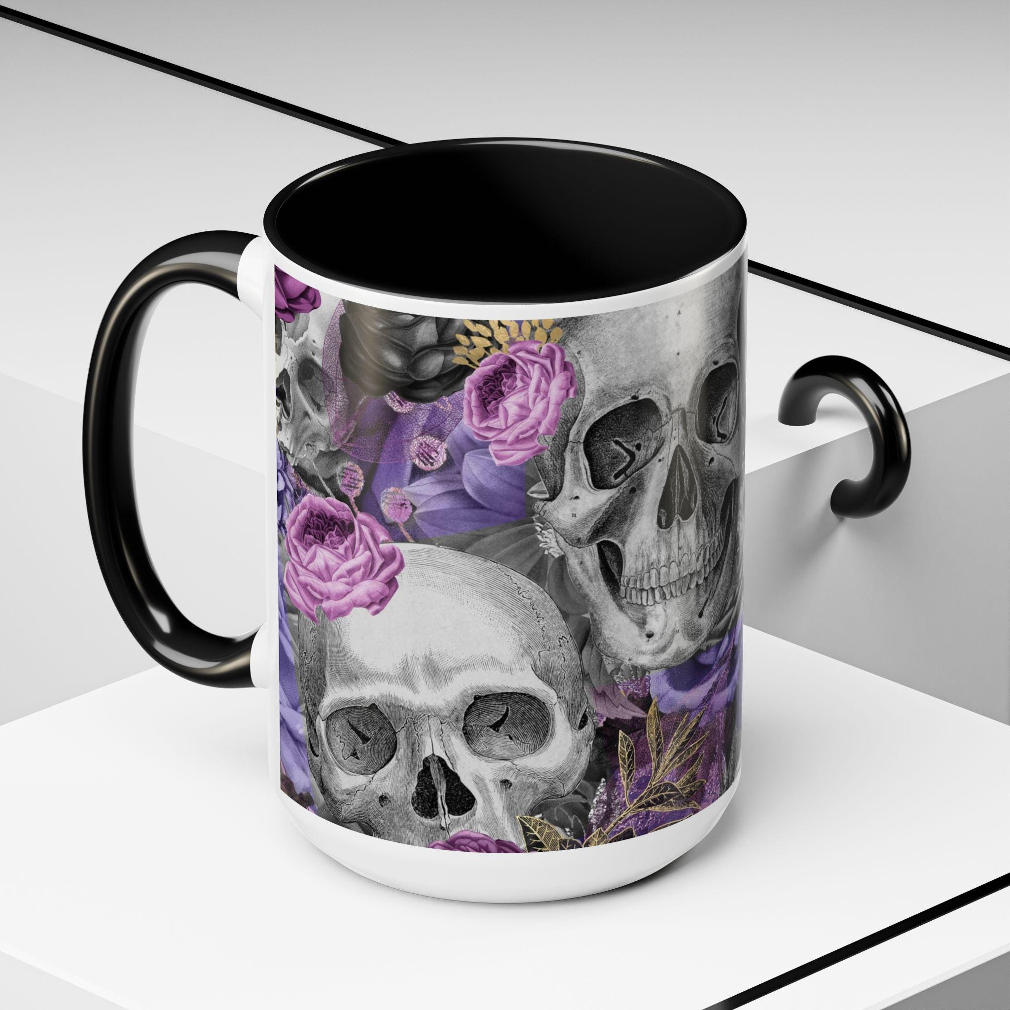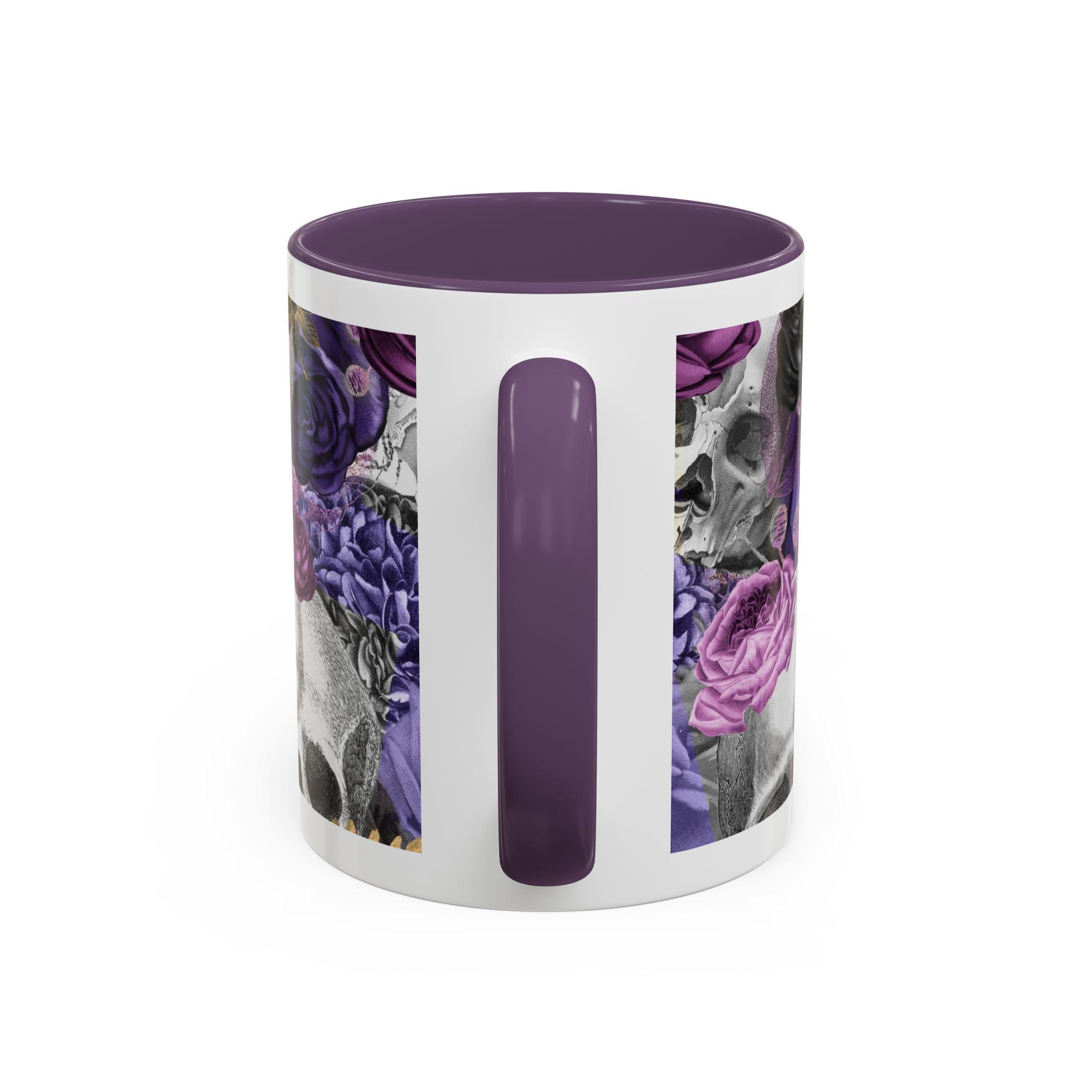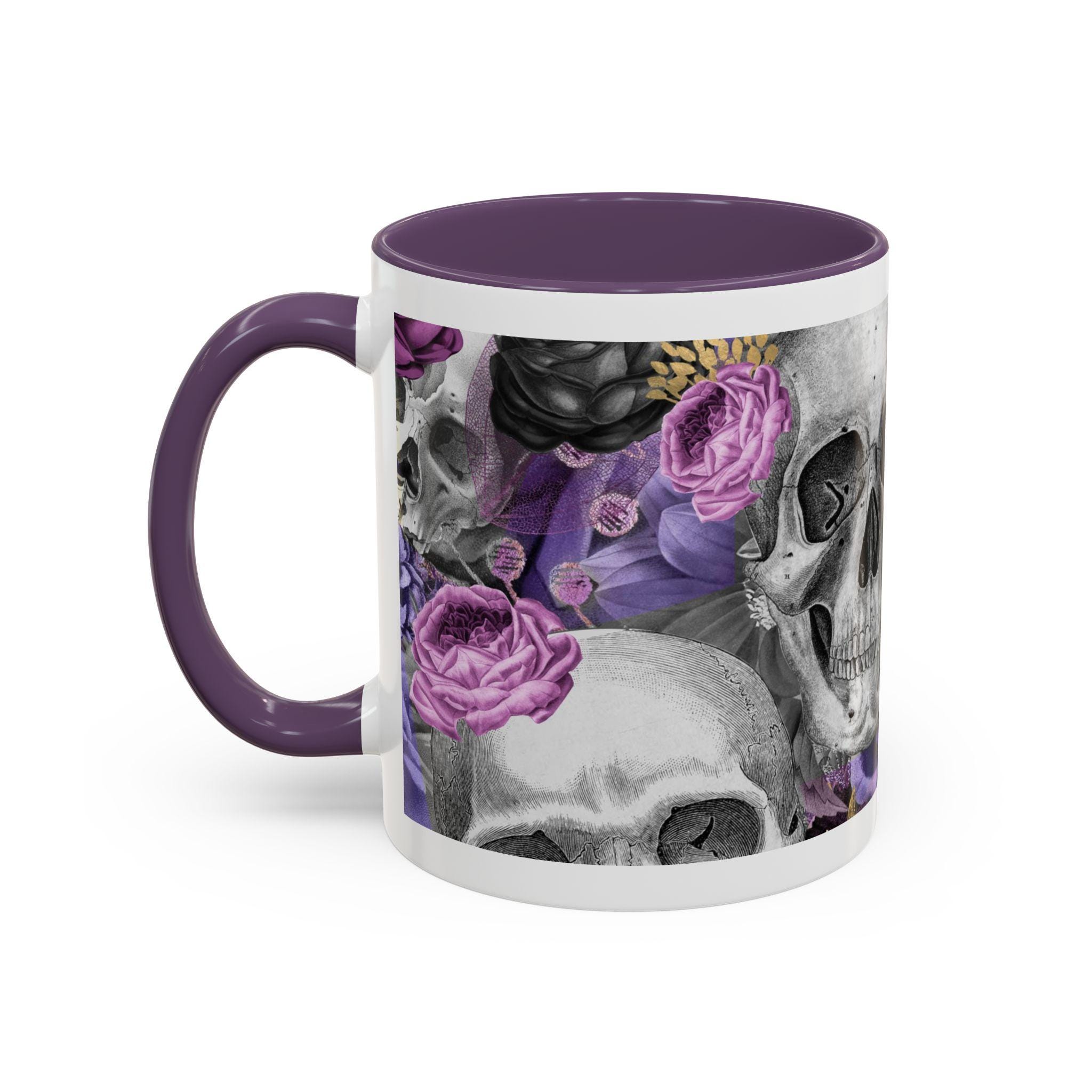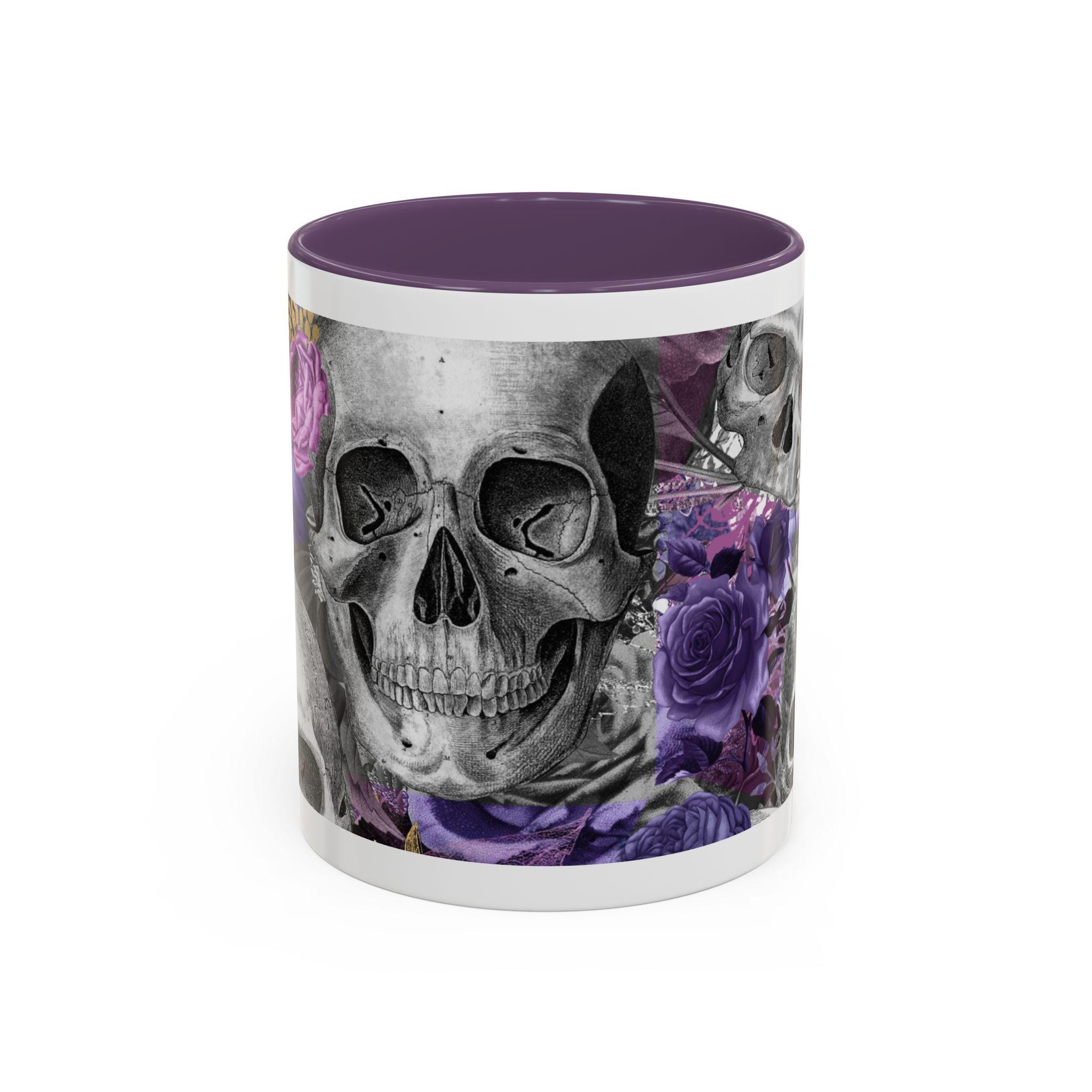 This ceramic accent mug brings a moody, artful edge to your morning ritual. Detailed grayscale skulls mingle with deep purple and mauve roses across the wraparound print, creating a look that’s equal parts gothic and romantic. The colored interior and handle add a bold contrast to the glossy white exterior, making the design pop with every sip. It feels like a quiet, slightly mischievous companion for slow coffee, late-night tea, or a desk-side pick-me-up — for people who prefer their everyday objects to have personality and a touch of dark beauty.