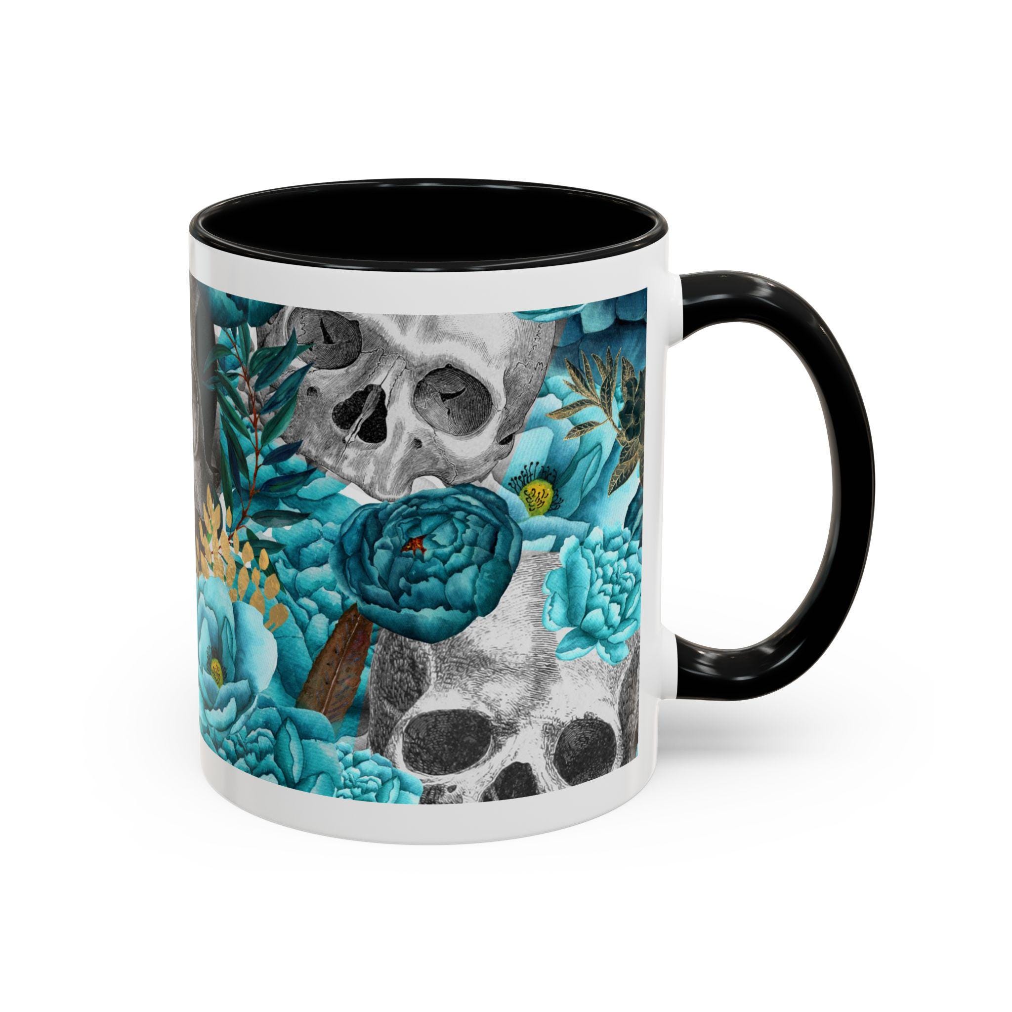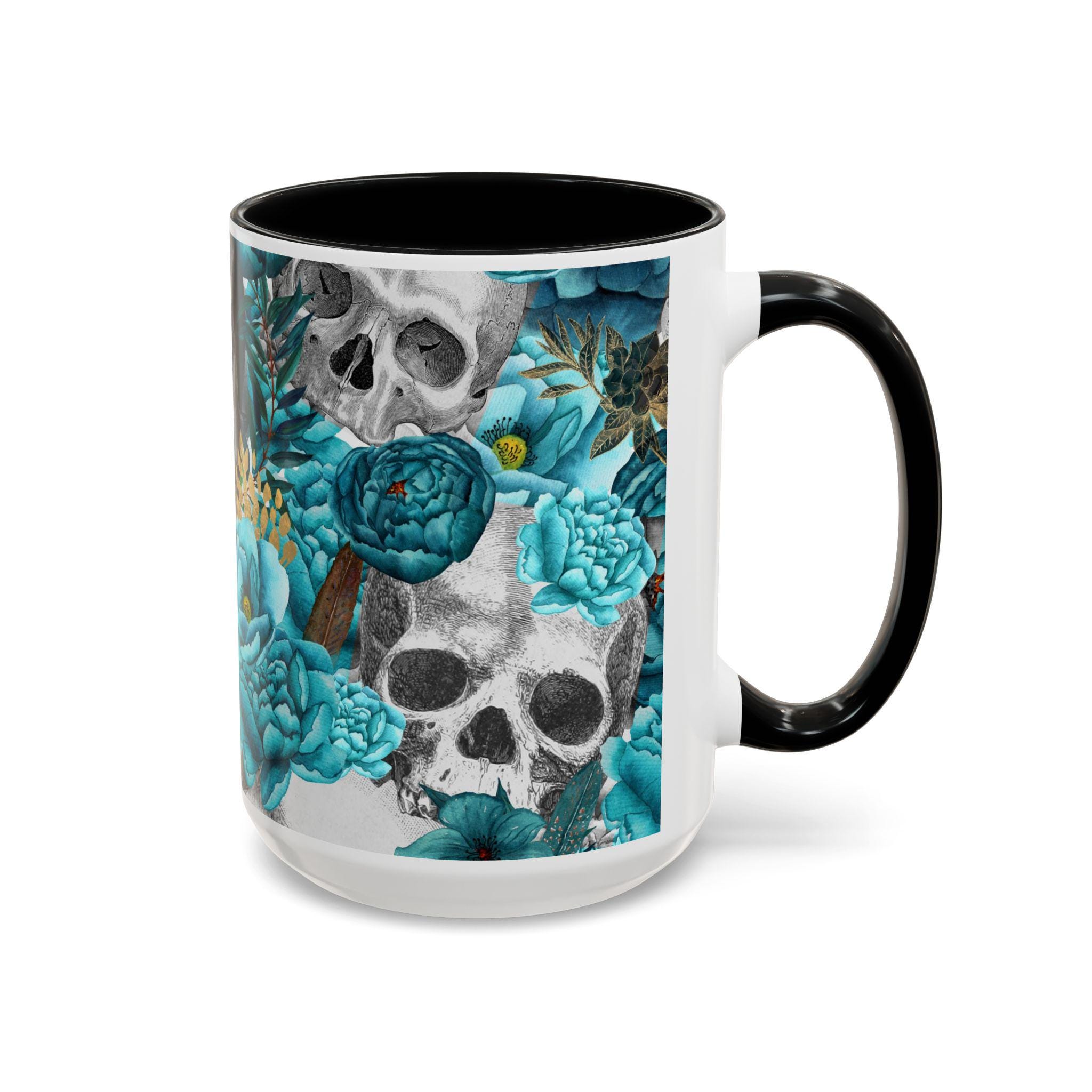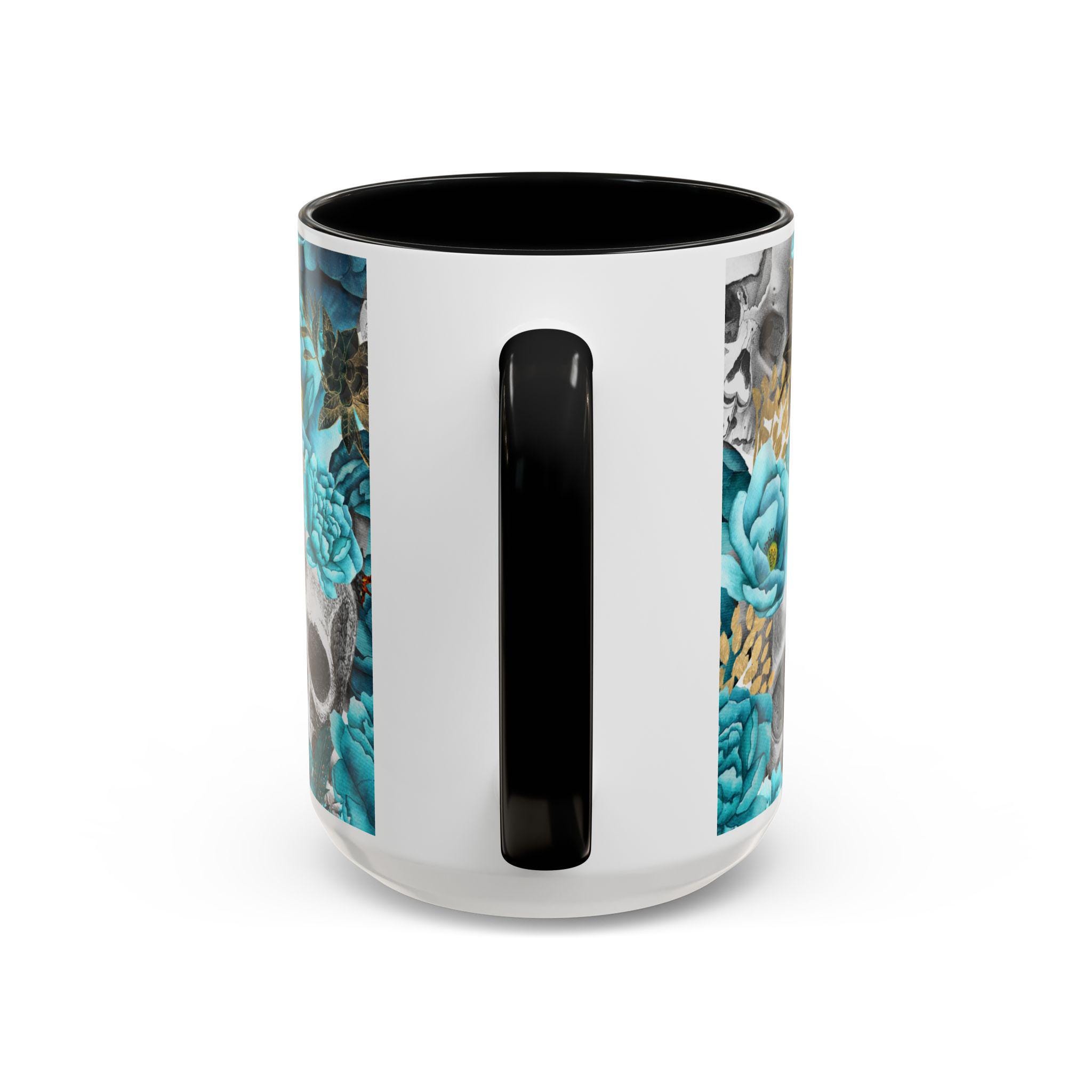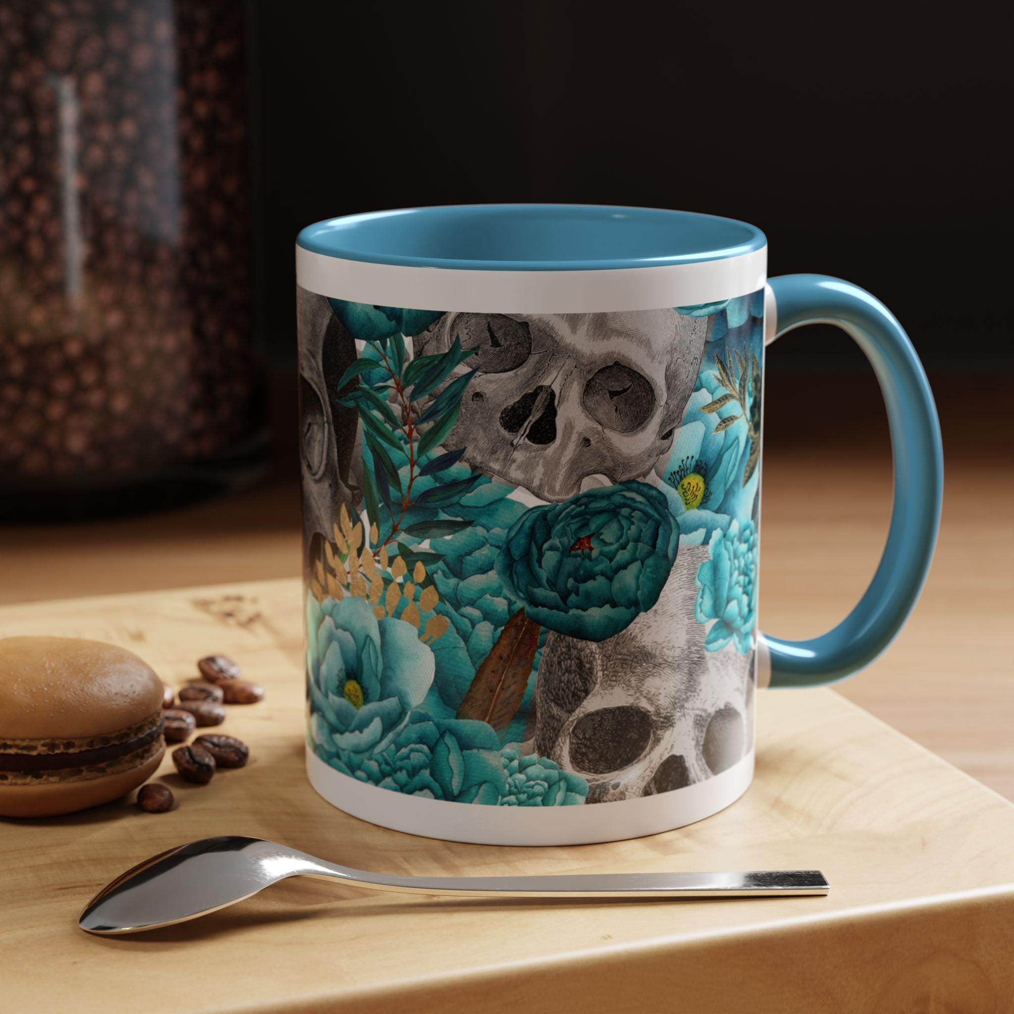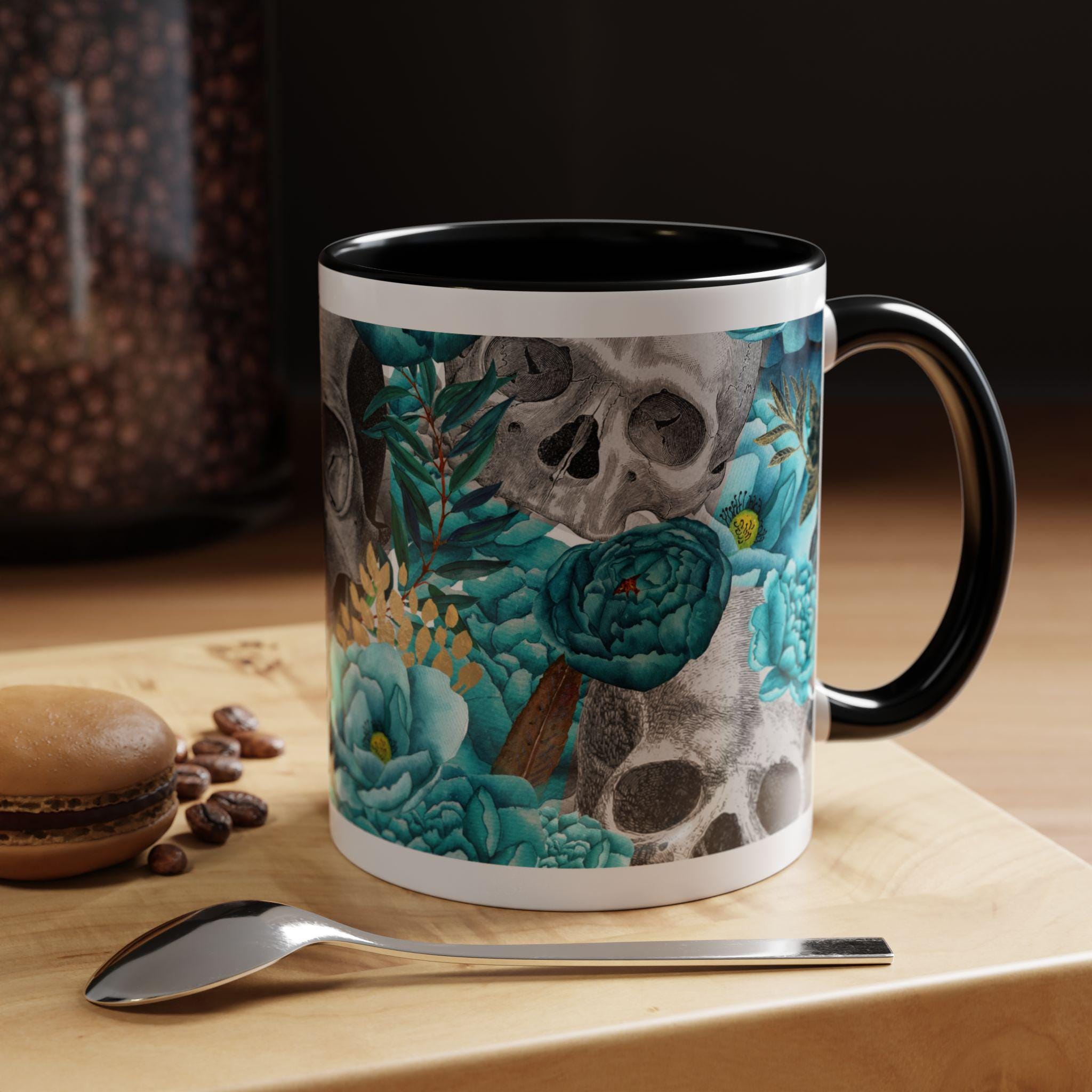 This ceramic accent mug blends moody edge with delicate beauty. A grayscale skull motif wraps around the exterior, softened by lush teal and aquamarine blooms that thread between the bones. The glossy white base contrasts with the colored interior and handle, making the dark floral design pop whether you sip morning coffee or late-night tea. It feels both artful and slightly gothic — an everyday piece that hints at mystery and thoughtful style.