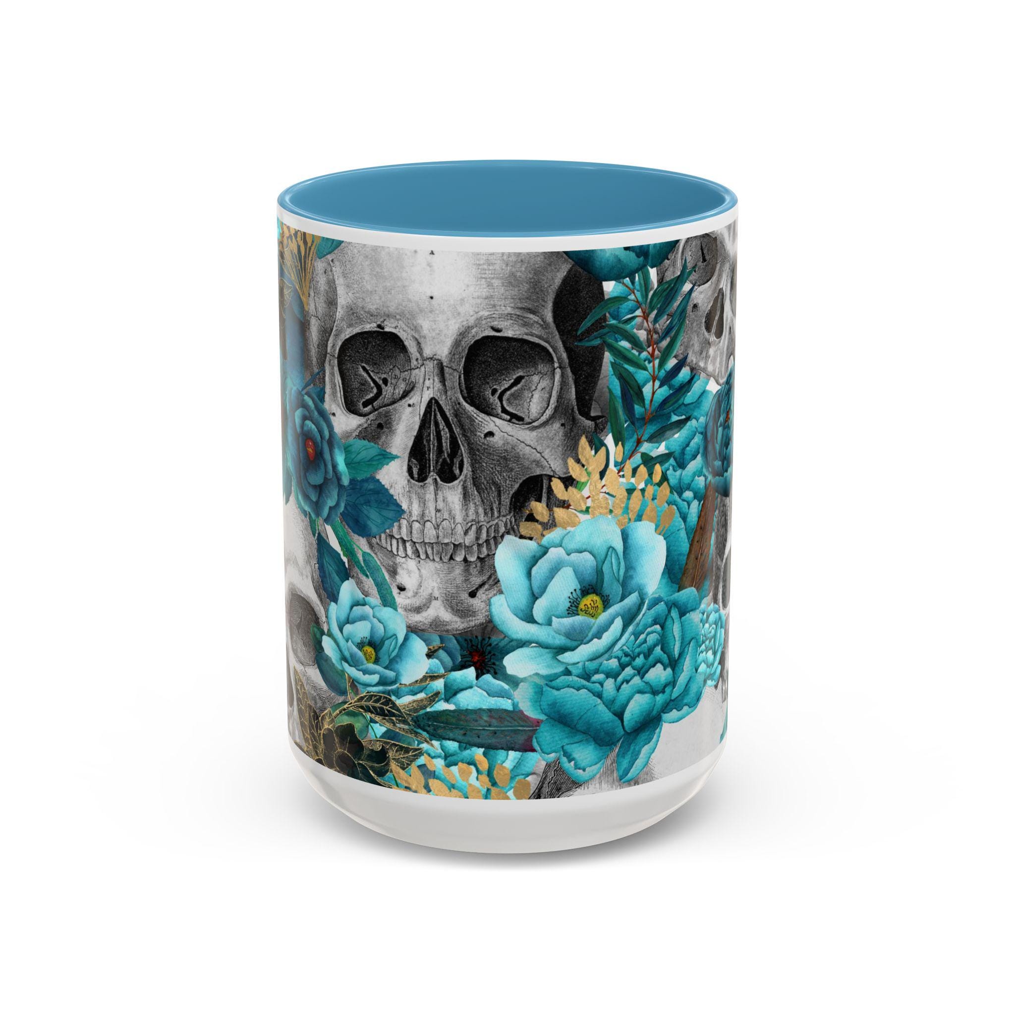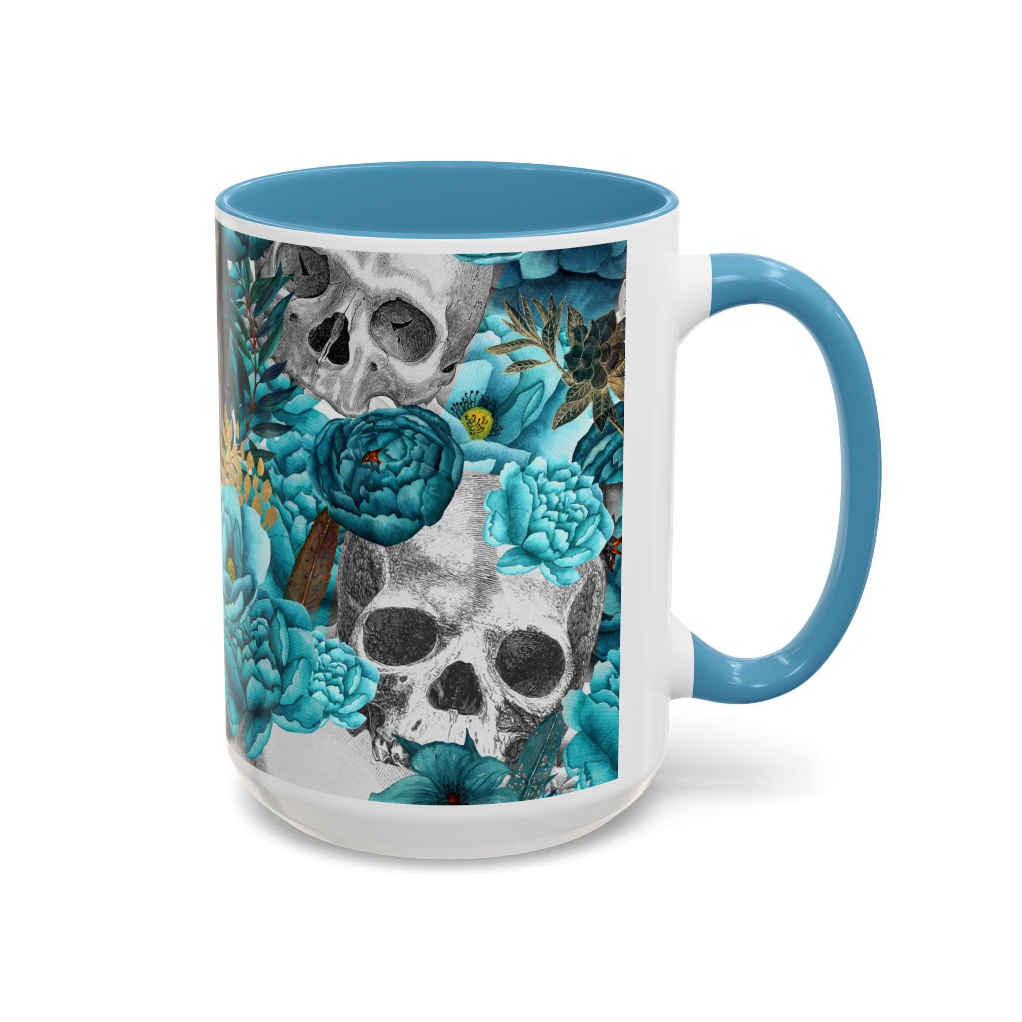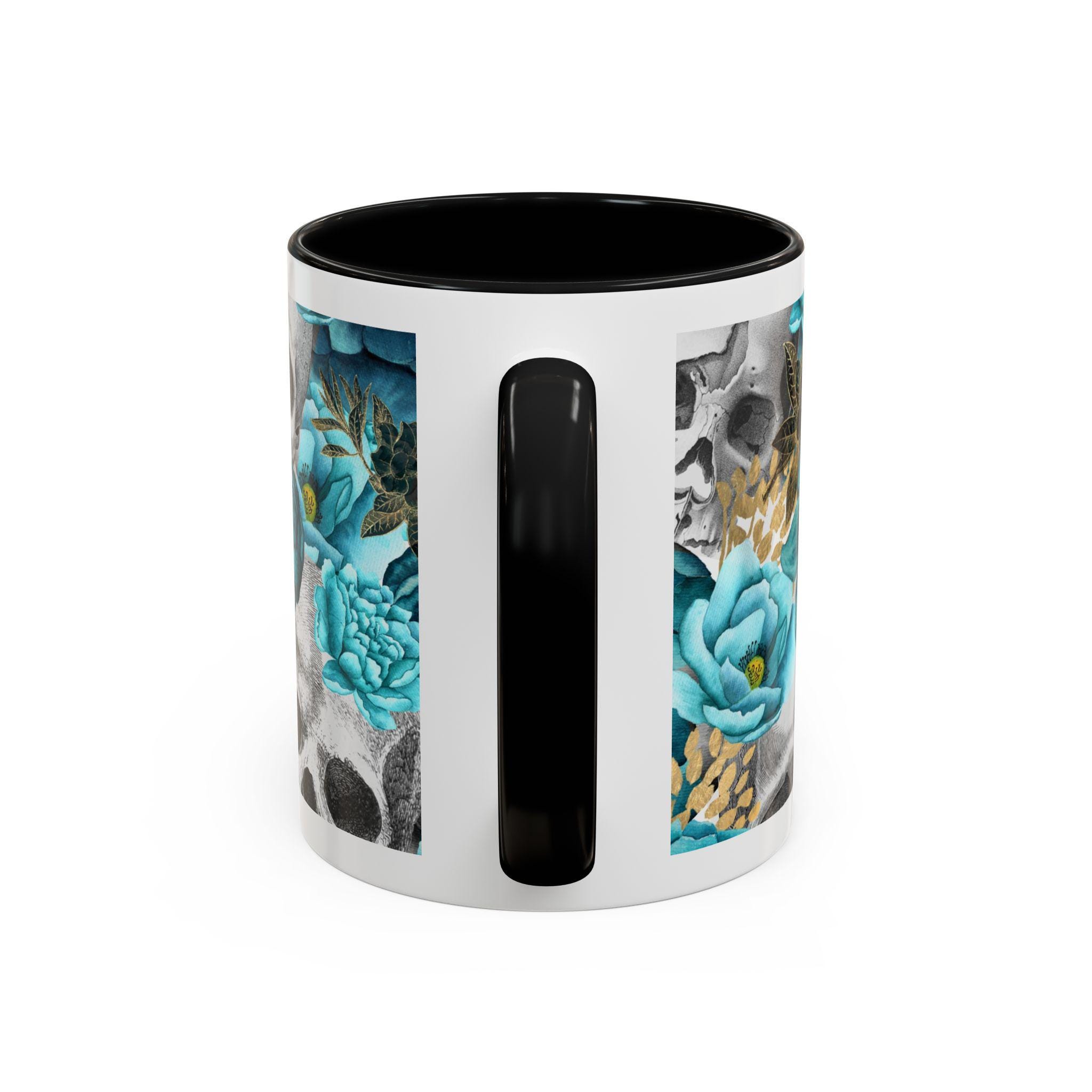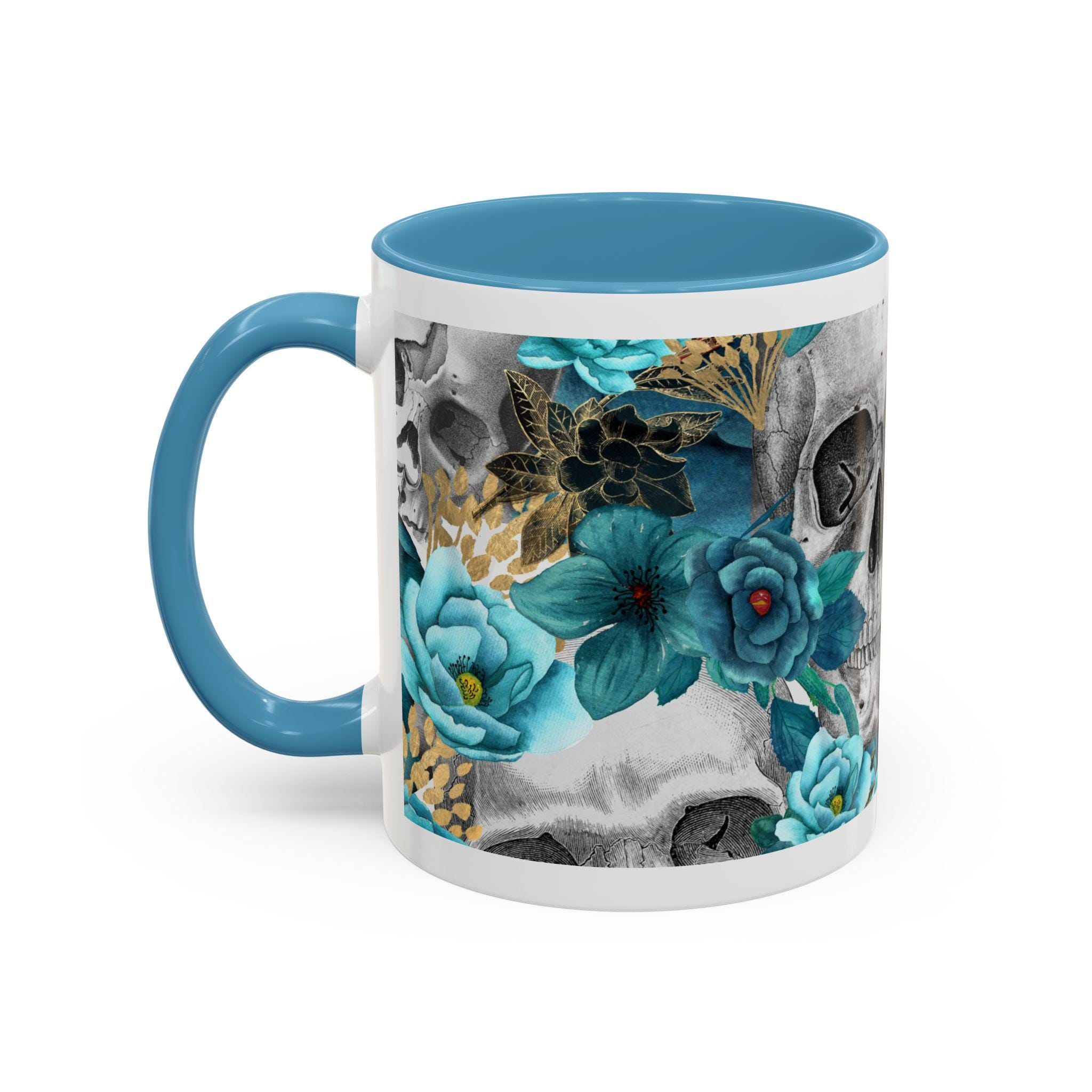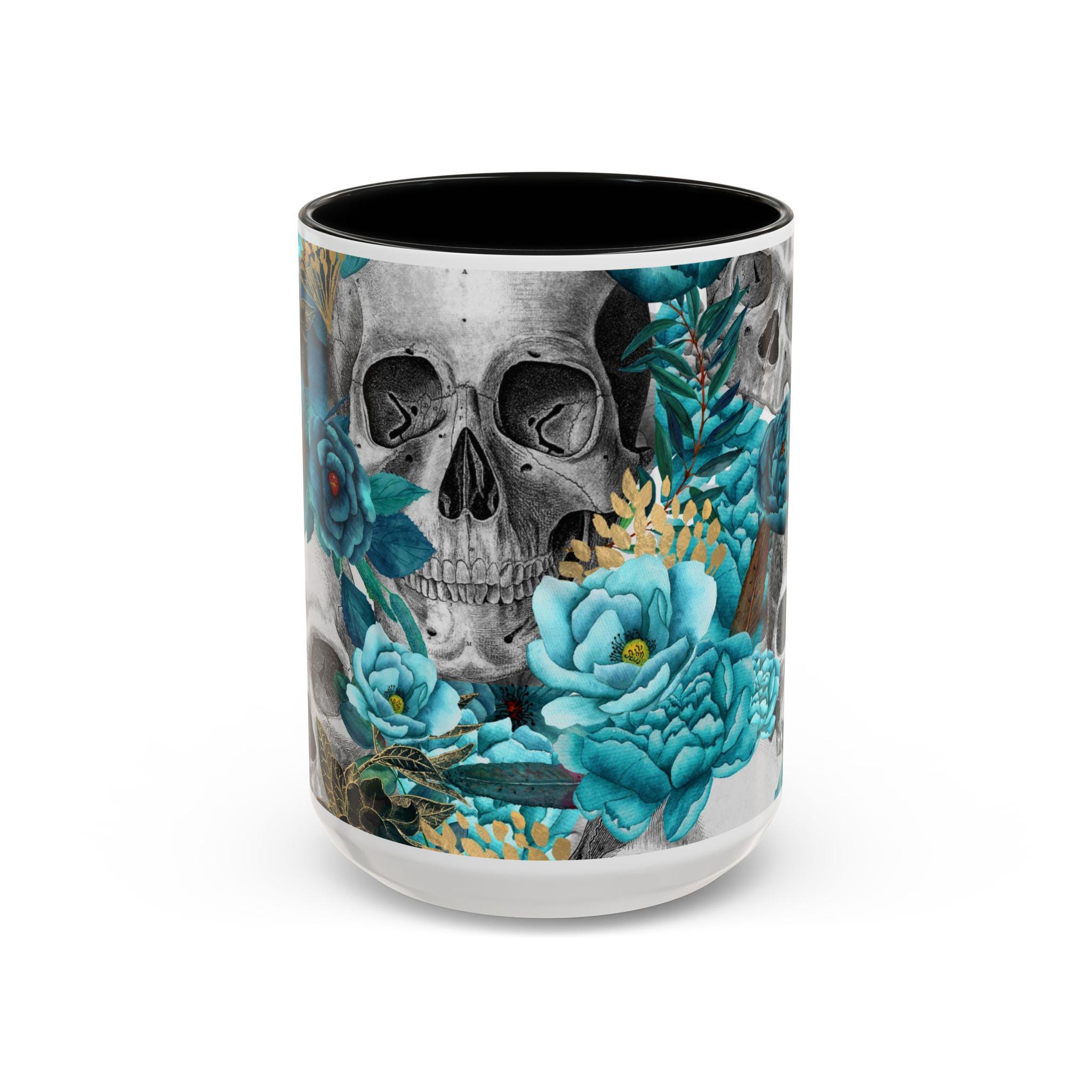 This ceramic accent mug blends moody edge with delicate beauty. A grayscale skull motif wraps around the exterior, softened by lush teal and aquamarine blooms that thread between the bones. The glossy white base contrasts with the colored interior and handle, making the dark floral design pop whether you sip morning coffee or late-night tea. It feels both artful and slightly gothic — an everyday piece that hints at mystery and thoughtful style.