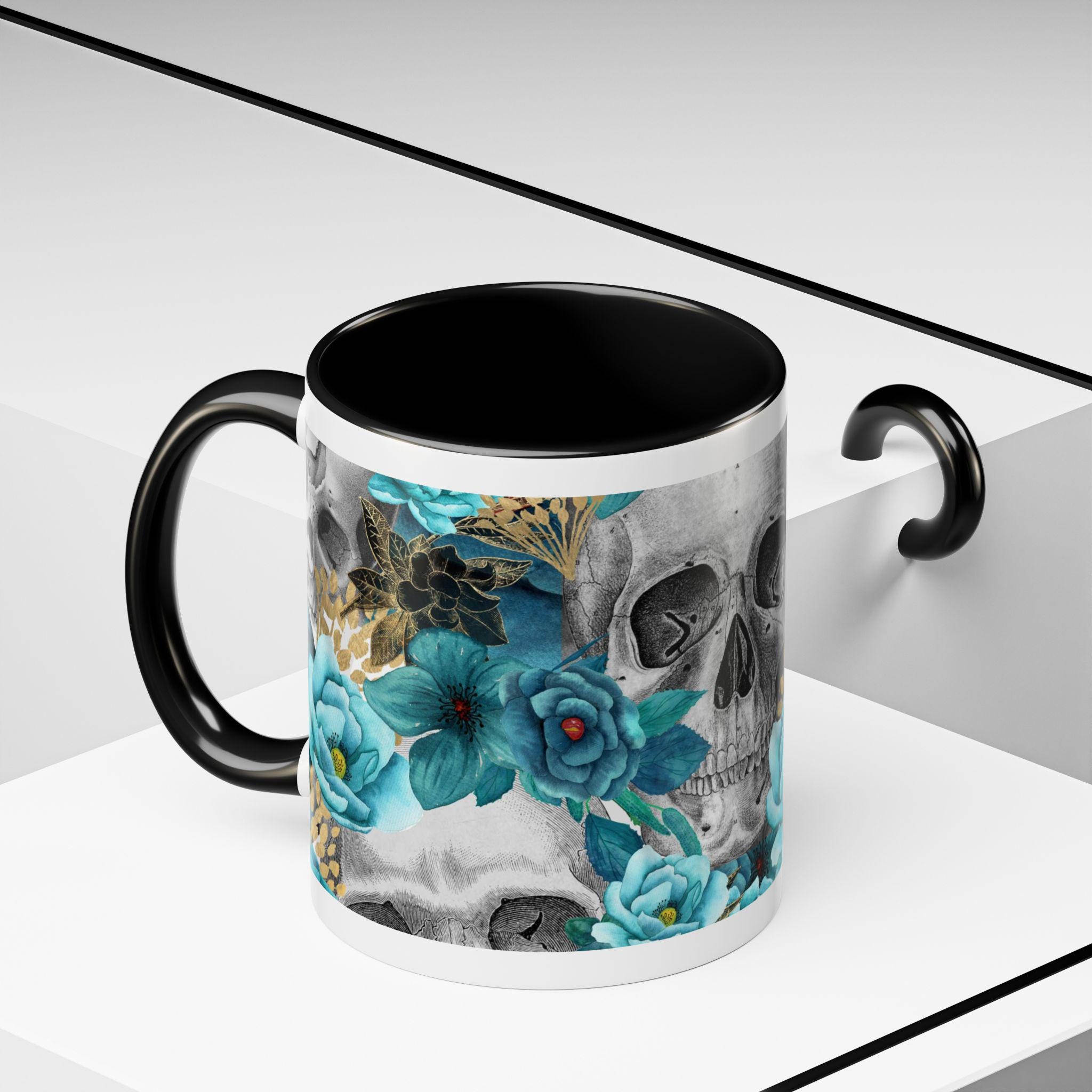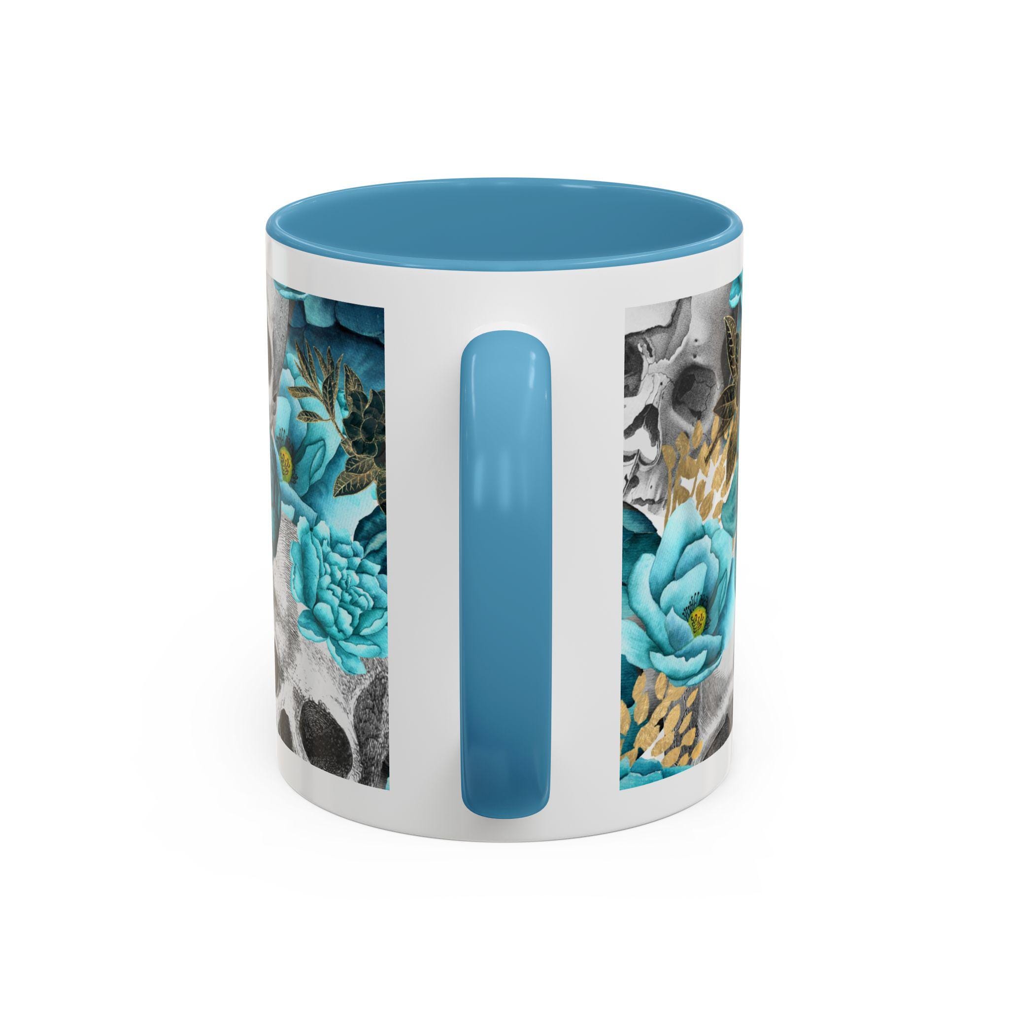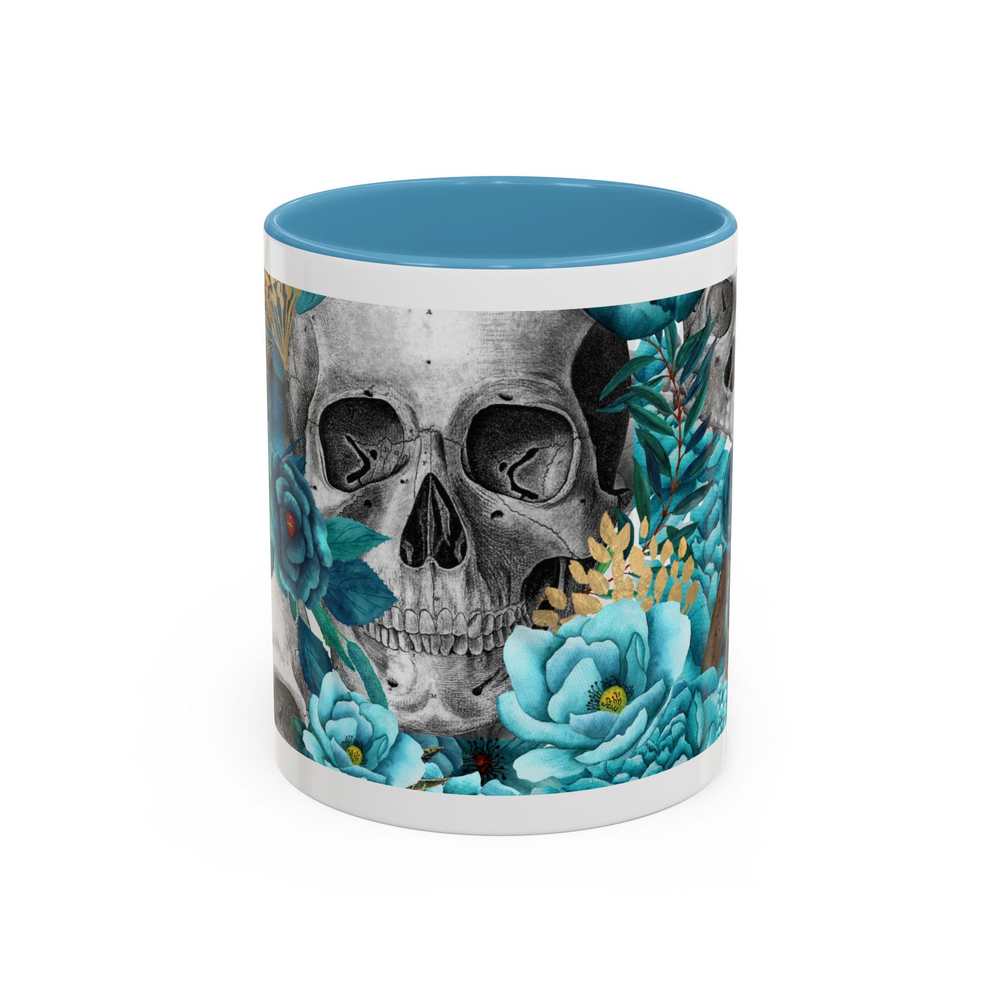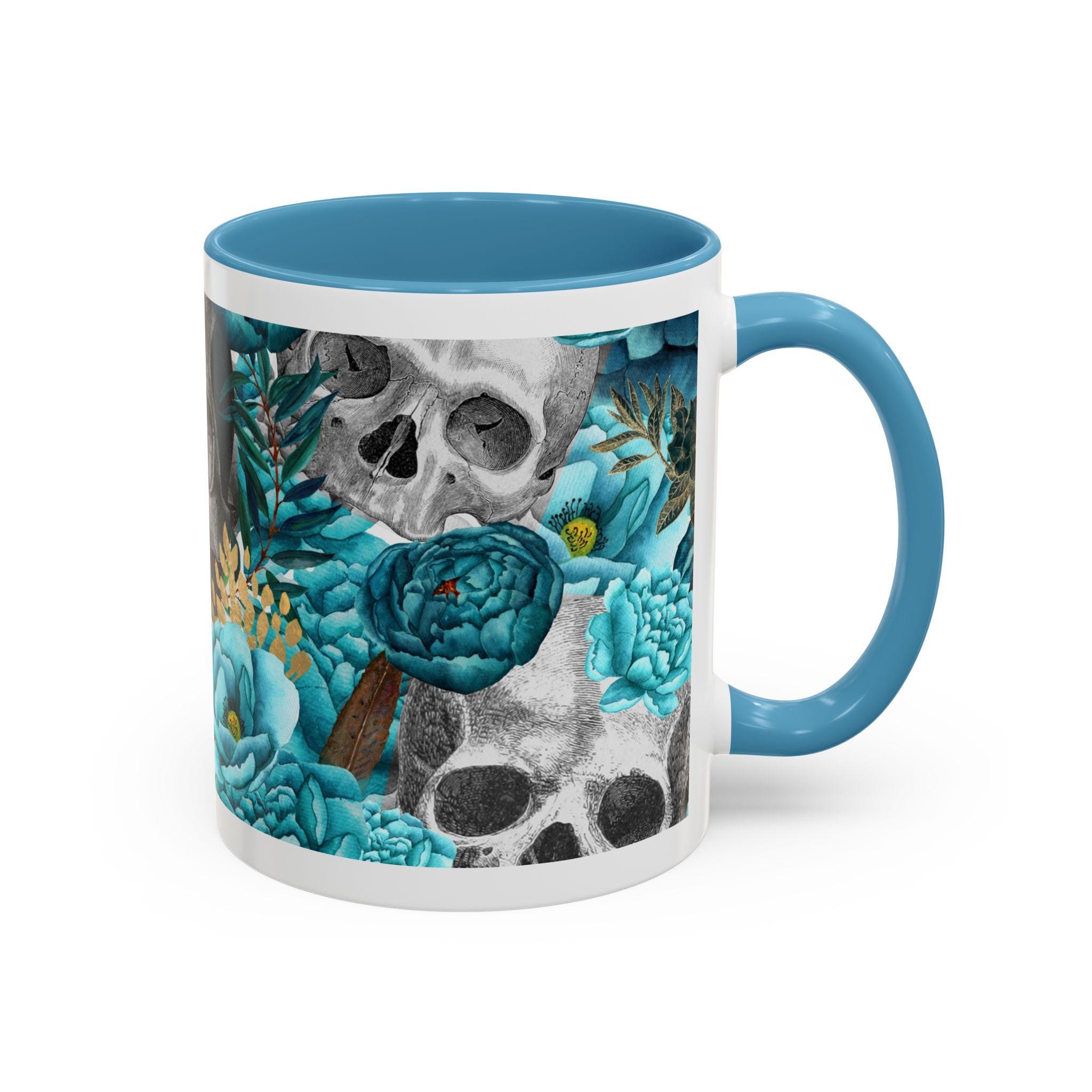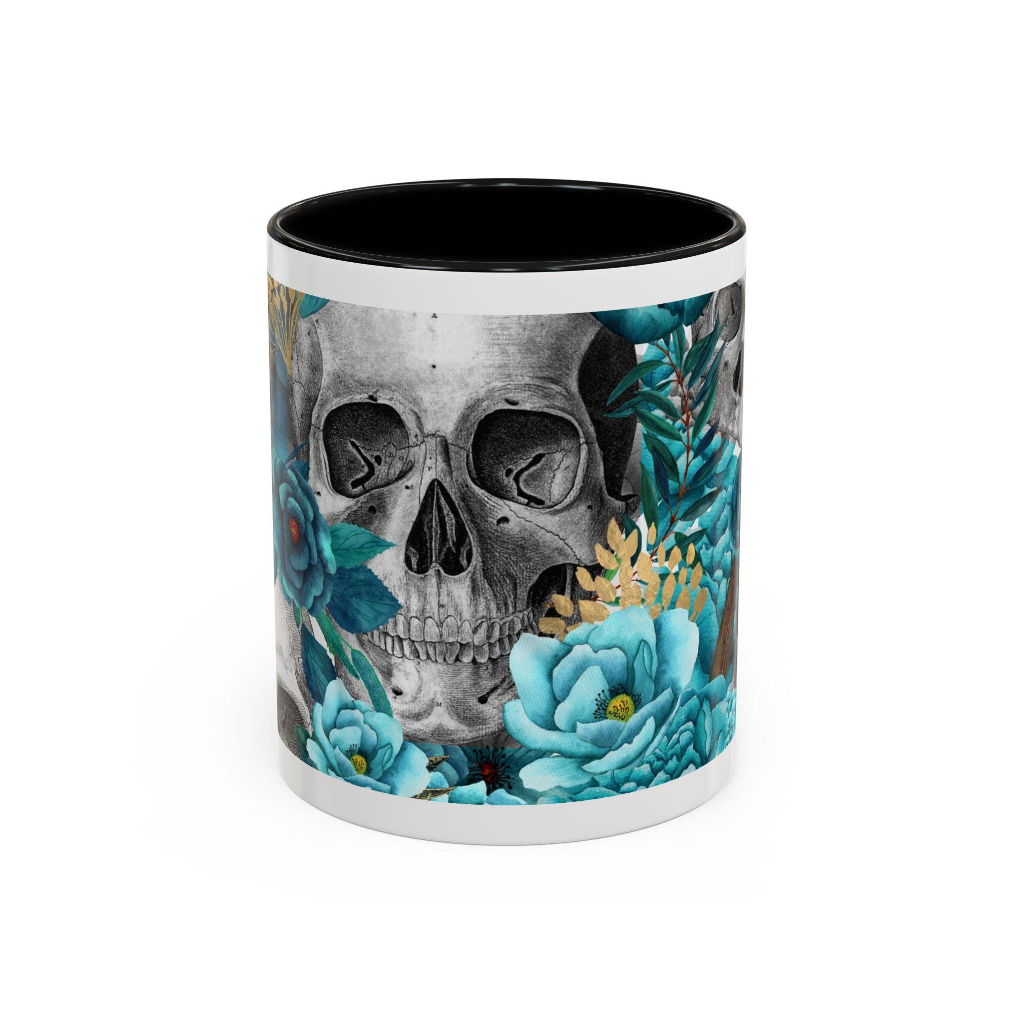 This ceramic accent mug blends moody edge with delicate beauty. A grayscale skull motif wraps around the exterior, softened by lush teal and aquamarine blooms that thread between the bones. The glossy white base contrasts with the colored interior and handle, making the dark floral design pop whether you sip morning coffee or late-night tea. It feels both artful and slightly gothic — an everyday piece that hints at mystery and thoughtful style.