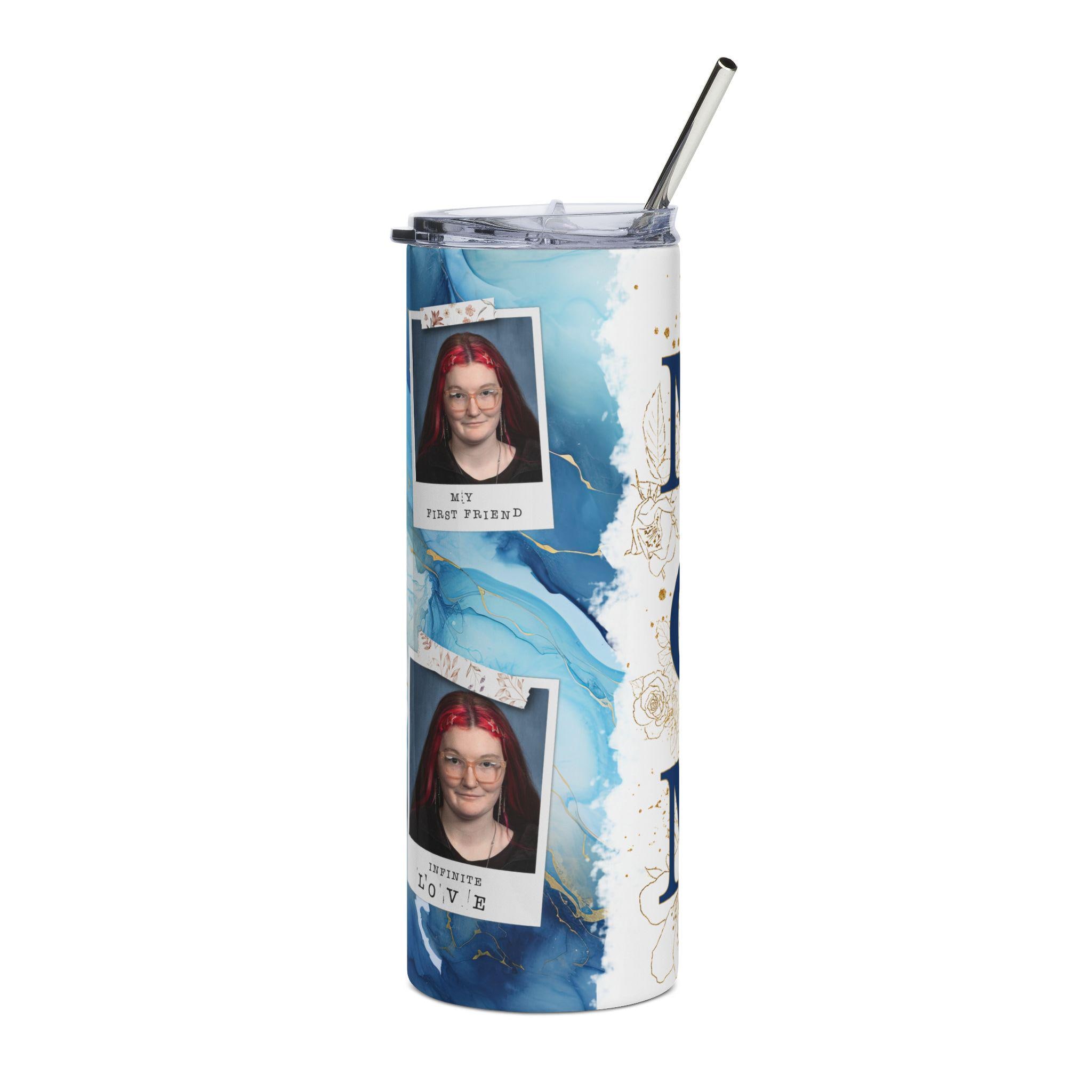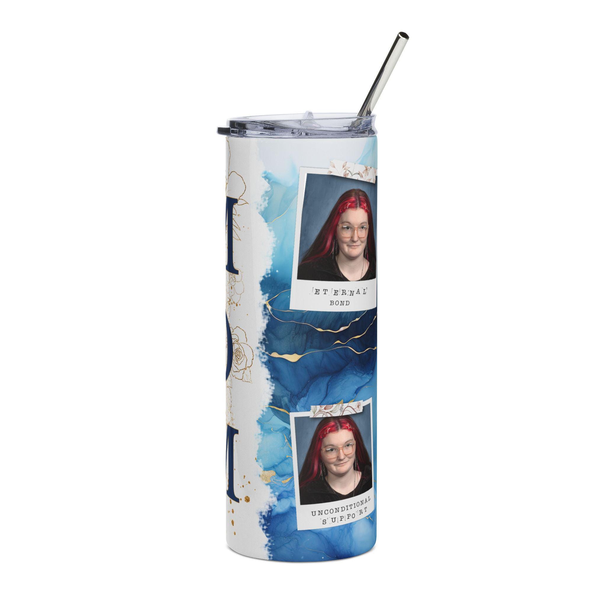 This 20 oz stainless steel tumbler brings a calm, artful presence to everyday routines. Slim and cylindrical, it carries a full 360° printable design that wraps watercolor blues, subtle gold accents, and soft floral linework around the cup. The glossy varnish over a mostly matte surface gives depth to printed photos and lettering, while the included lid and straw make sipping simple whether you’re commuting, running errands, or sitting at your desk. It feels personal — a little gallery of memories and quiet color you can hold on the go.