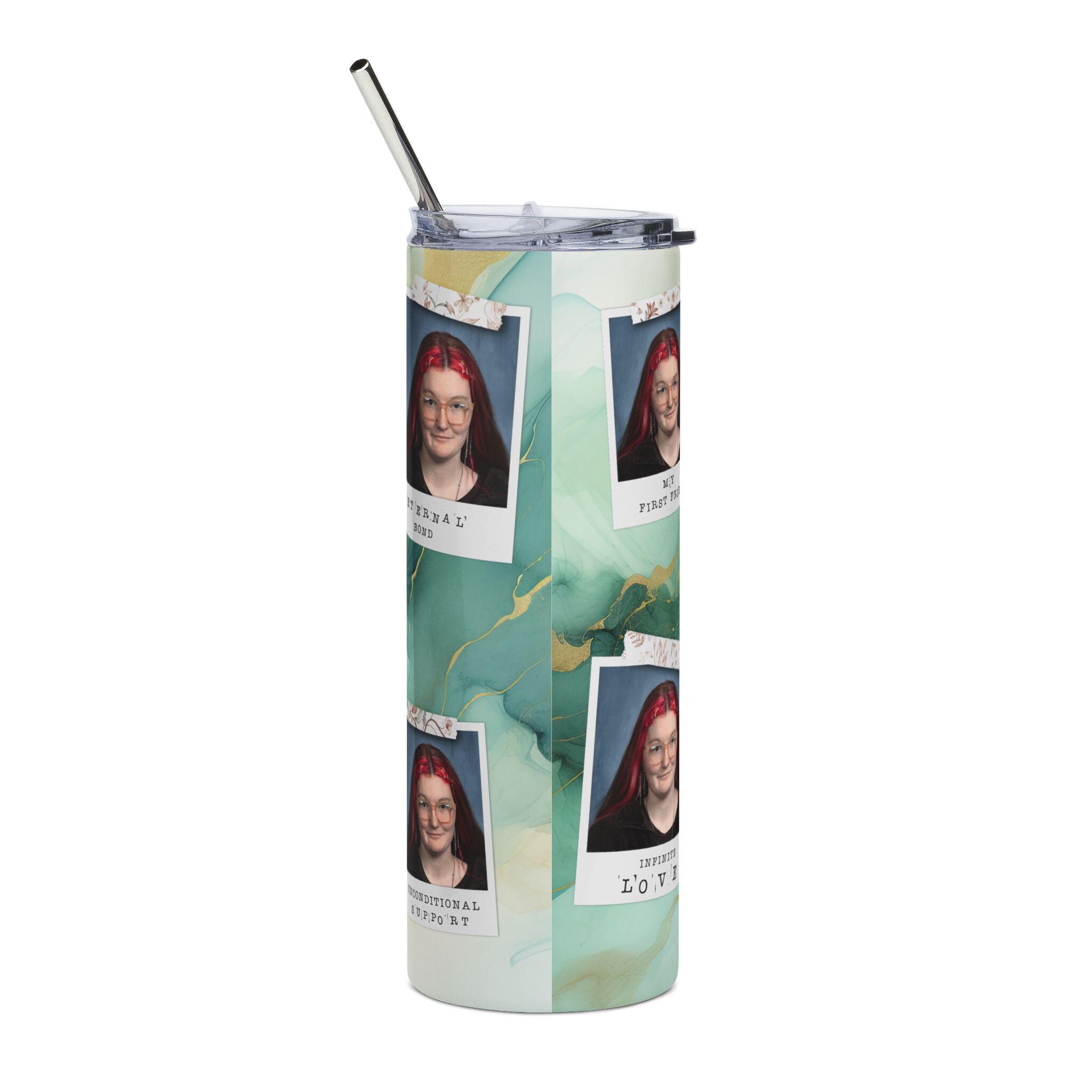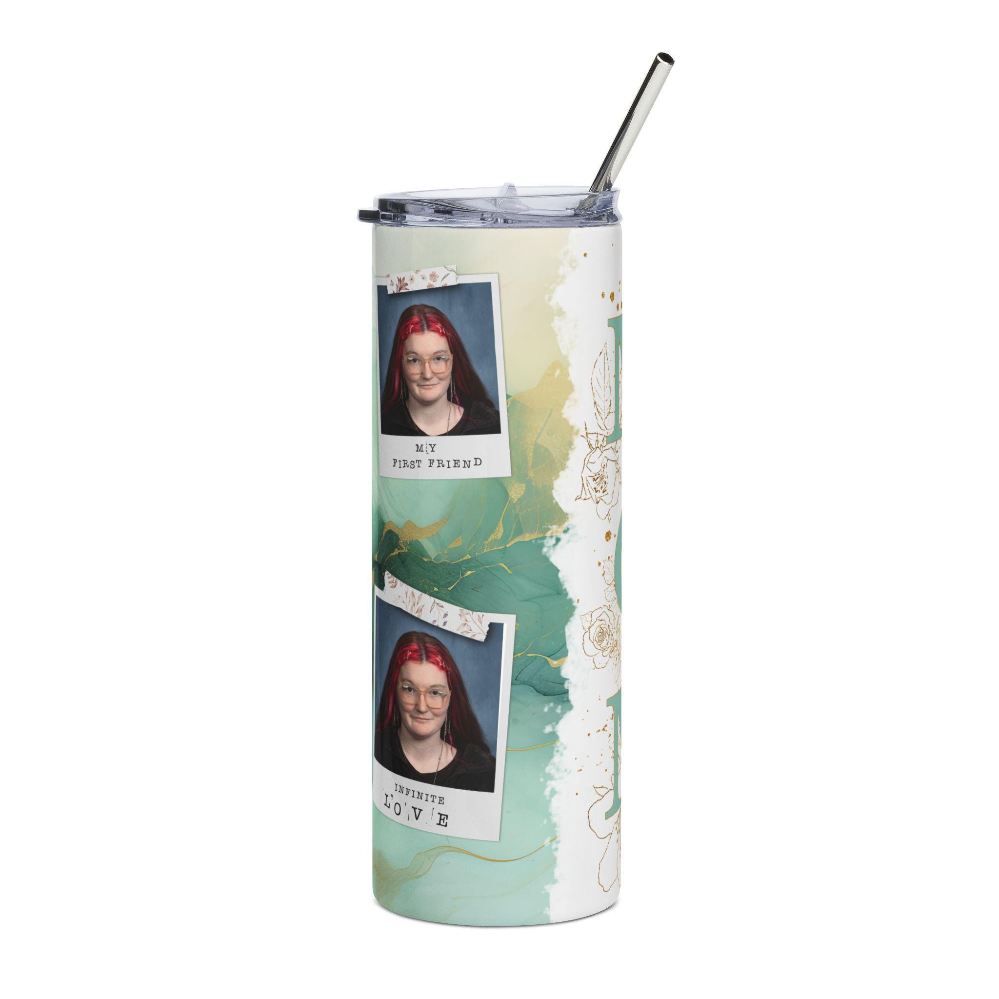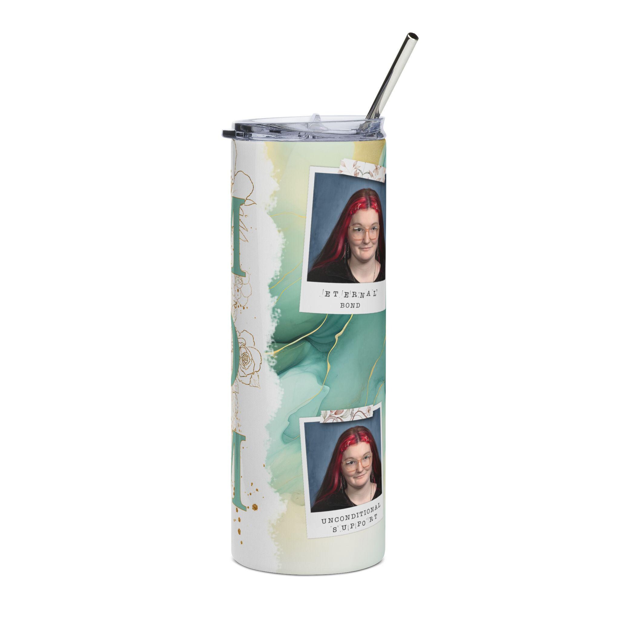 This slim 20 oz stainless steel tumbler brings together thoughtful design and everyday function. Its tall, cylindrical silhouette fits cup holders and stays steady in hand. A glossy protective finish keeps the soft watercolor greens and delicate floral linework vibrant, while the included clear lid and stainless straw make sipping simple and spill-resistant. Whether you’re carrying a morning coffee, iced tea, or a favorite cool drink, the tumbler feels lightweight yet sturdy — a companion for quick errands, desk days, and quiet moments at home. The large printable wrap gives a personalized, sentimental touch for someone who cherishes subtle florals and soft mint tones.